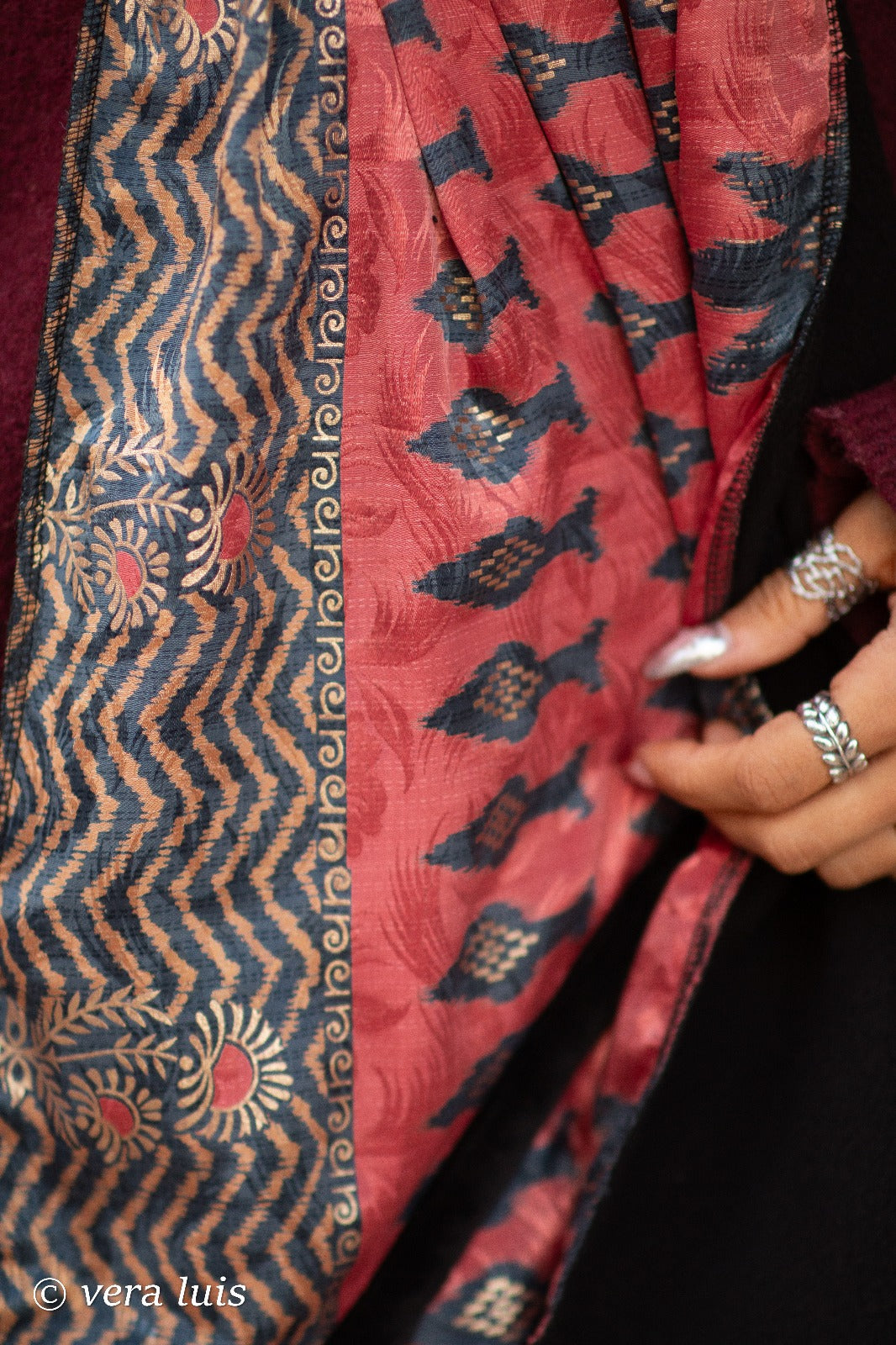 Os saris, tecidos de seda, são cuidadosamente escolhidos um a um. Os seus padrões são únicos e irrepetíveis, o que faz de cada peca única.