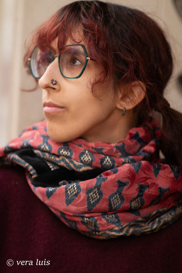 Este cachecol nasceu da fusão cuidadosa de diferentes tecidos, escolhidos uma um com intenção e carinho.