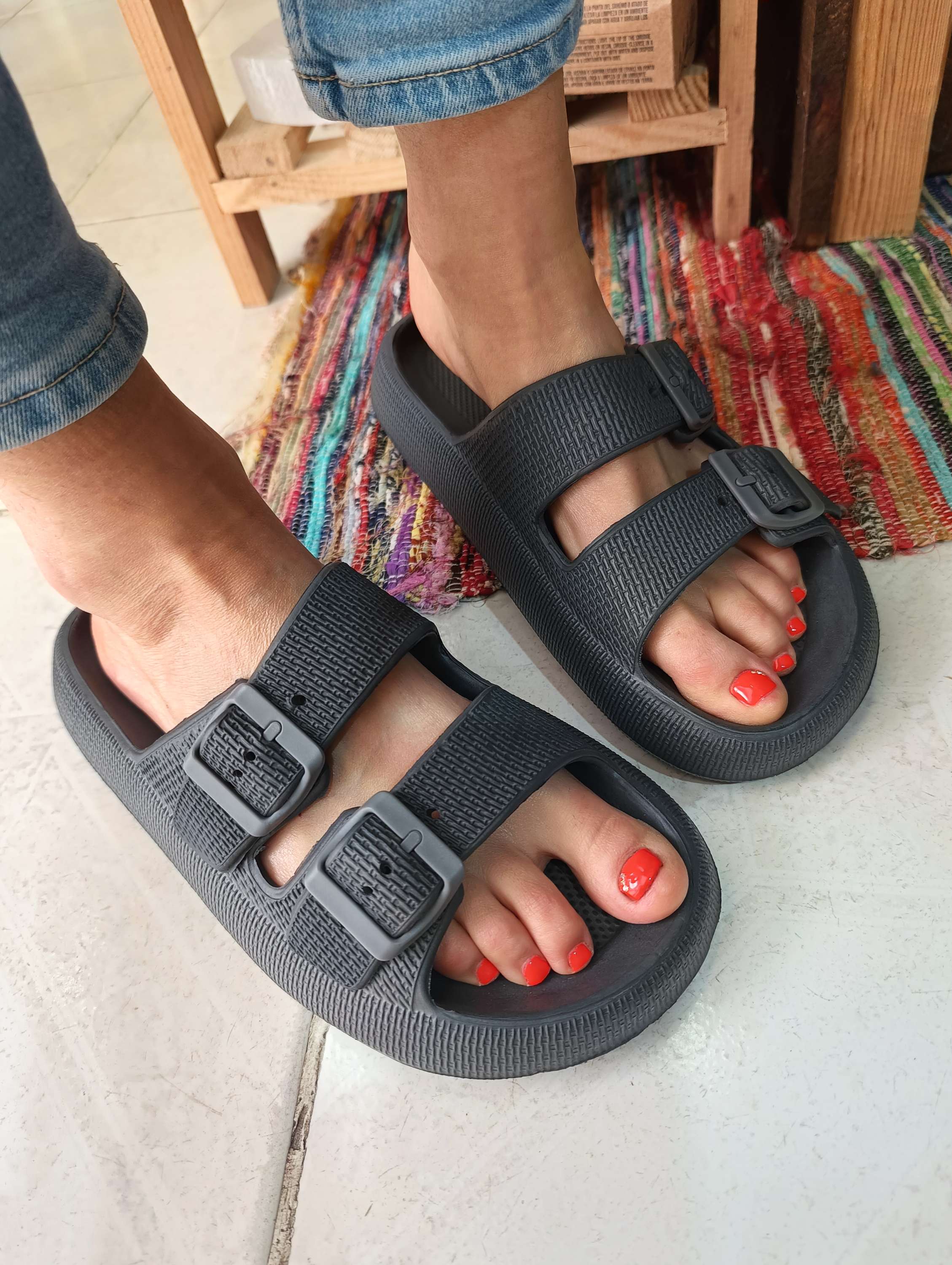 Sandálias de borracha práticas e confortáveis, ideais para o dia-a-dia nos meses mais quentes.