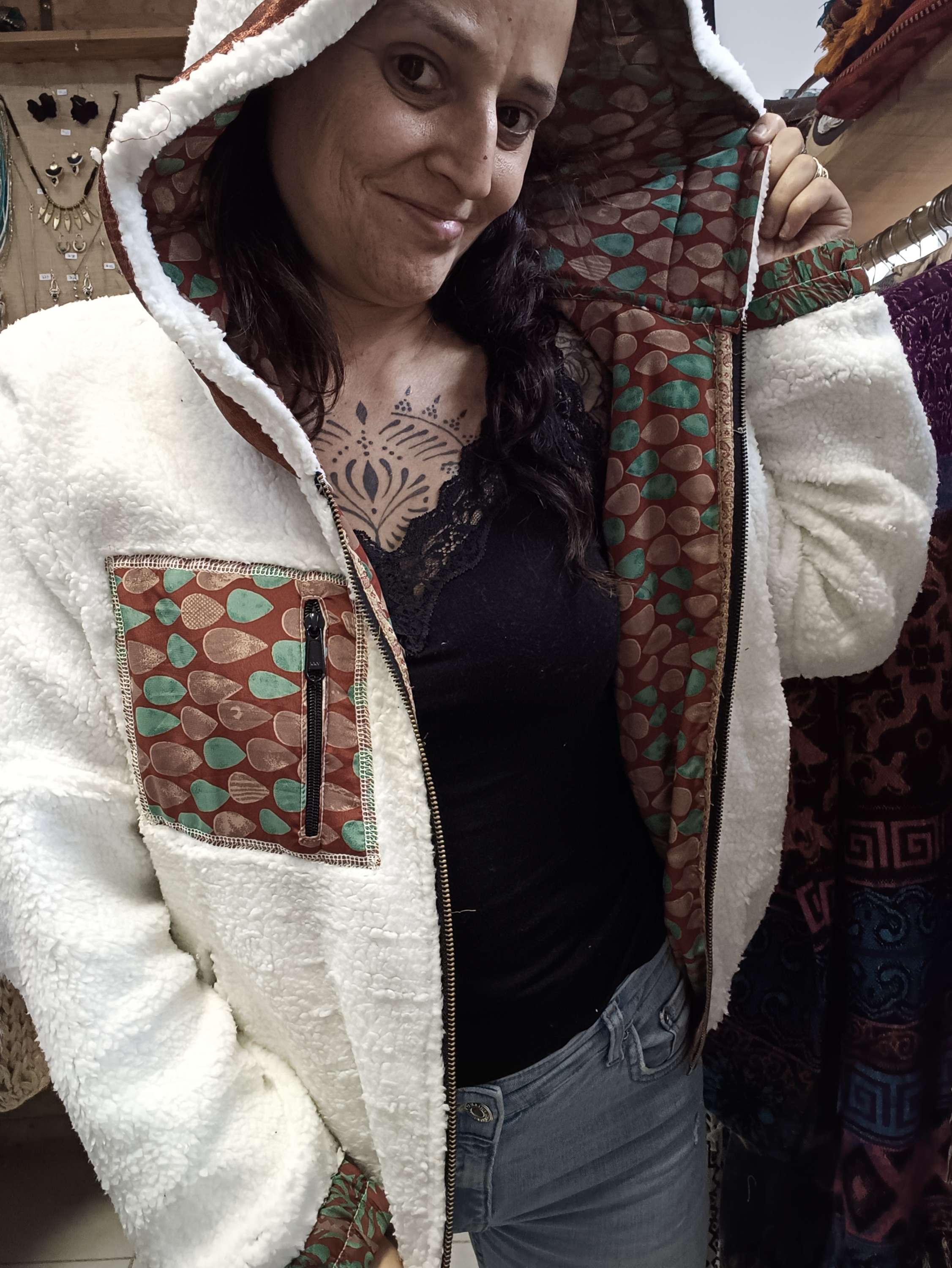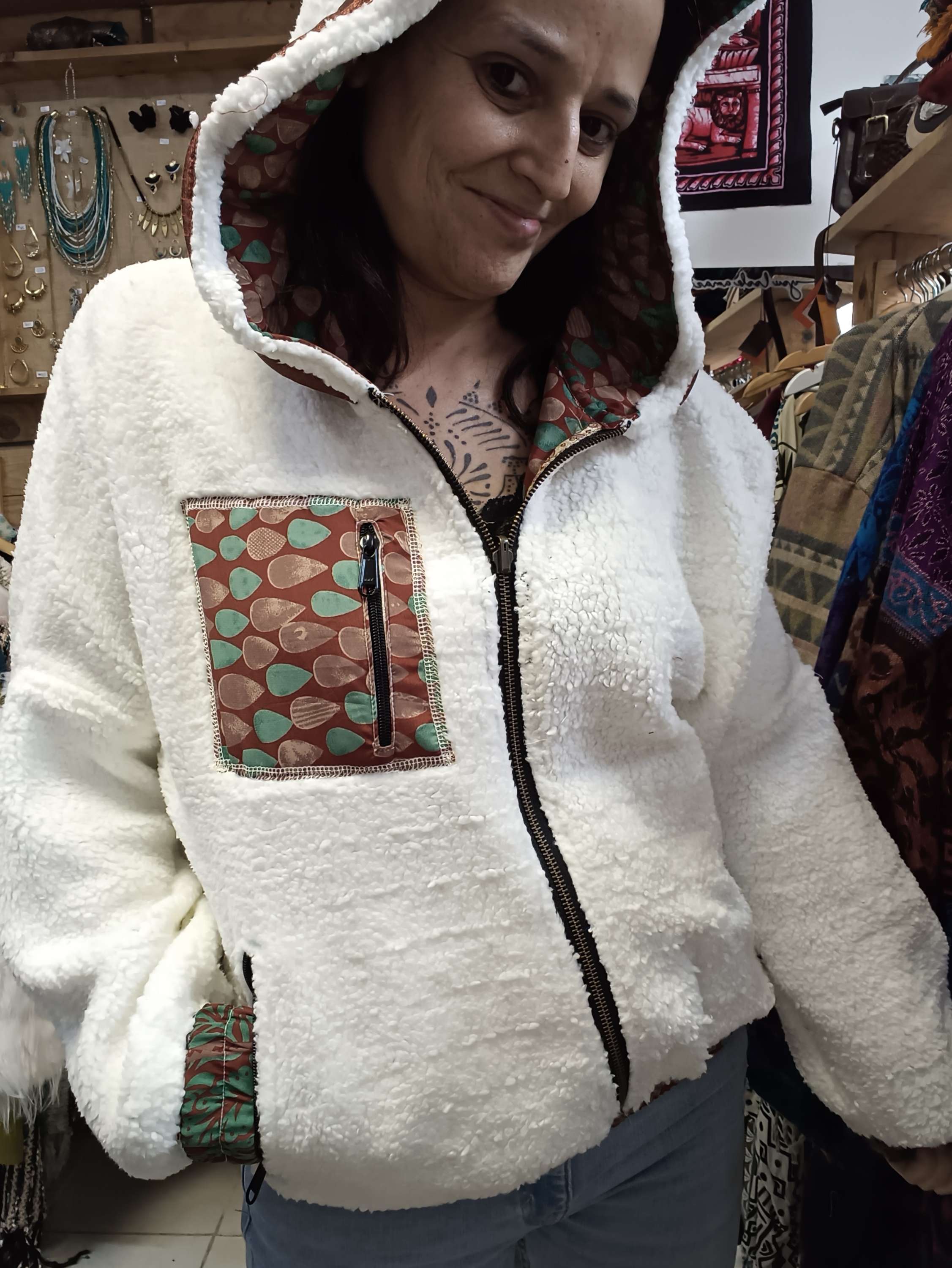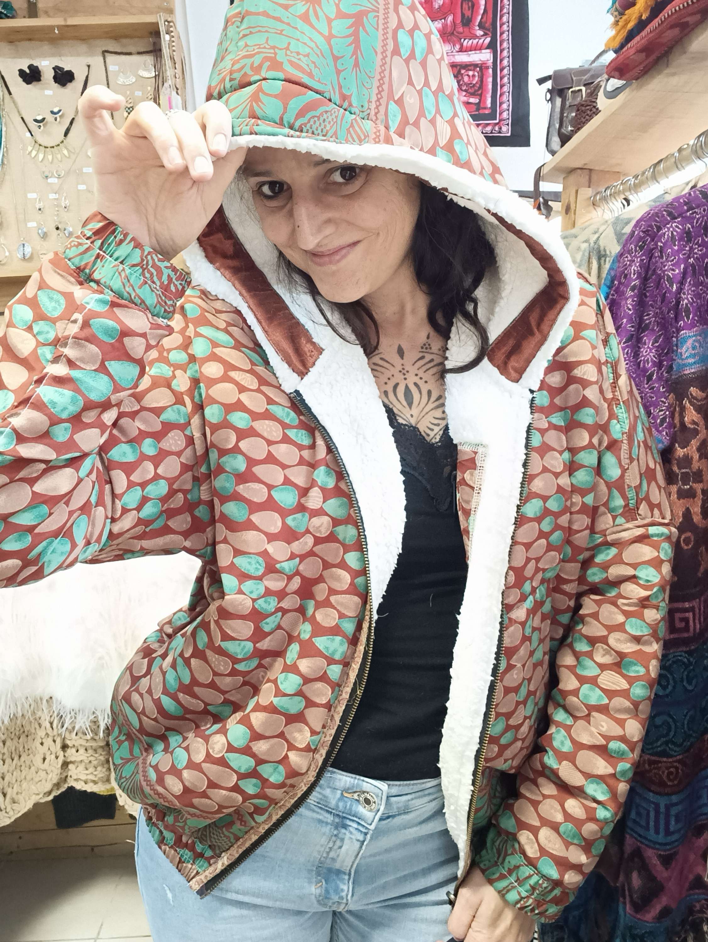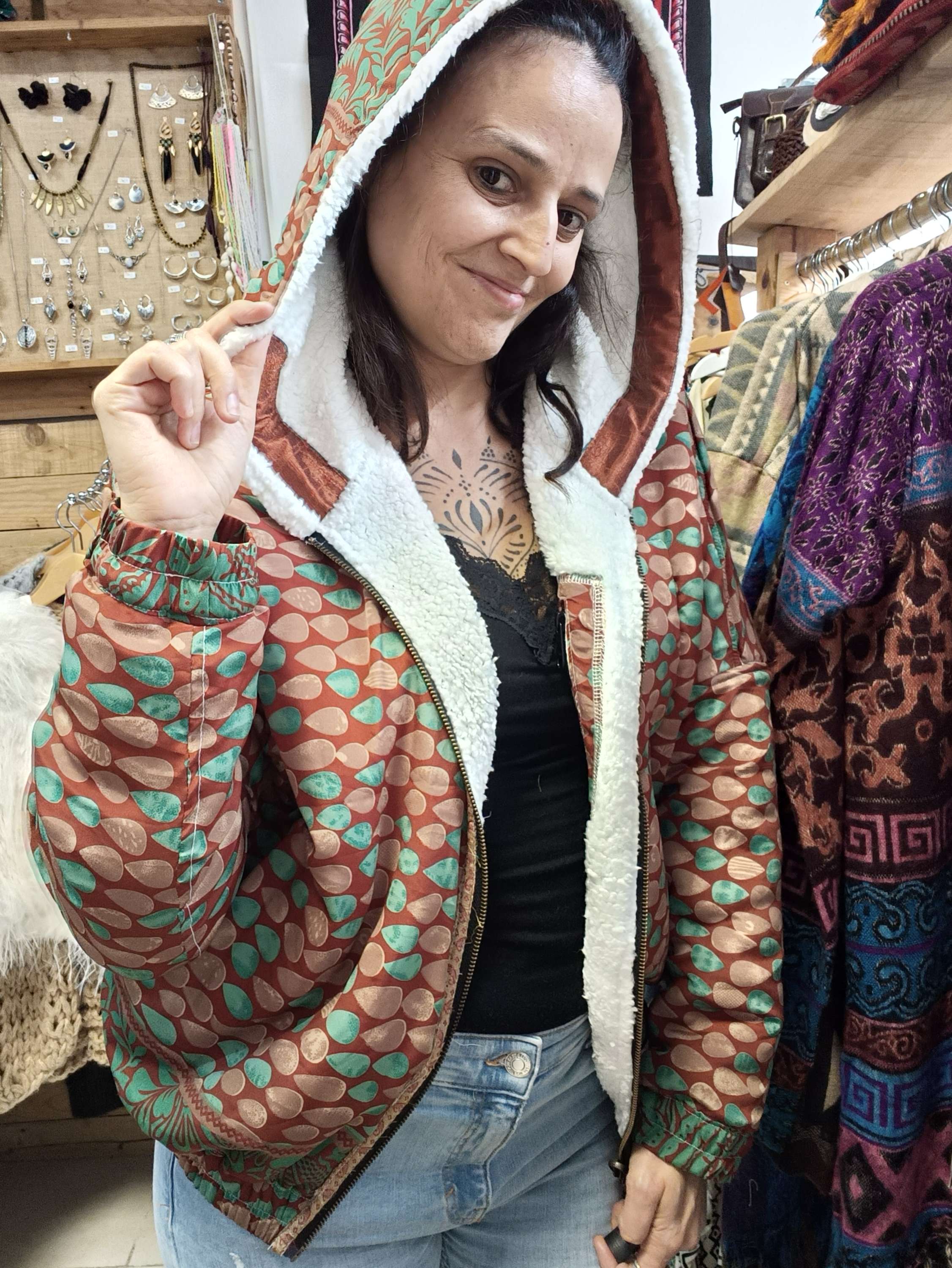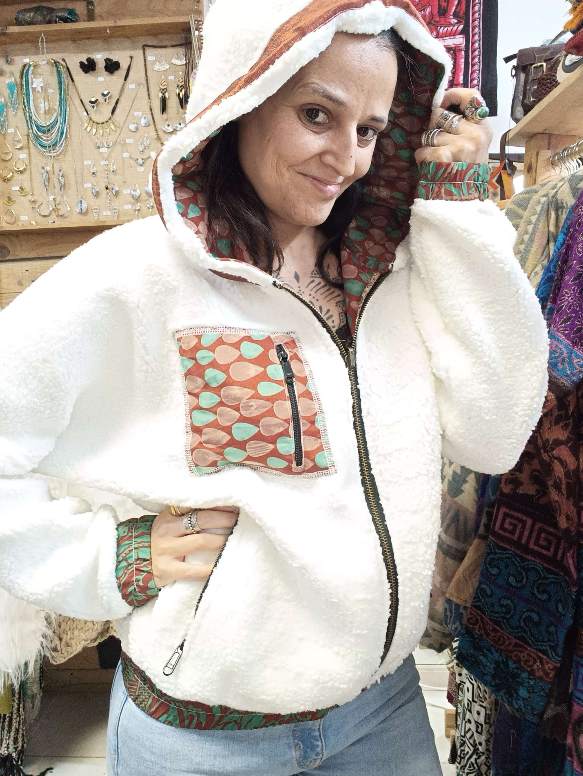 Este casaco é reversível, um dia podes usa-lo, com a parte colorida do sari para o exterior e outro dia, podes usar a sua parte mais neutra!