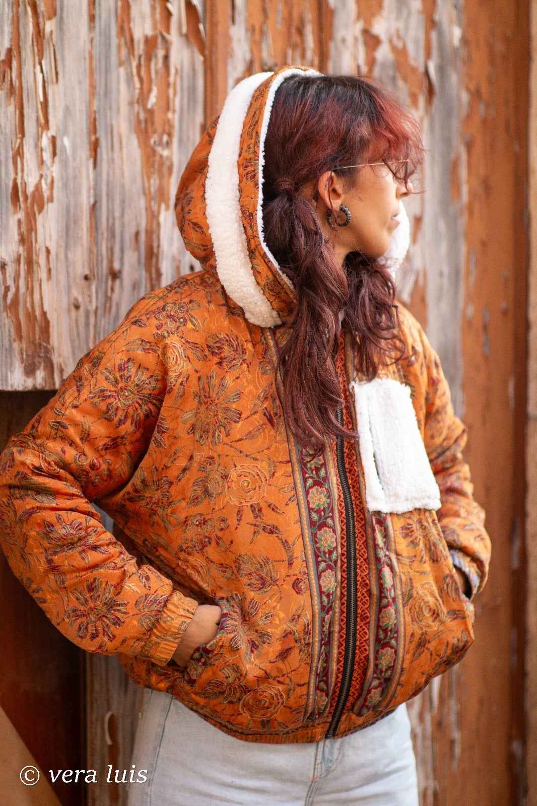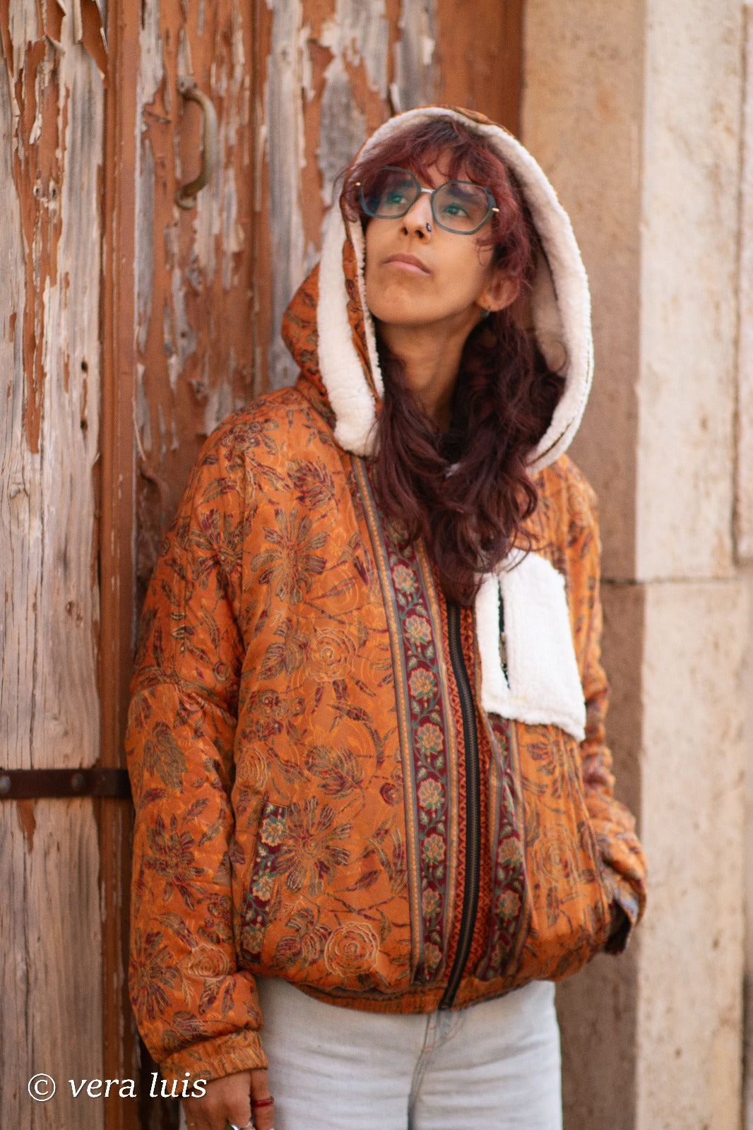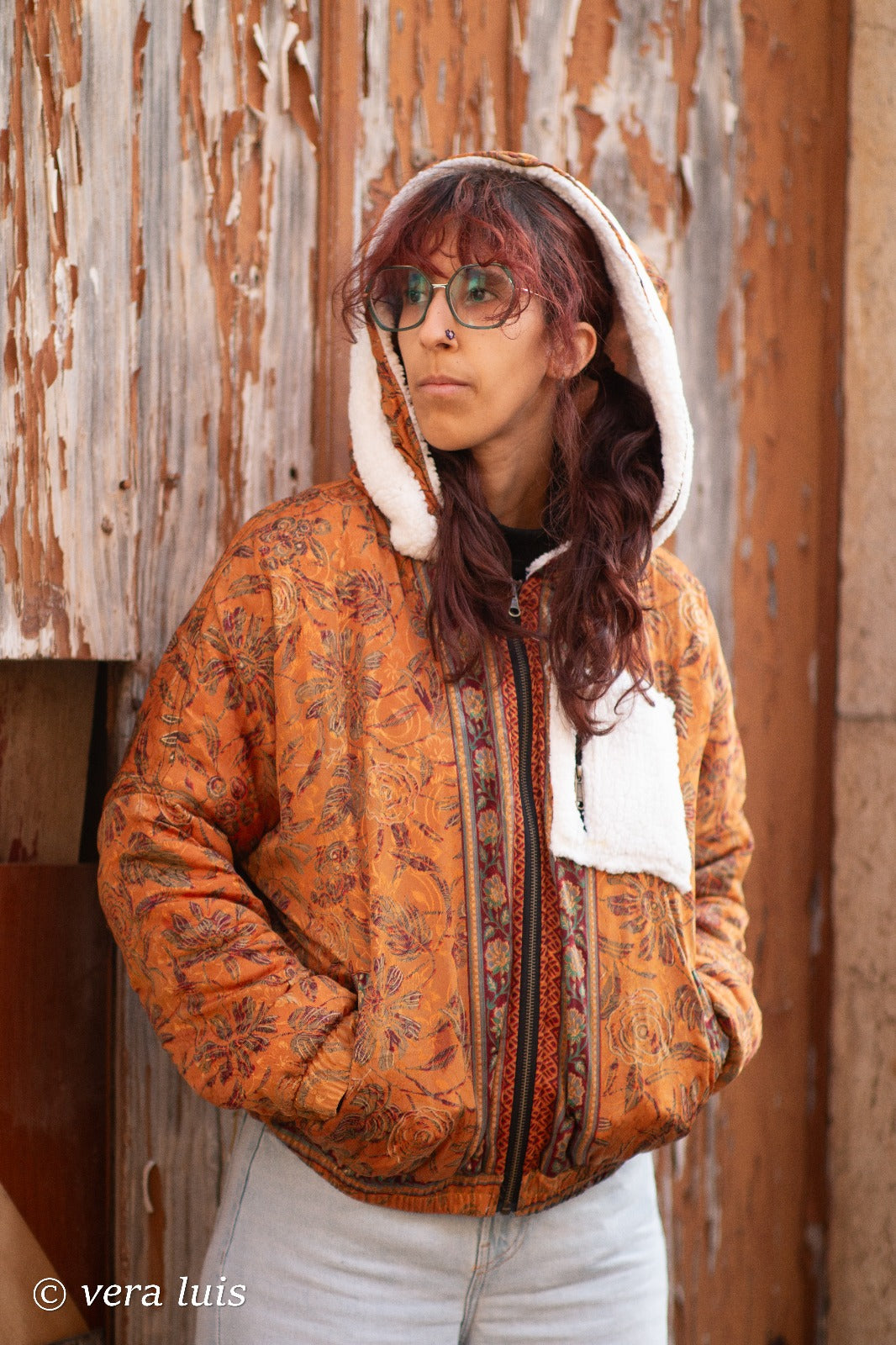 Este casaco é reversível, um dia podes usa-lo, com a parte colorida do sari para o exterior e outro dia, podes usar a sua parte mais neutra!
