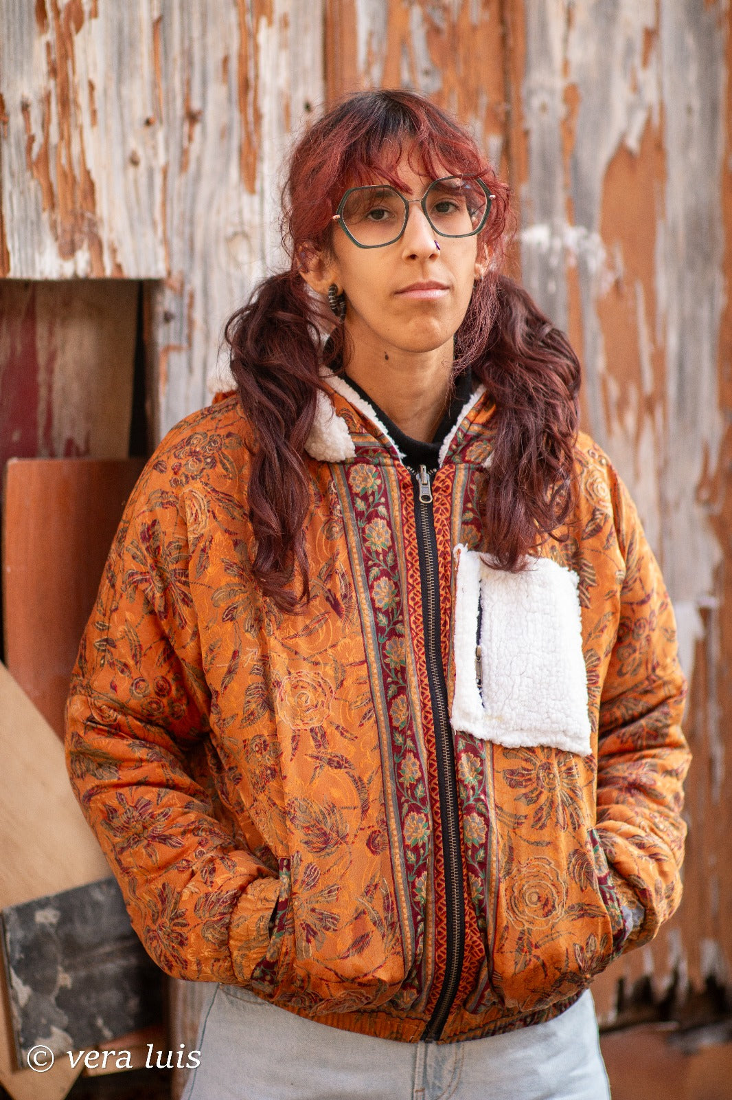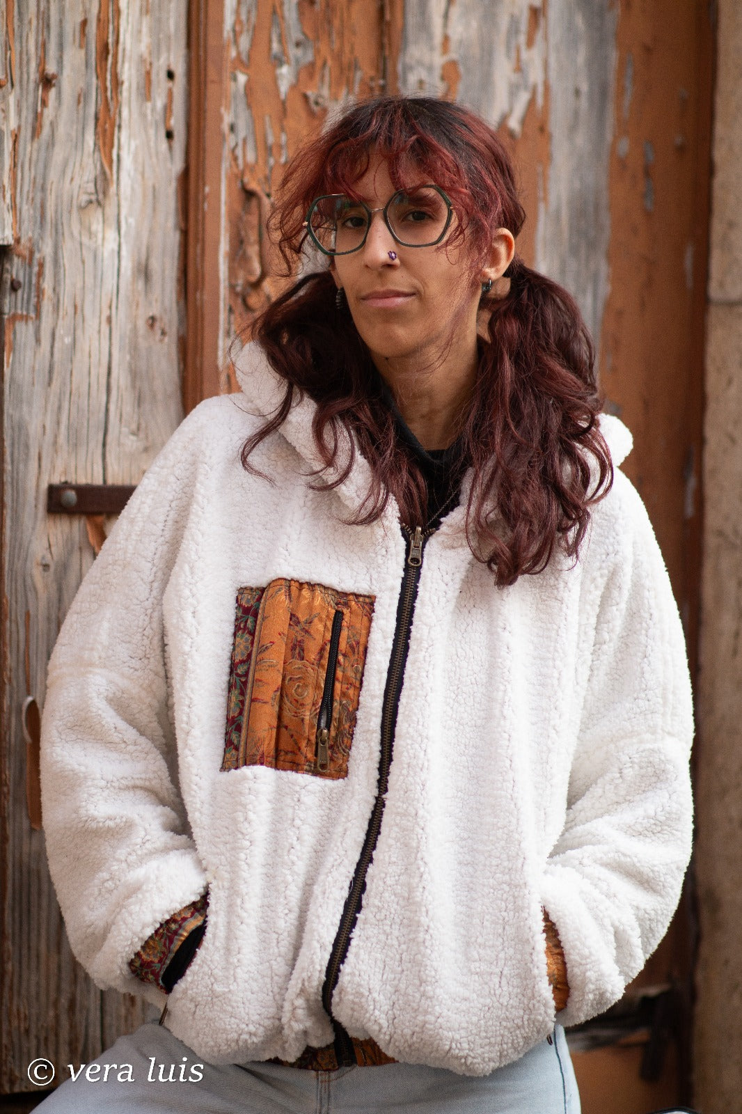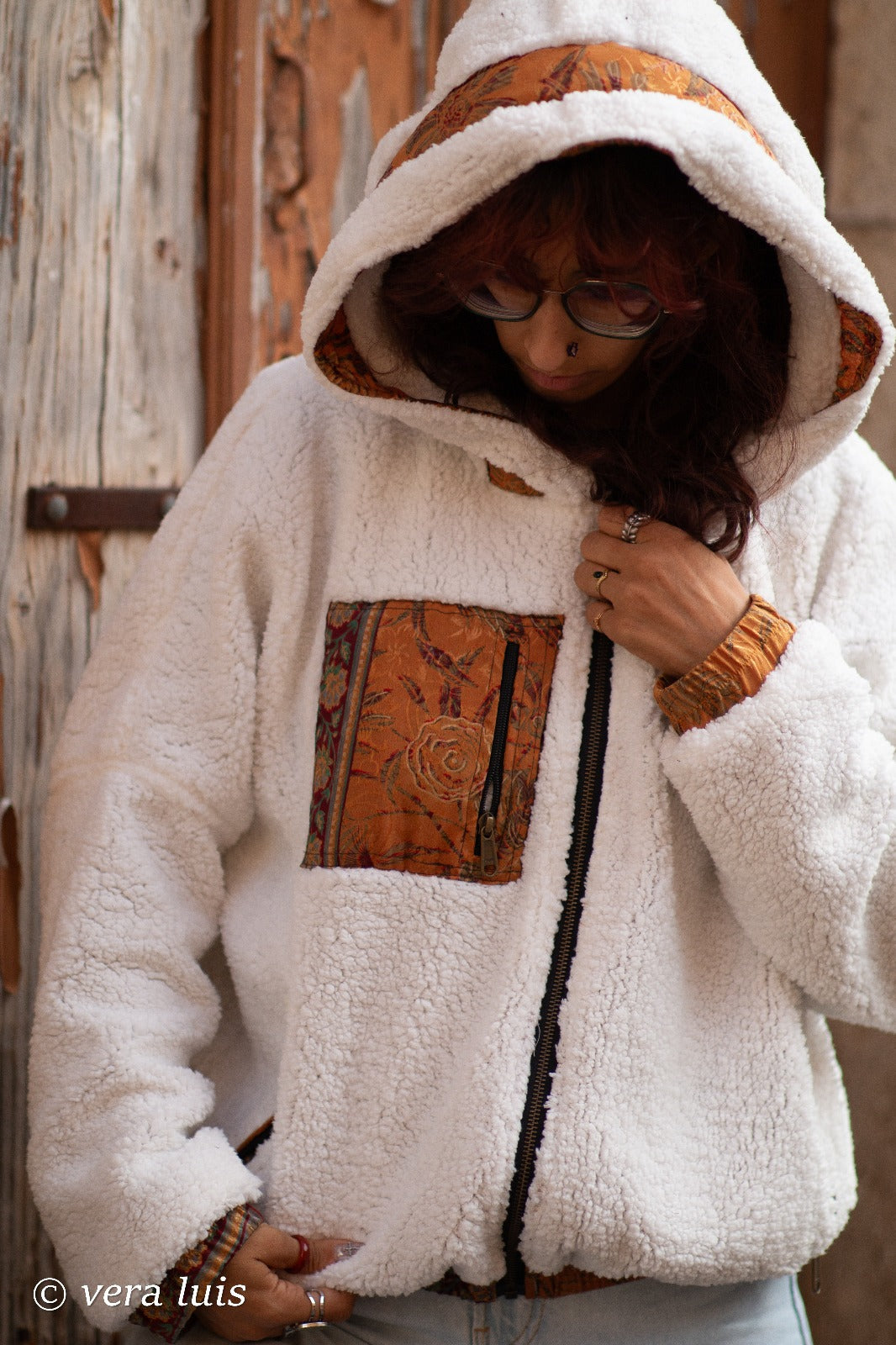 Este casaco é reversível, um dia podes usa-lo, com a parte colorida do sari para o exterior e outro dia, podes usar a sua parte mais neutra!