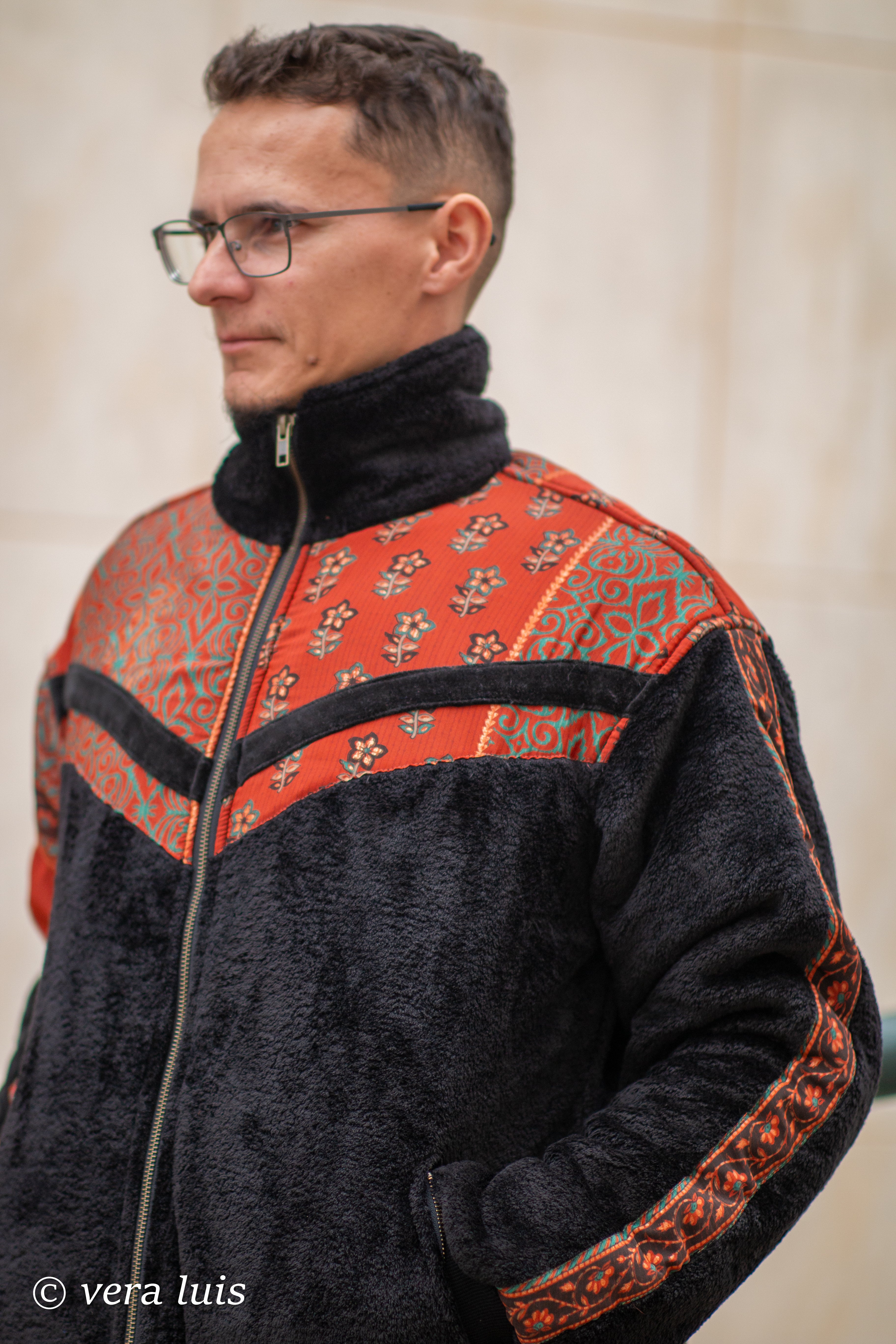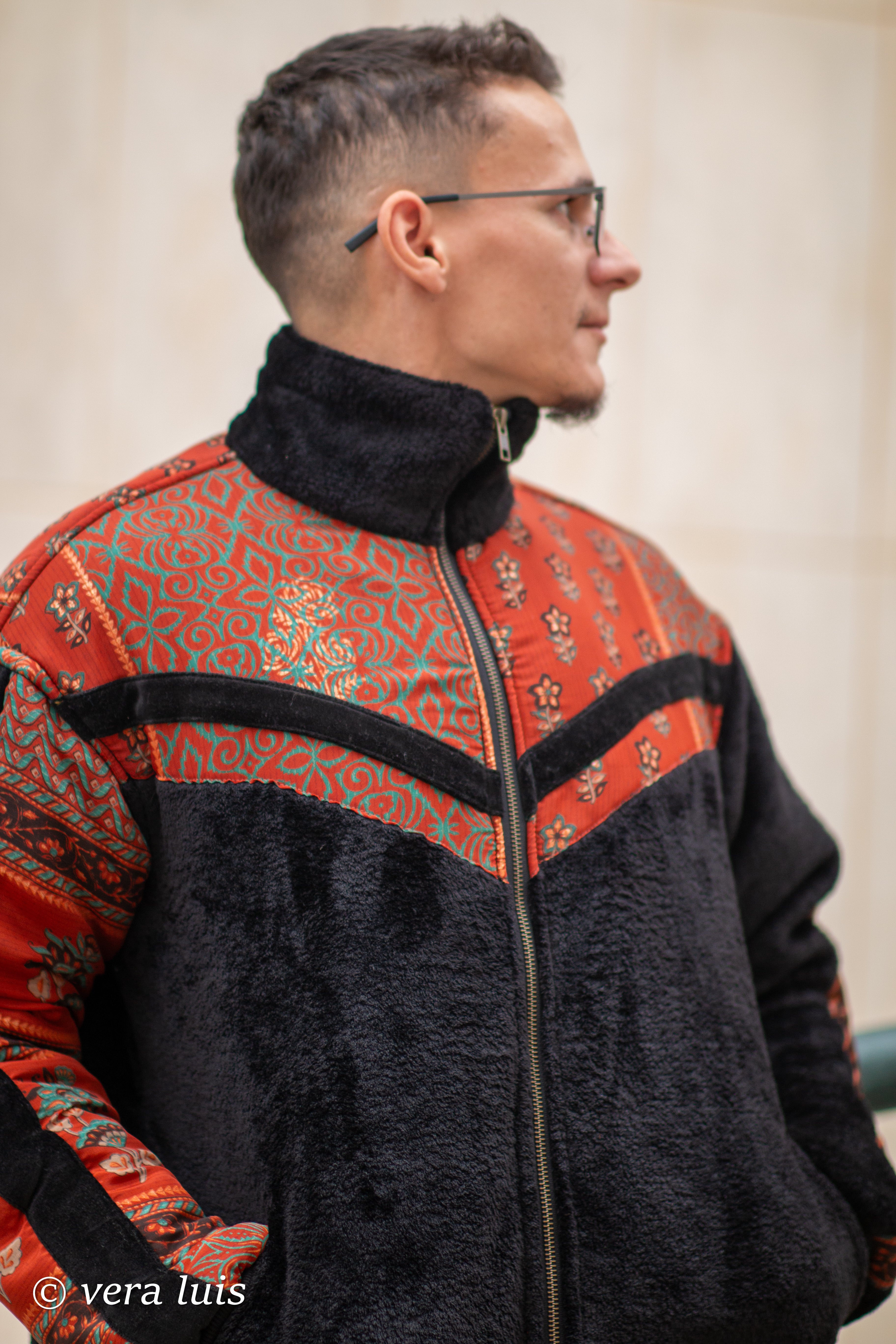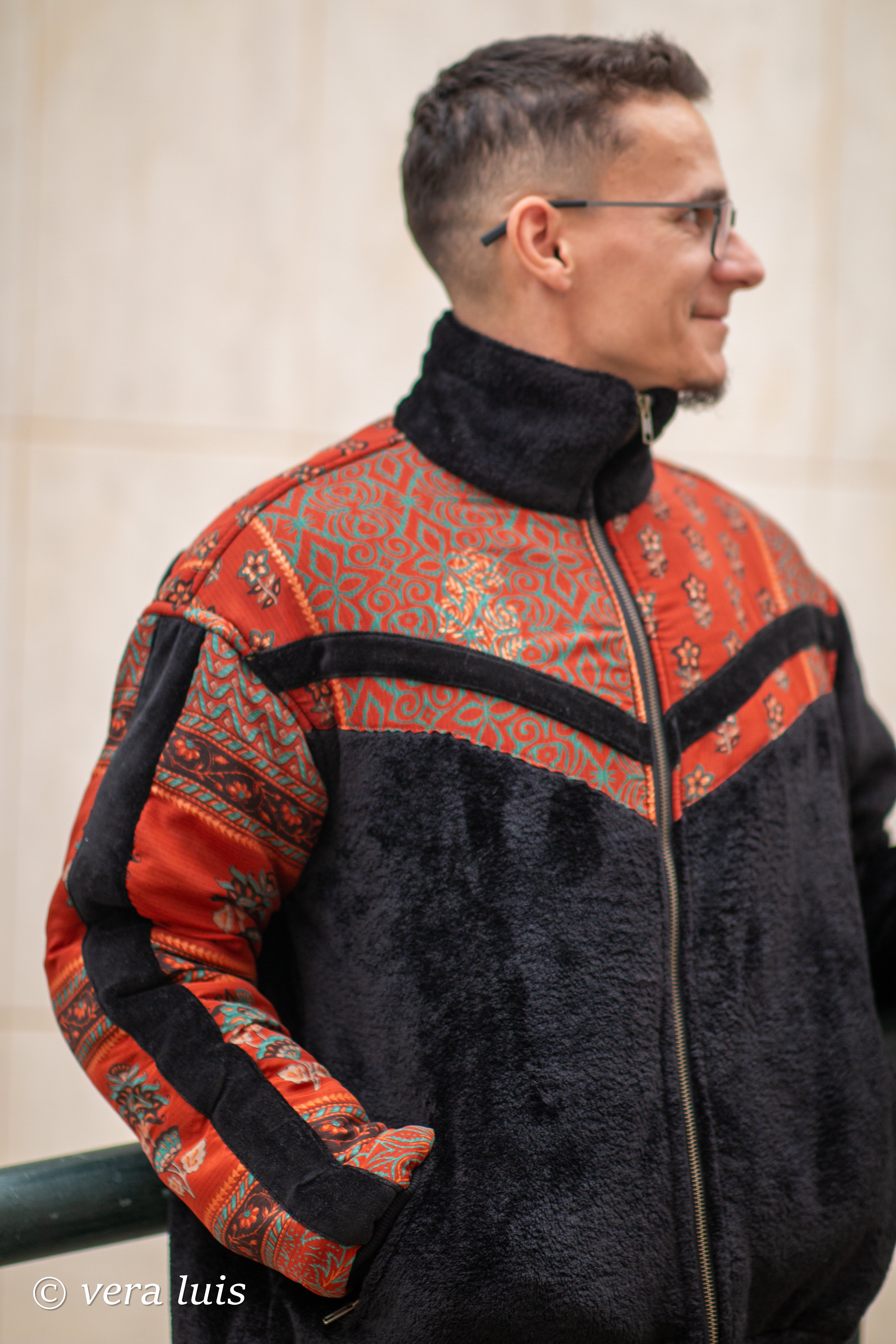Este casaco é o resultado da fusão de diferentes tecidos que escolhi.