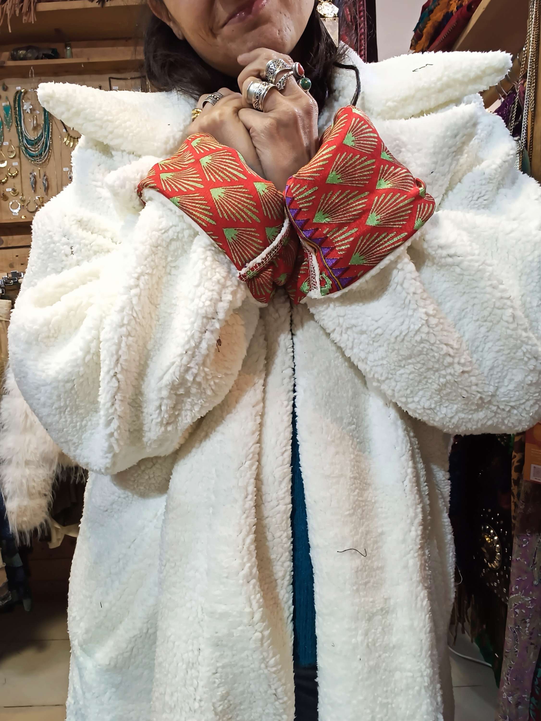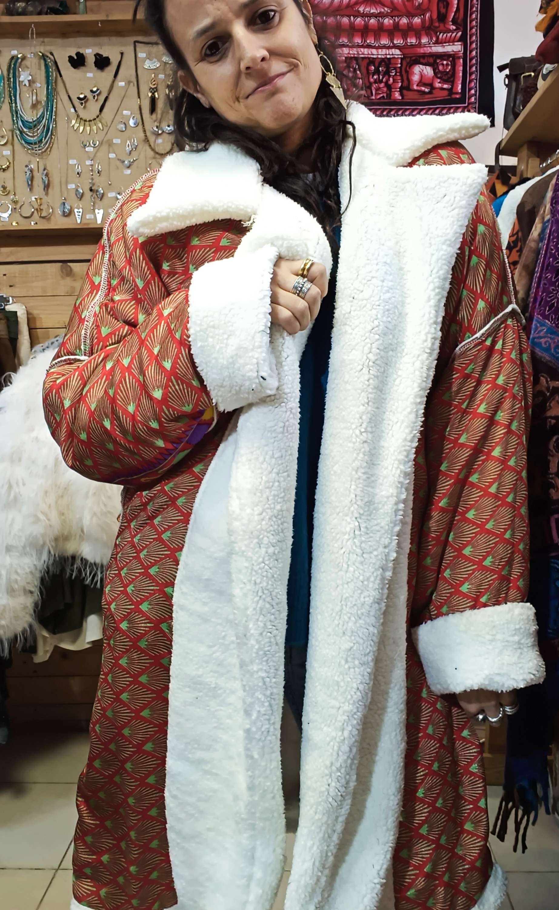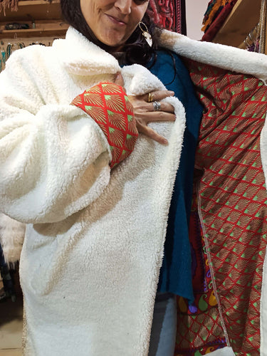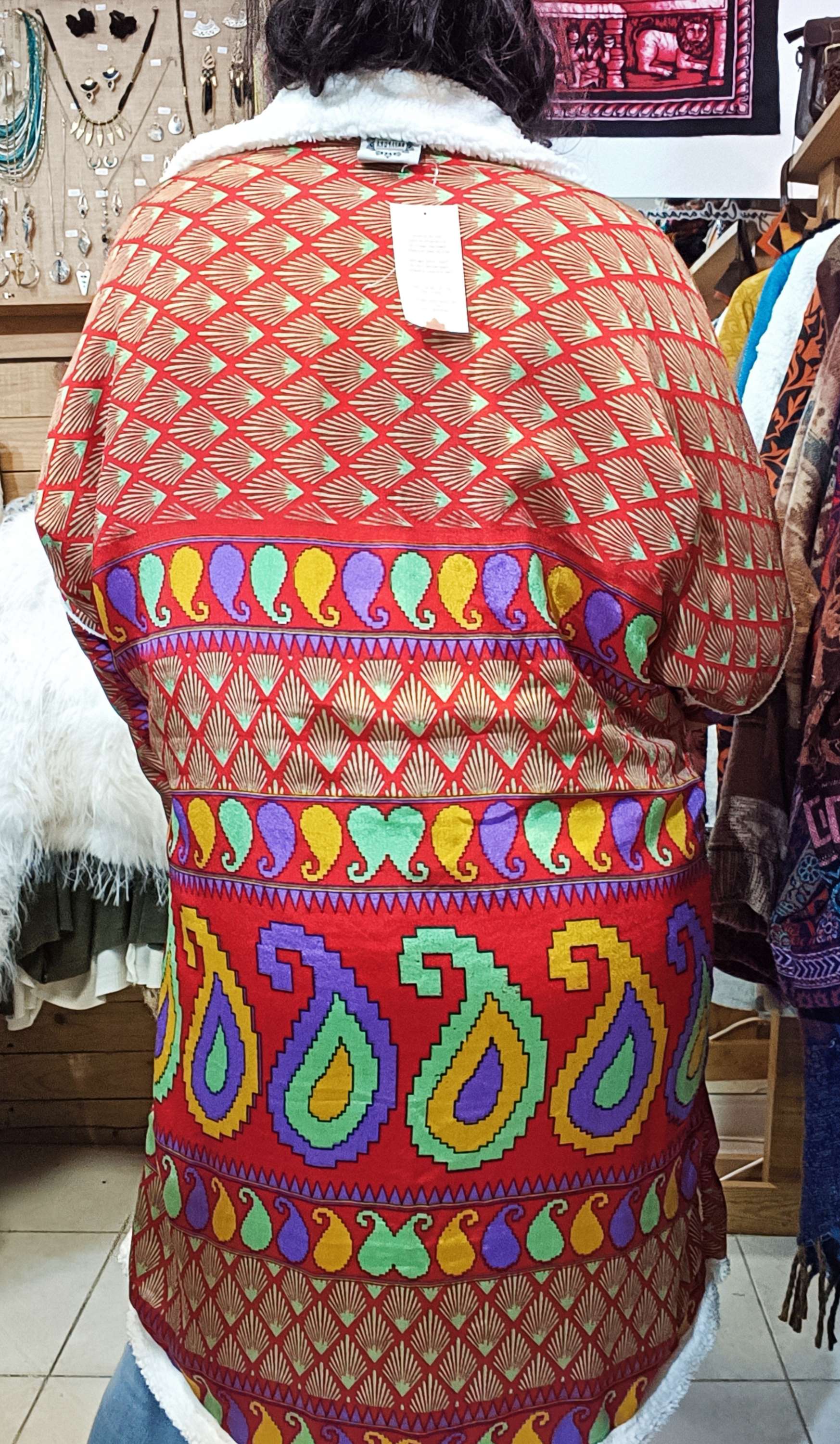 Um lado em fleece polar macio e quente, perfeito para dias frios, enquanto o outro lado apresenta um tecido em seda autêntico com padrões étnicos vibrantes.