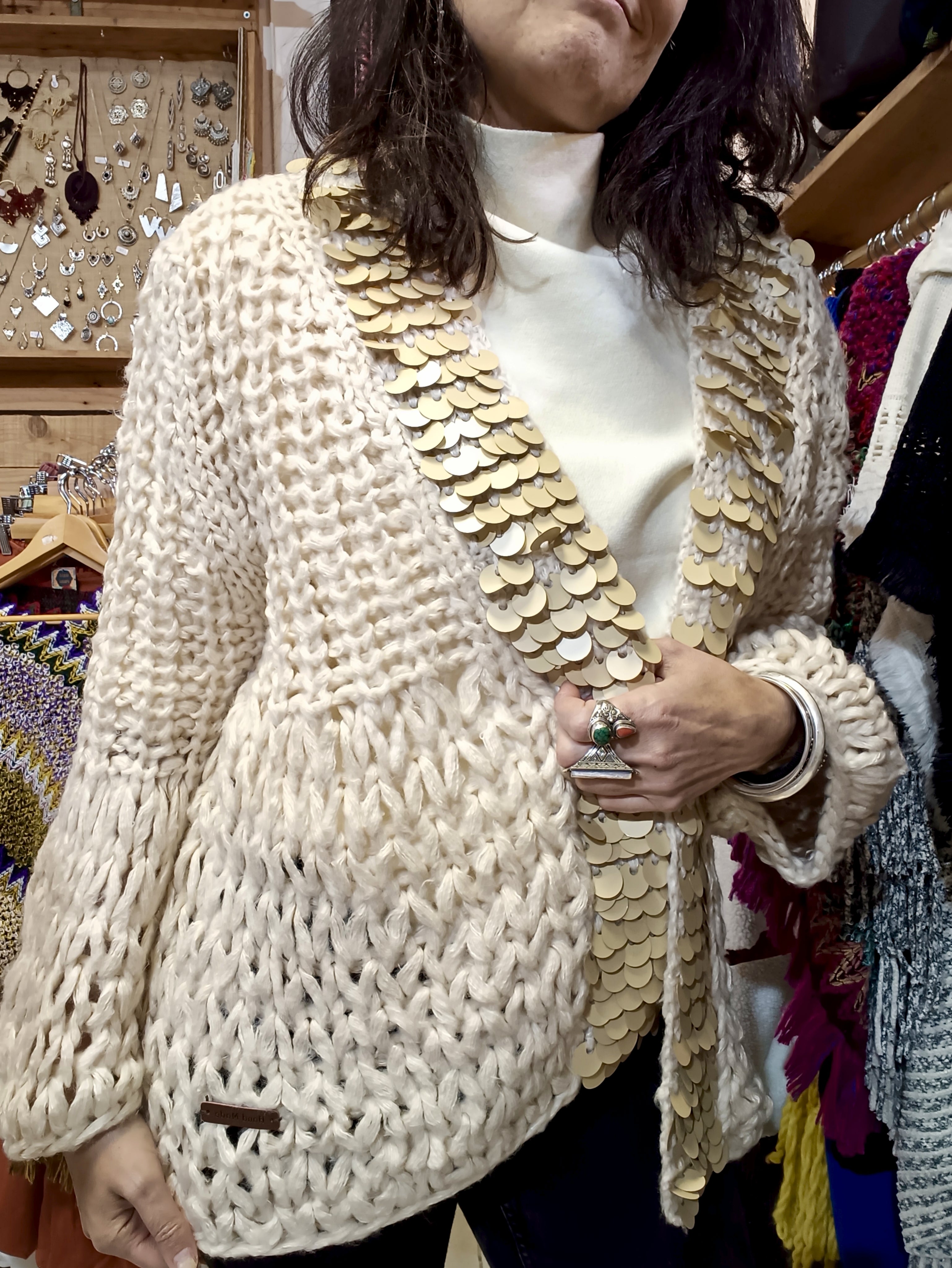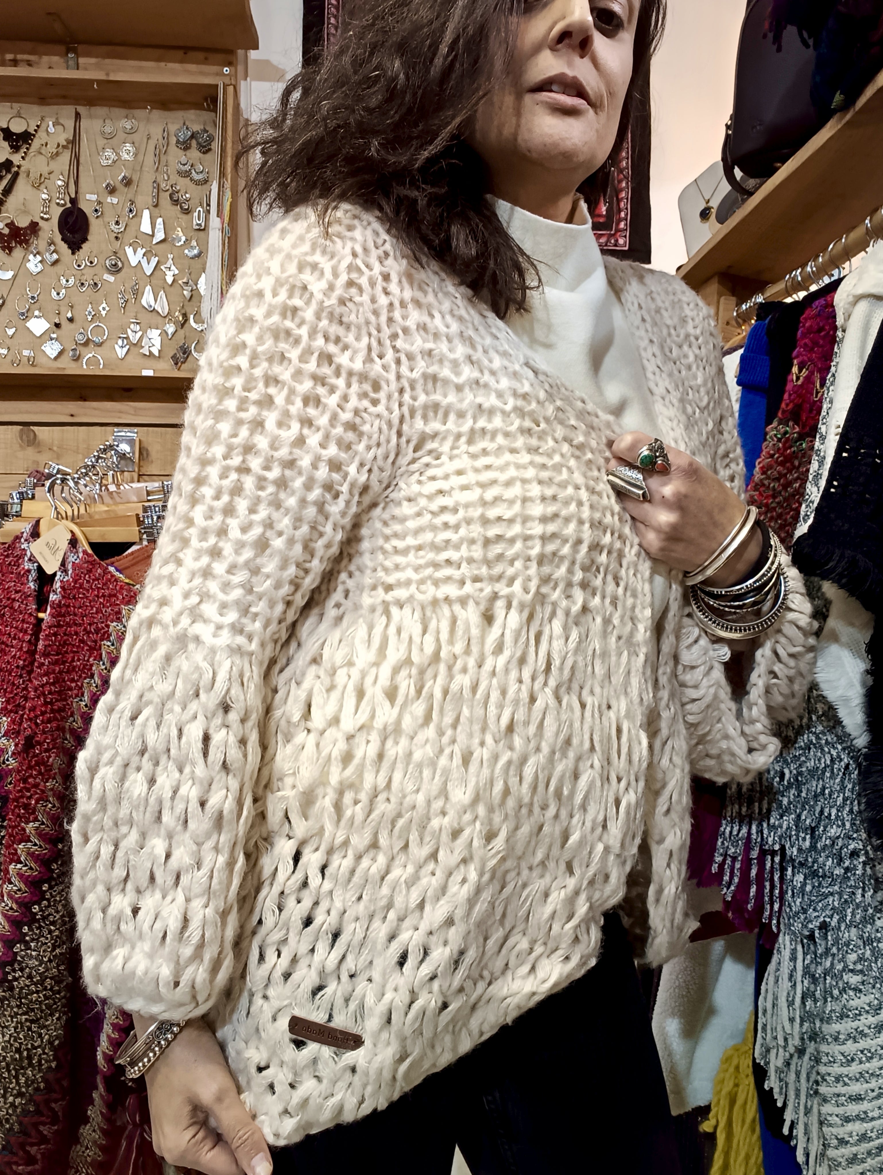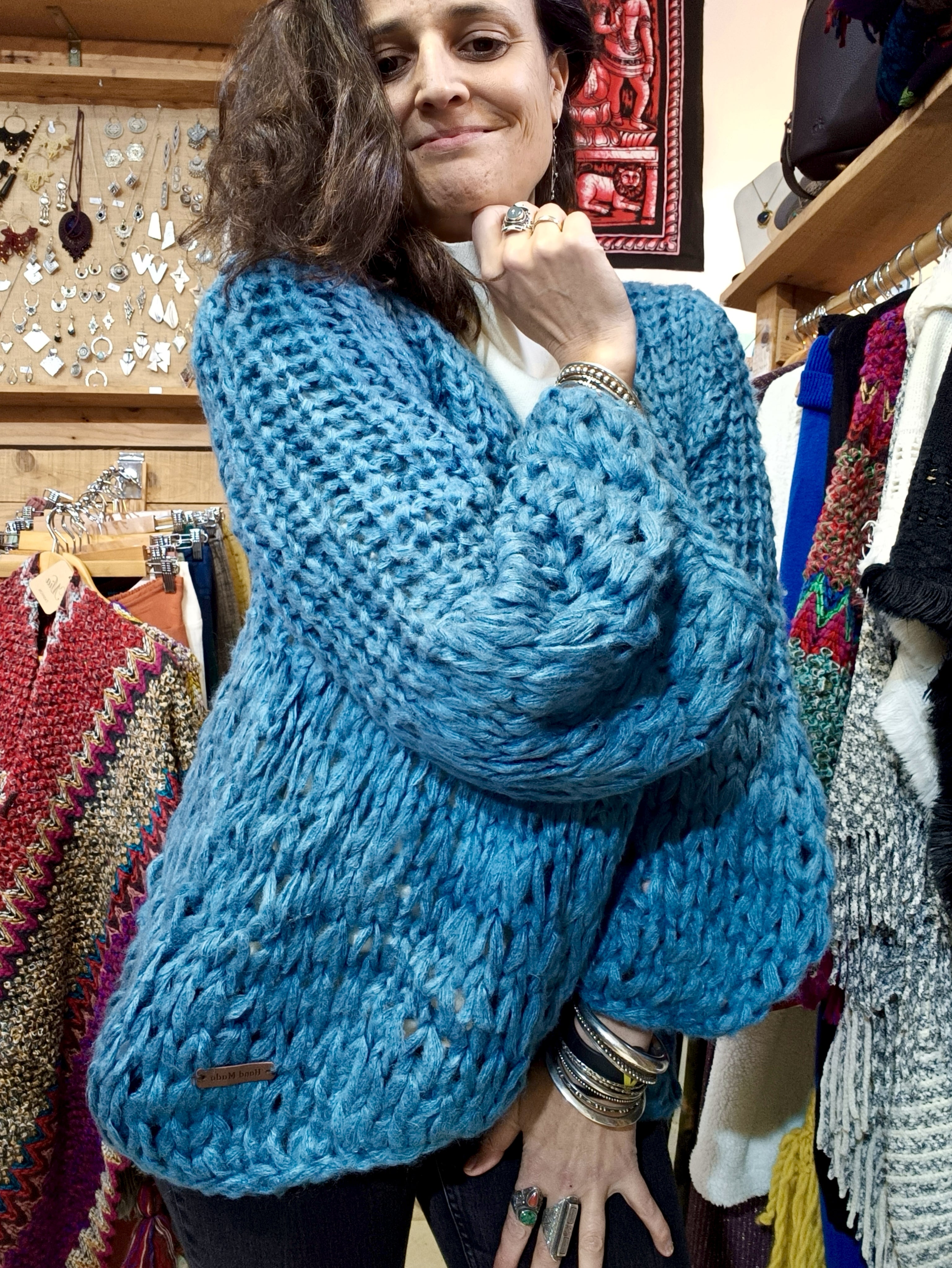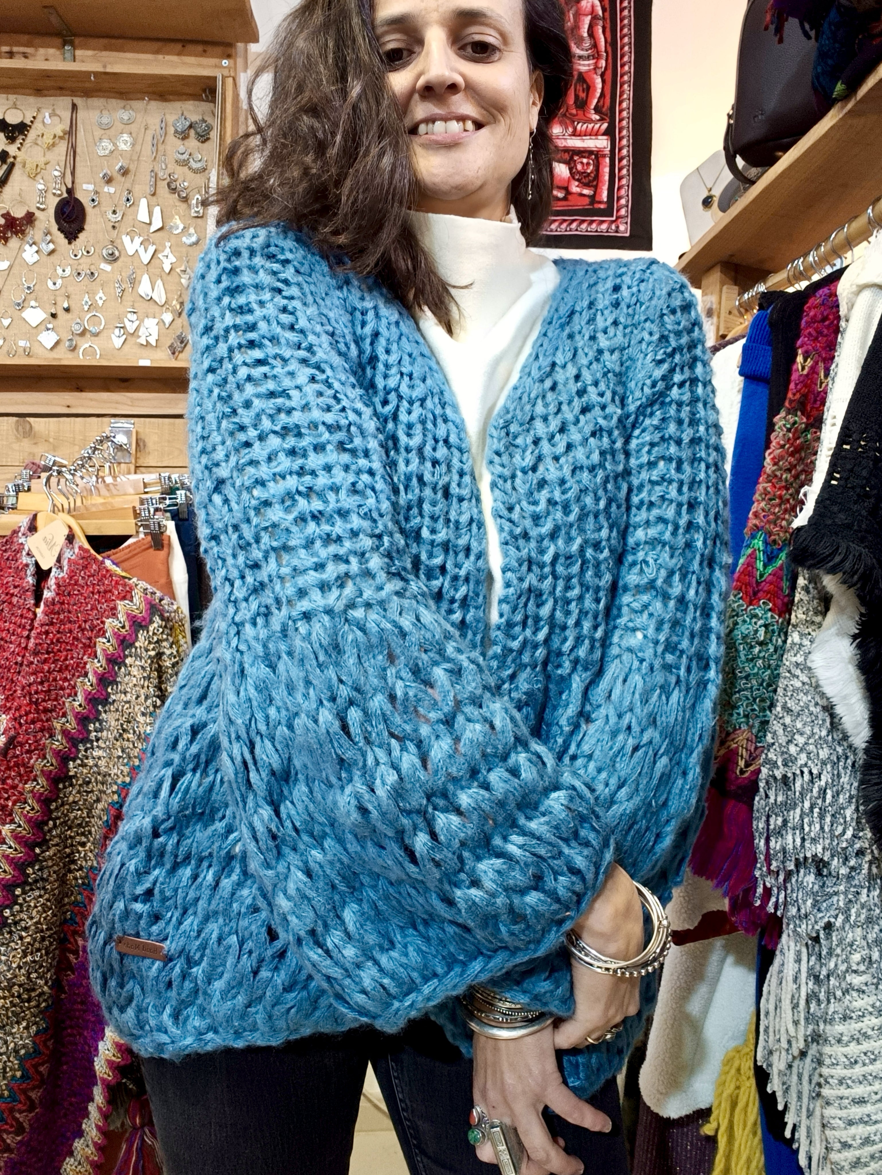 Casaco versátil em blend de lã e acrílico, corte único que se adapta a diferentes silhuetas.