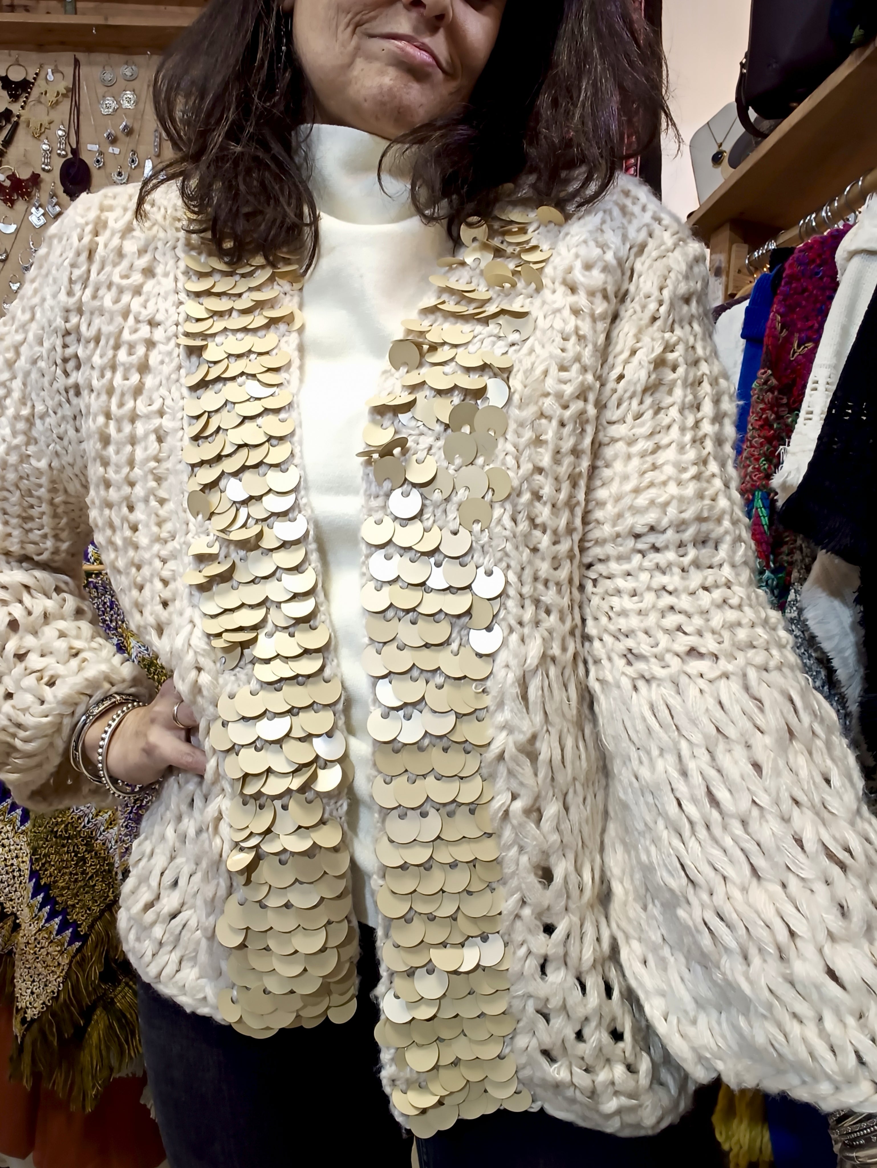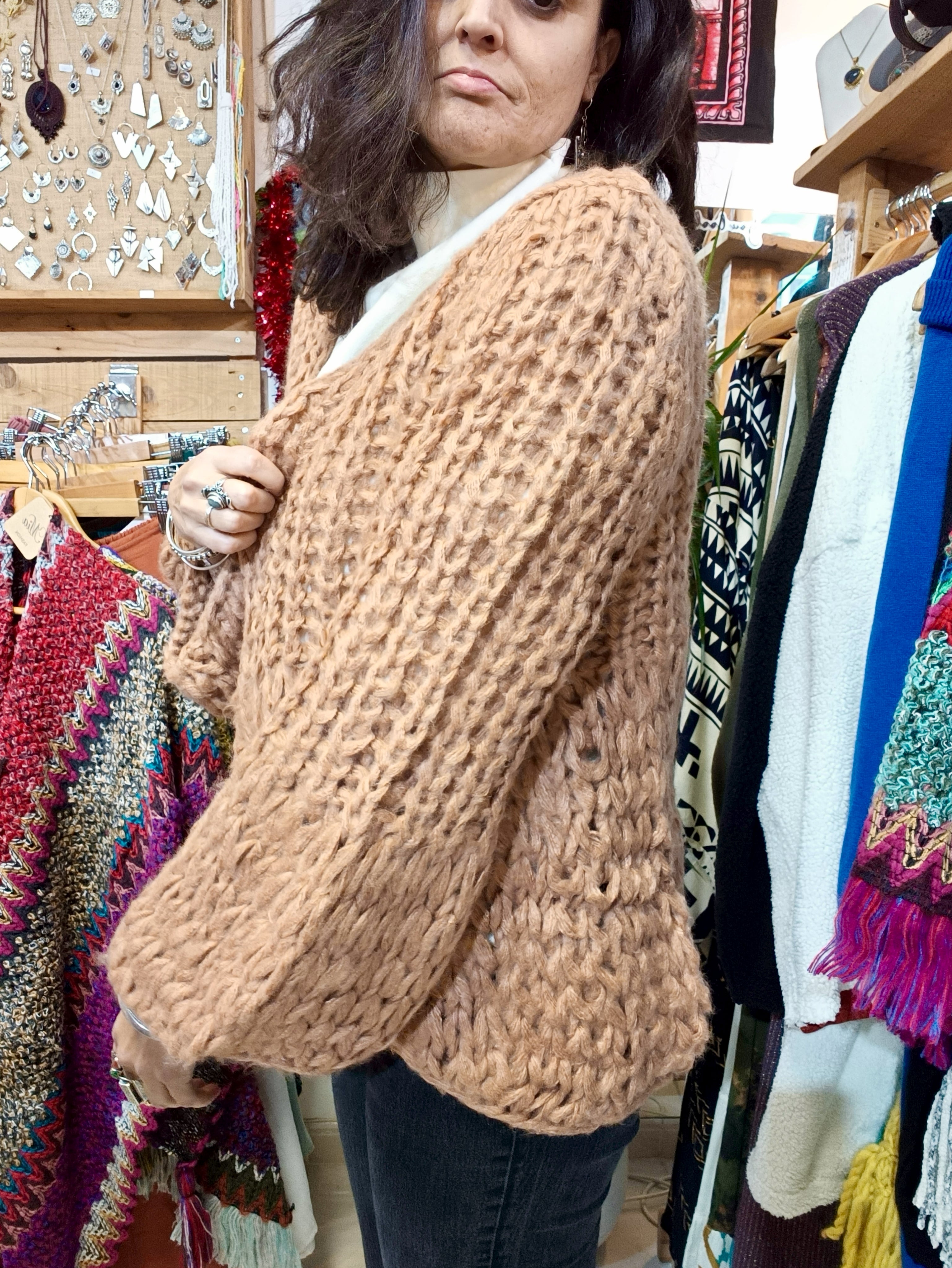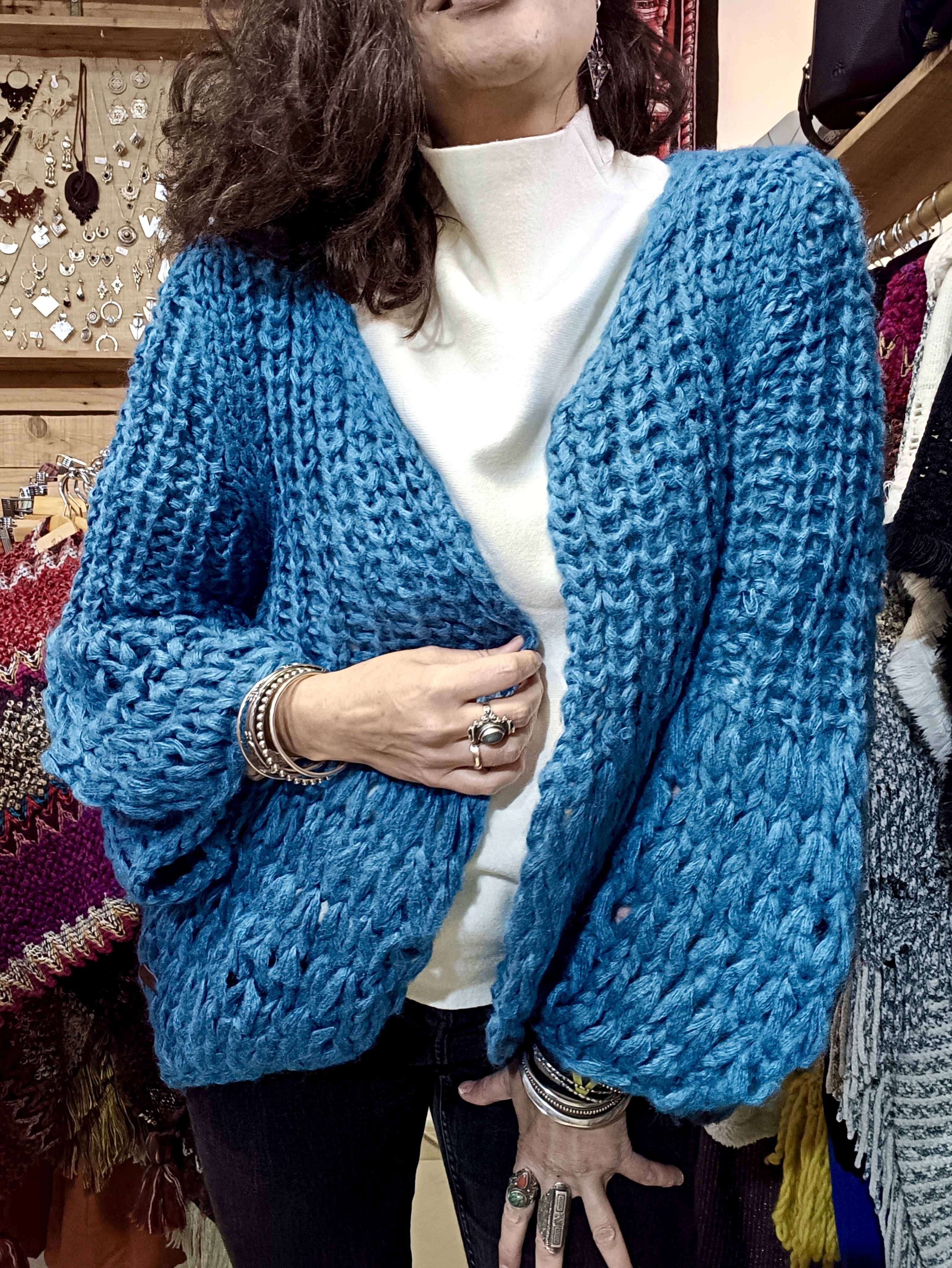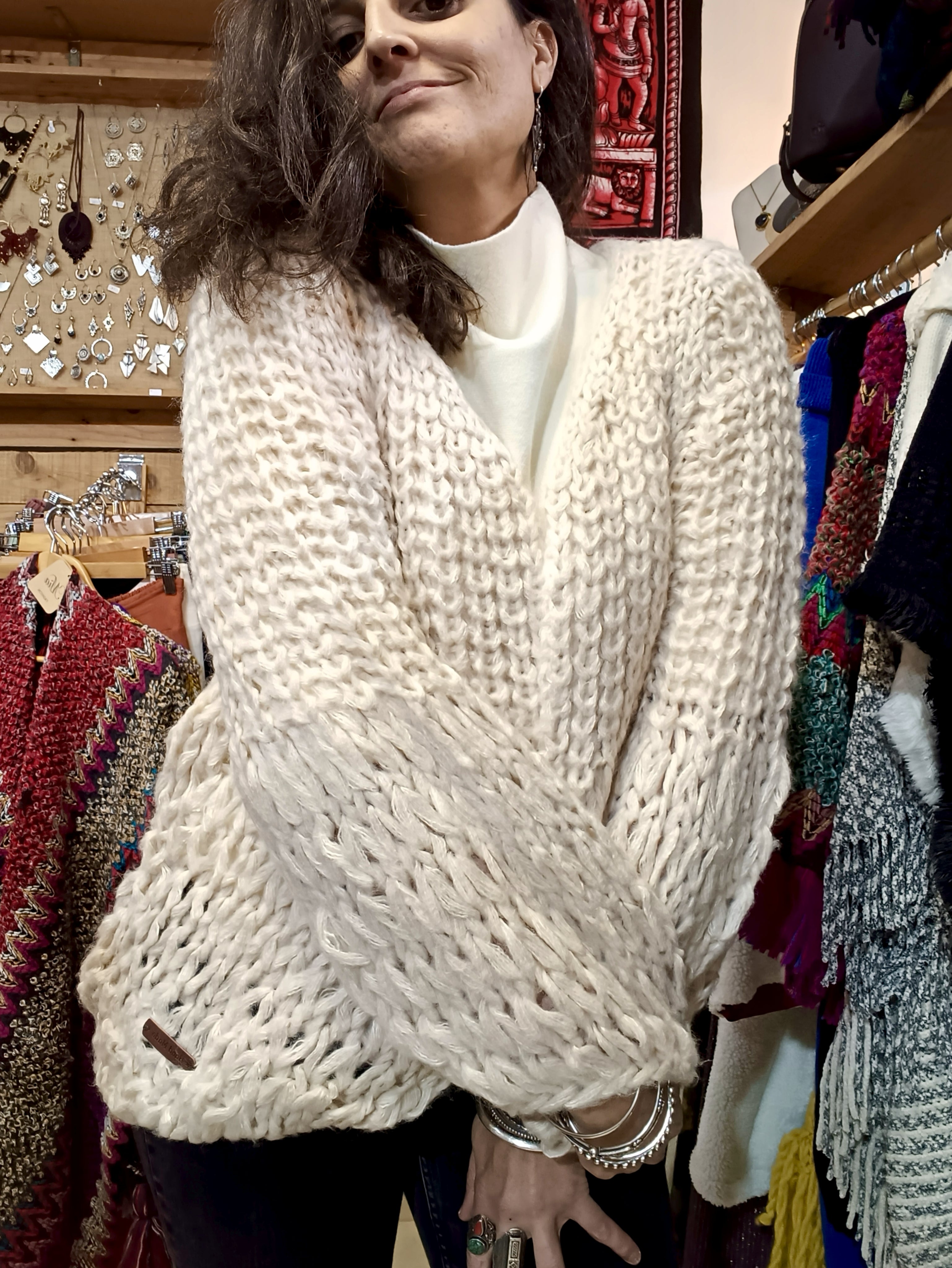 Casaco versátil em blend de lã e acrílico, corte único que se adapta a diferentes silhuetas.