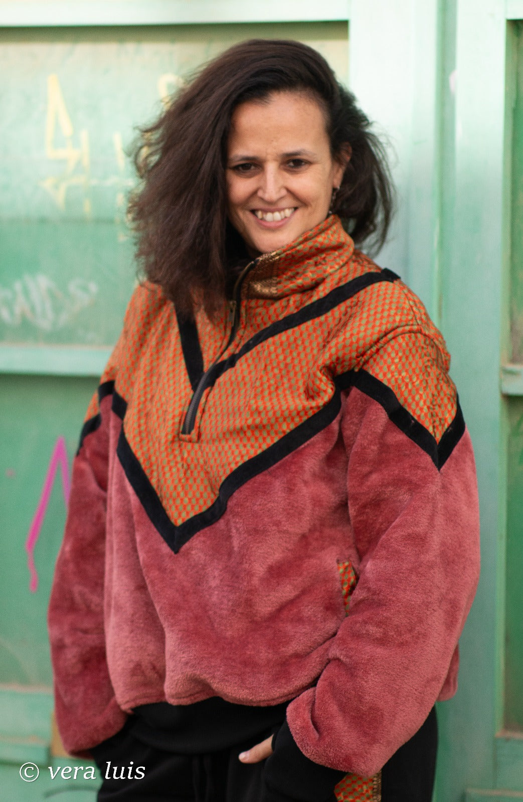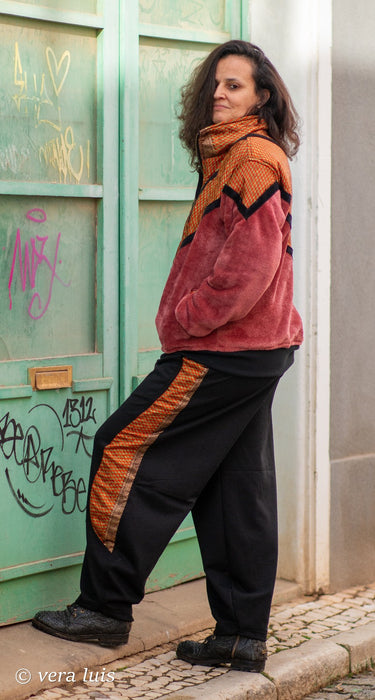 Este conjunto Funky da Raja Pura combina umas calças confortáveis com detalhes de sari reciclado e uma camisola super quente forrada a polar também com detalhes de sari reciclado, criando um look harmonioso, artesanal e cheio de identidade.