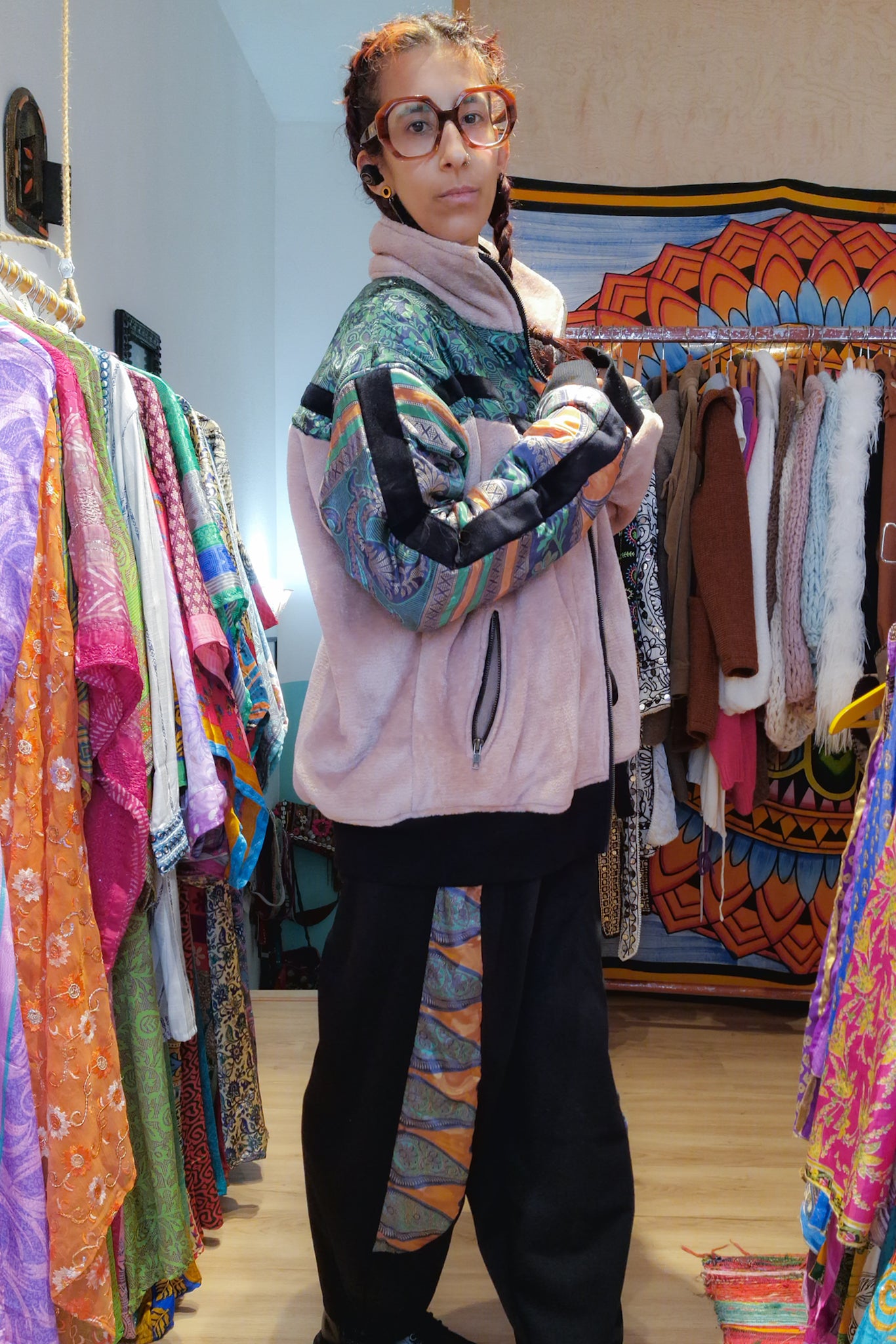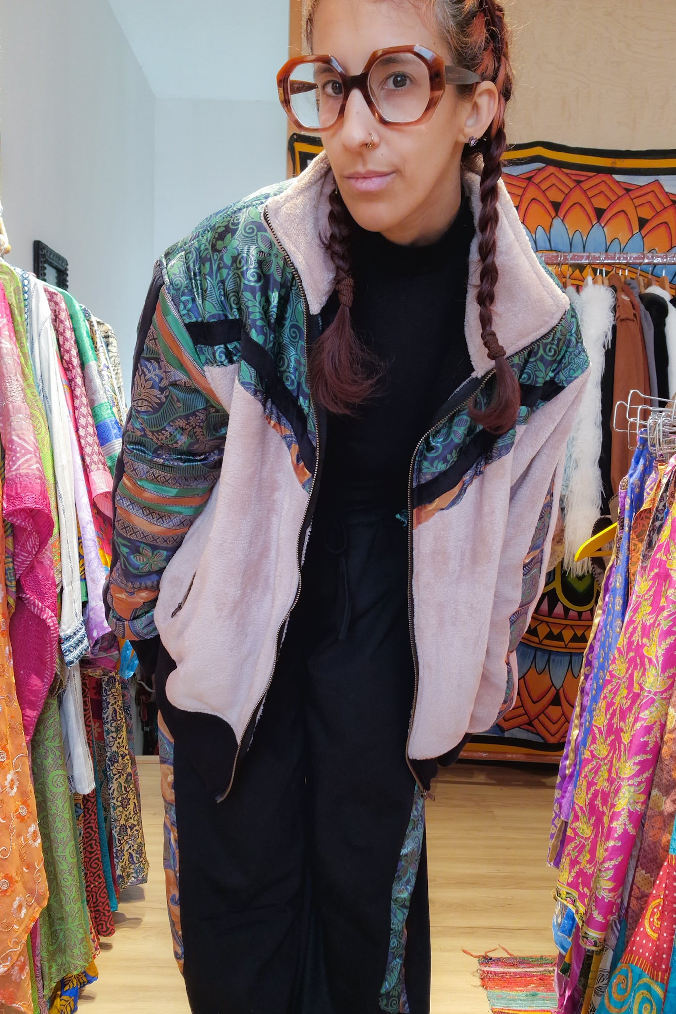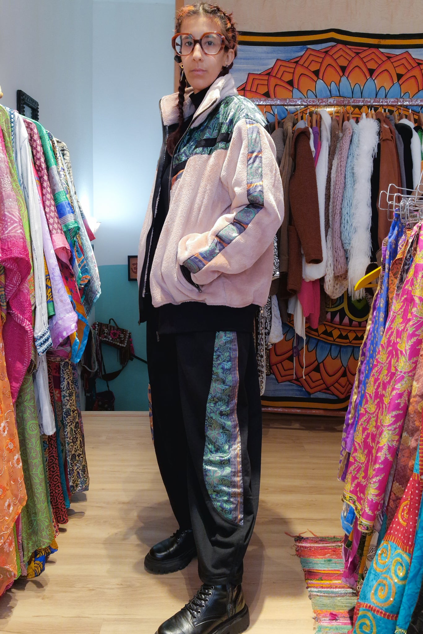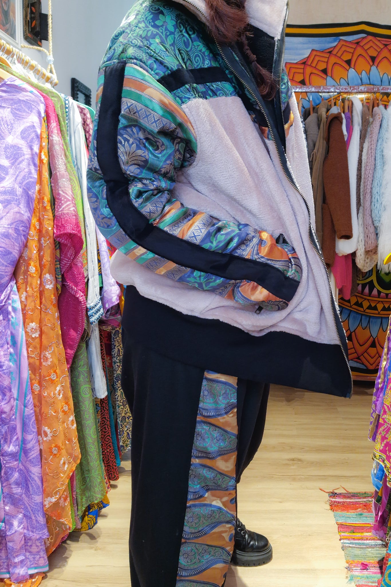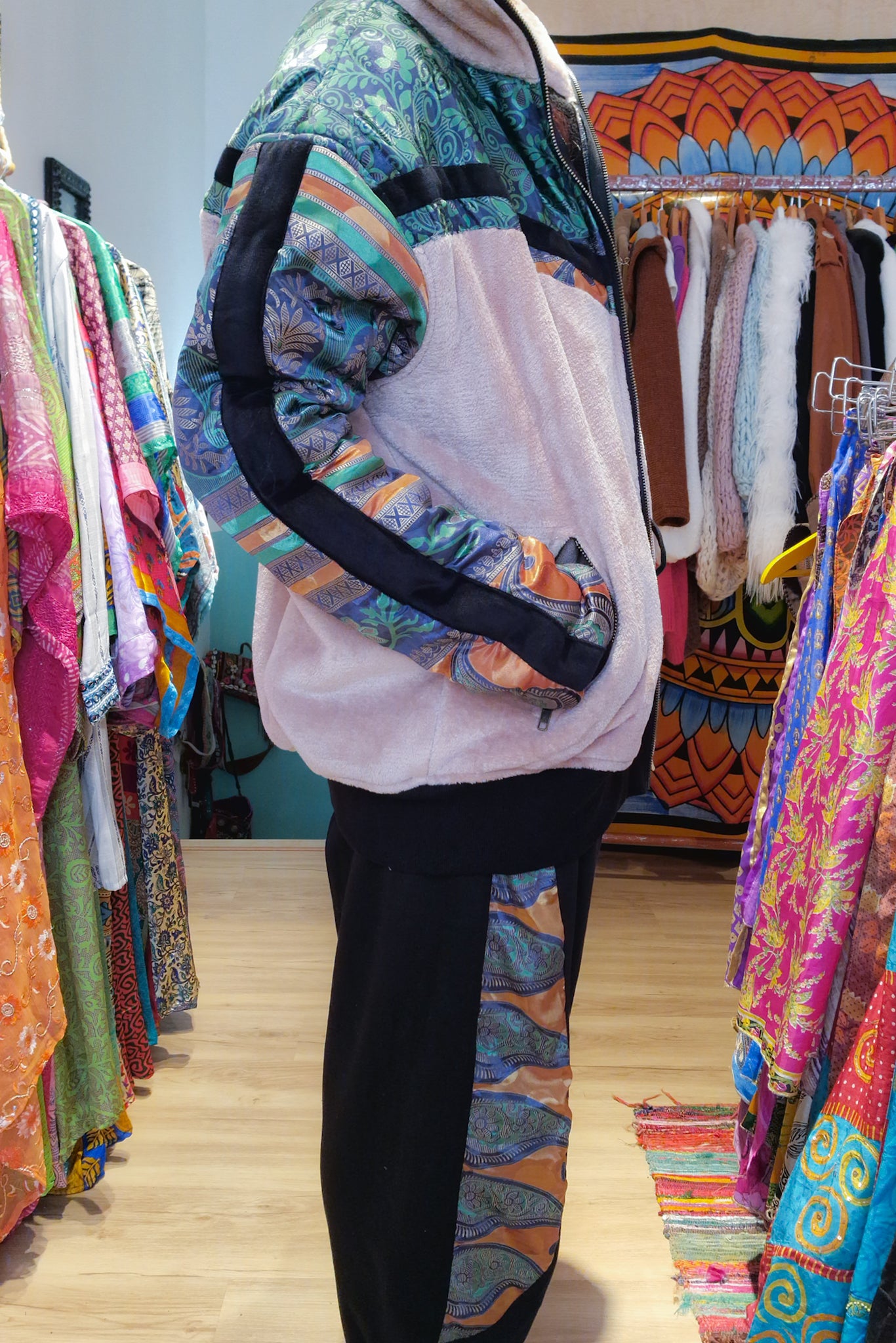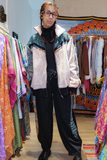 Este conjunto Funky da Raja Pura combina umas calças confortáveis com detalhes de sari reciclado e uma casaco super quente forrada a polar também com detalhes de sari reciclado, criando um look harmonioso, artesanal e cheio de identidade.