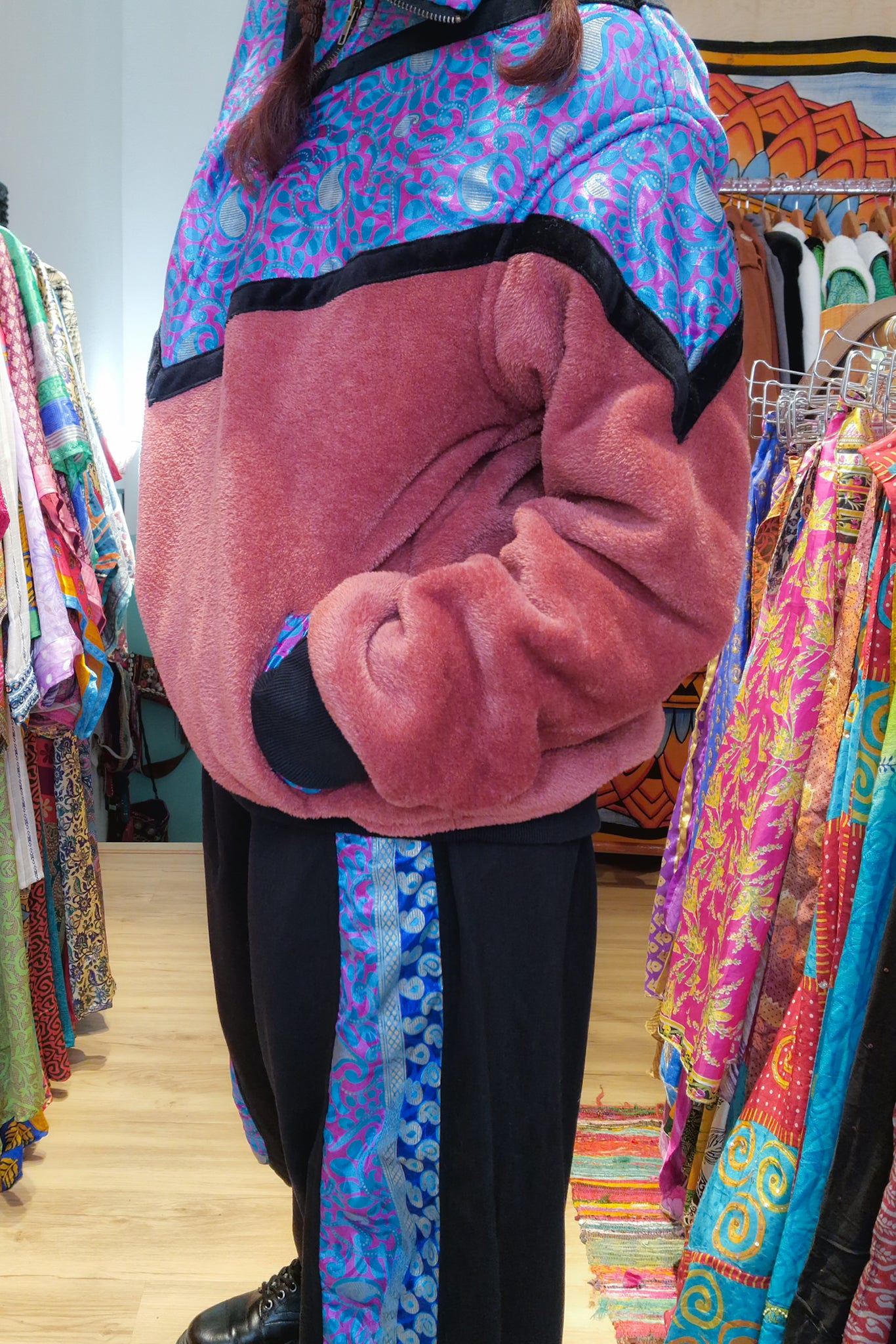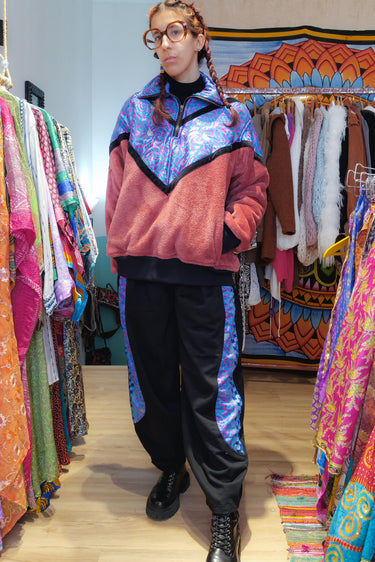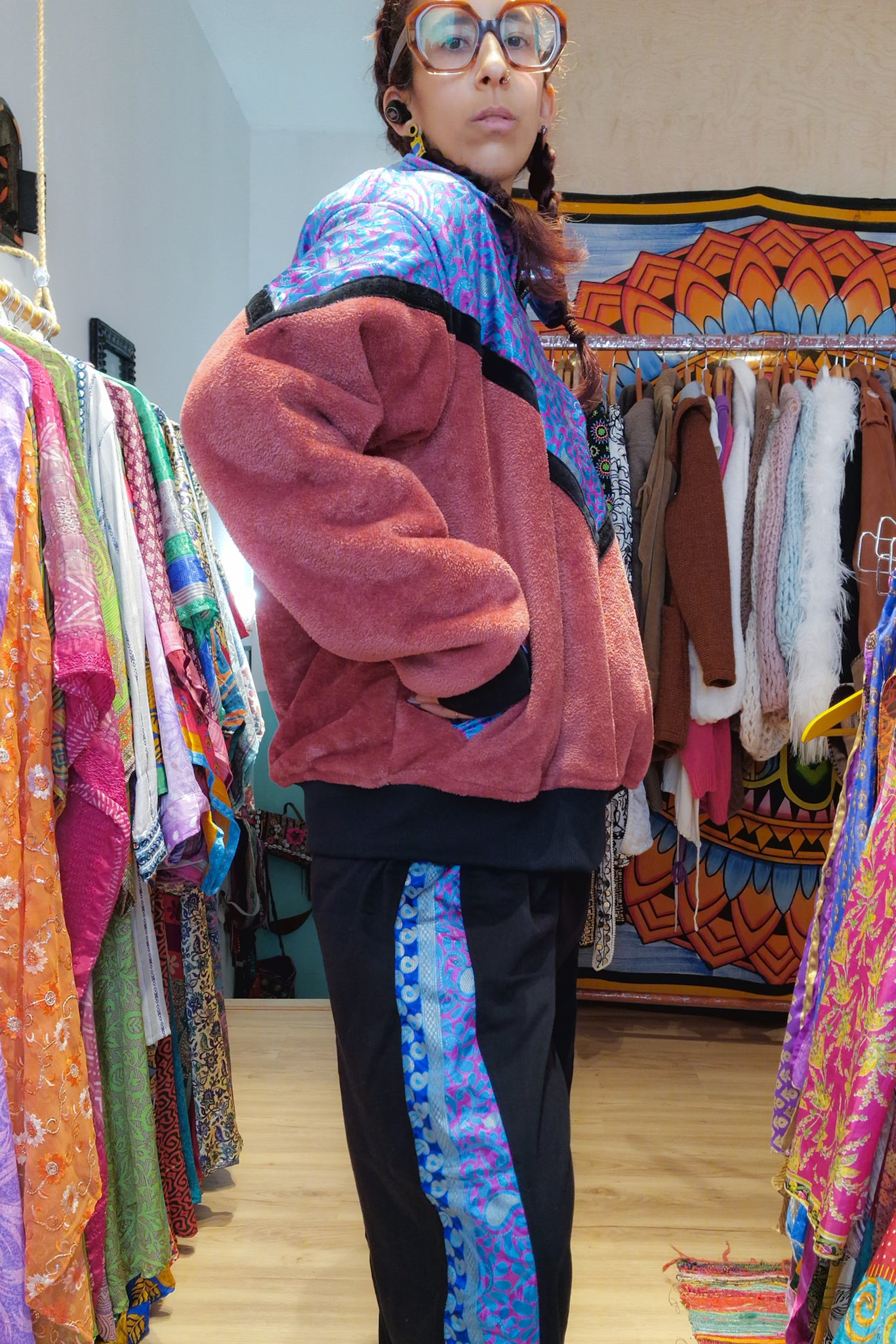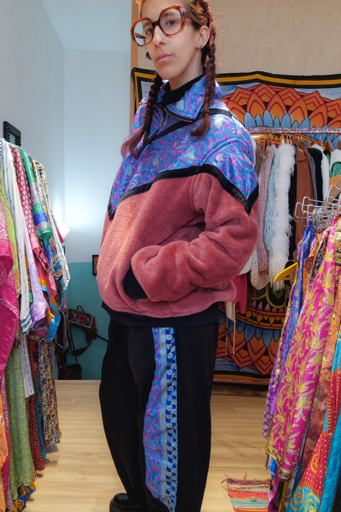 Este conjunto Funky da Raja Pura combina umas calças confortáveis com detalhes de sari reciclado e uma camisola super quente forrada a polar também com detalhes de sari reciclado, criando um look harmonioso, artesanal e cheio de identidade.
