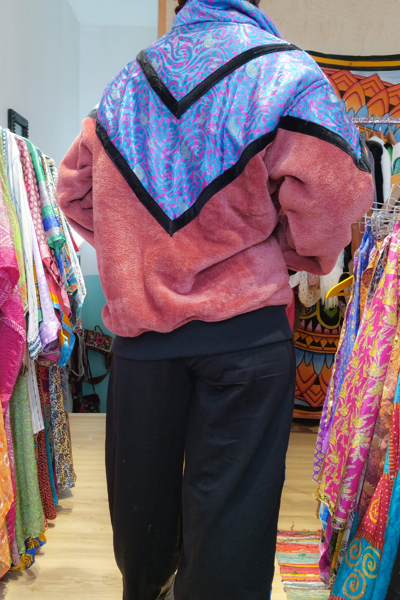 Cada pela integra saris reutilizados, escolhidos manualmente, tornando cada conjunto único em cores, padrões e texturas. A fusão entre algodão, fleece felpudo e polar macio garante aconchego térmico, respirabilidade e liberdade de movimento.