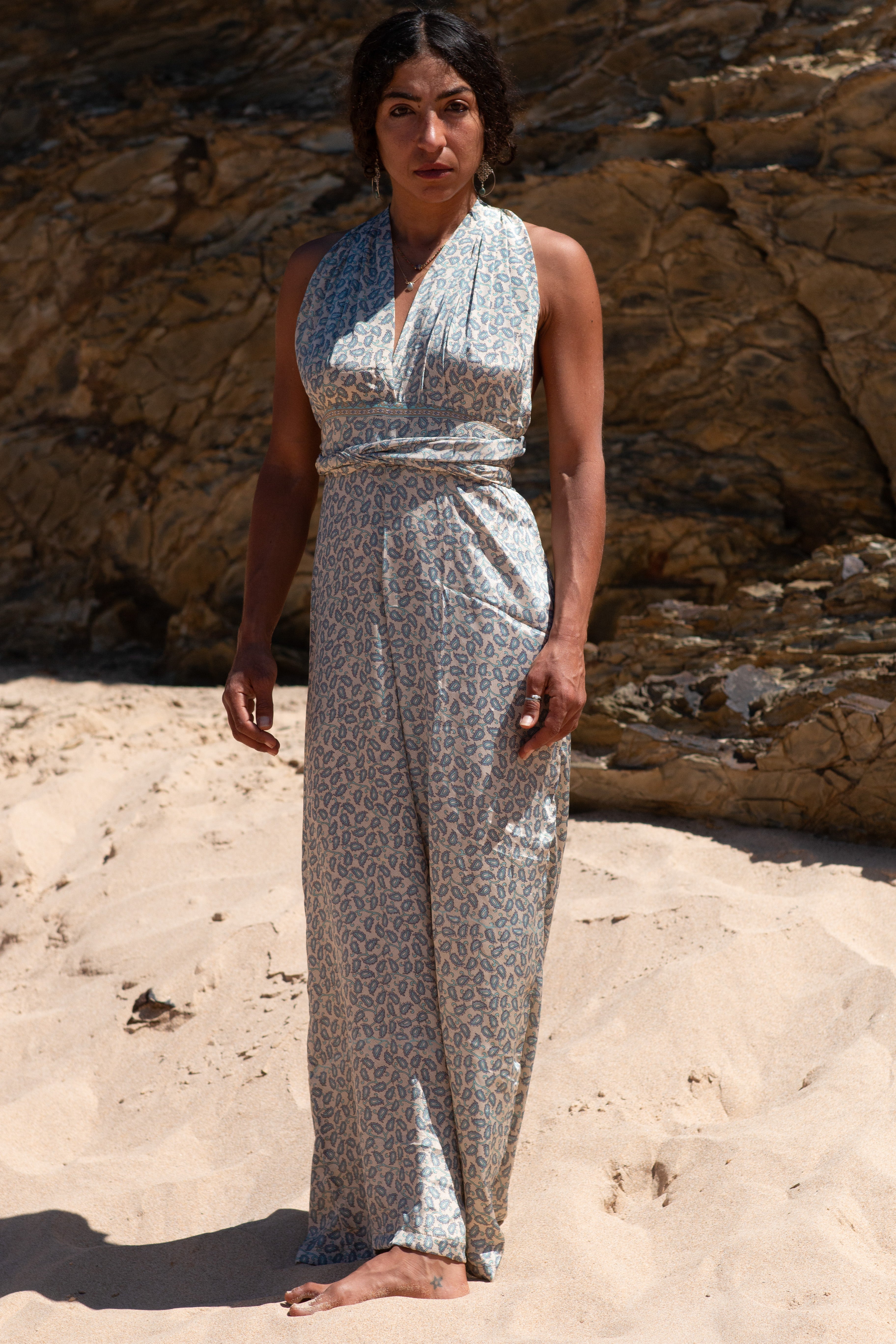 O caimento fluido e a personalidade artesanal transformam este macacão numa declaração de estilo sustentável e bohemian.