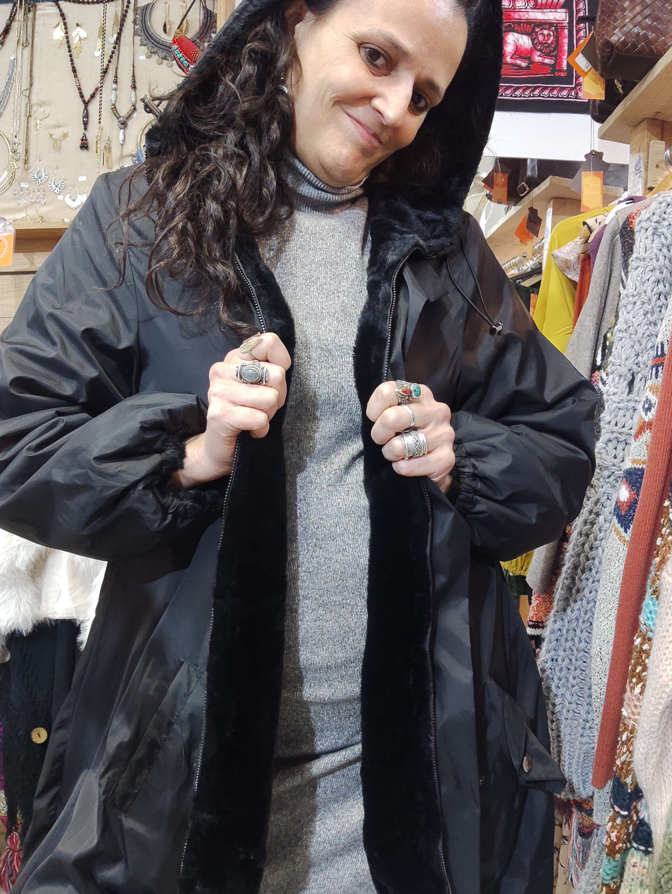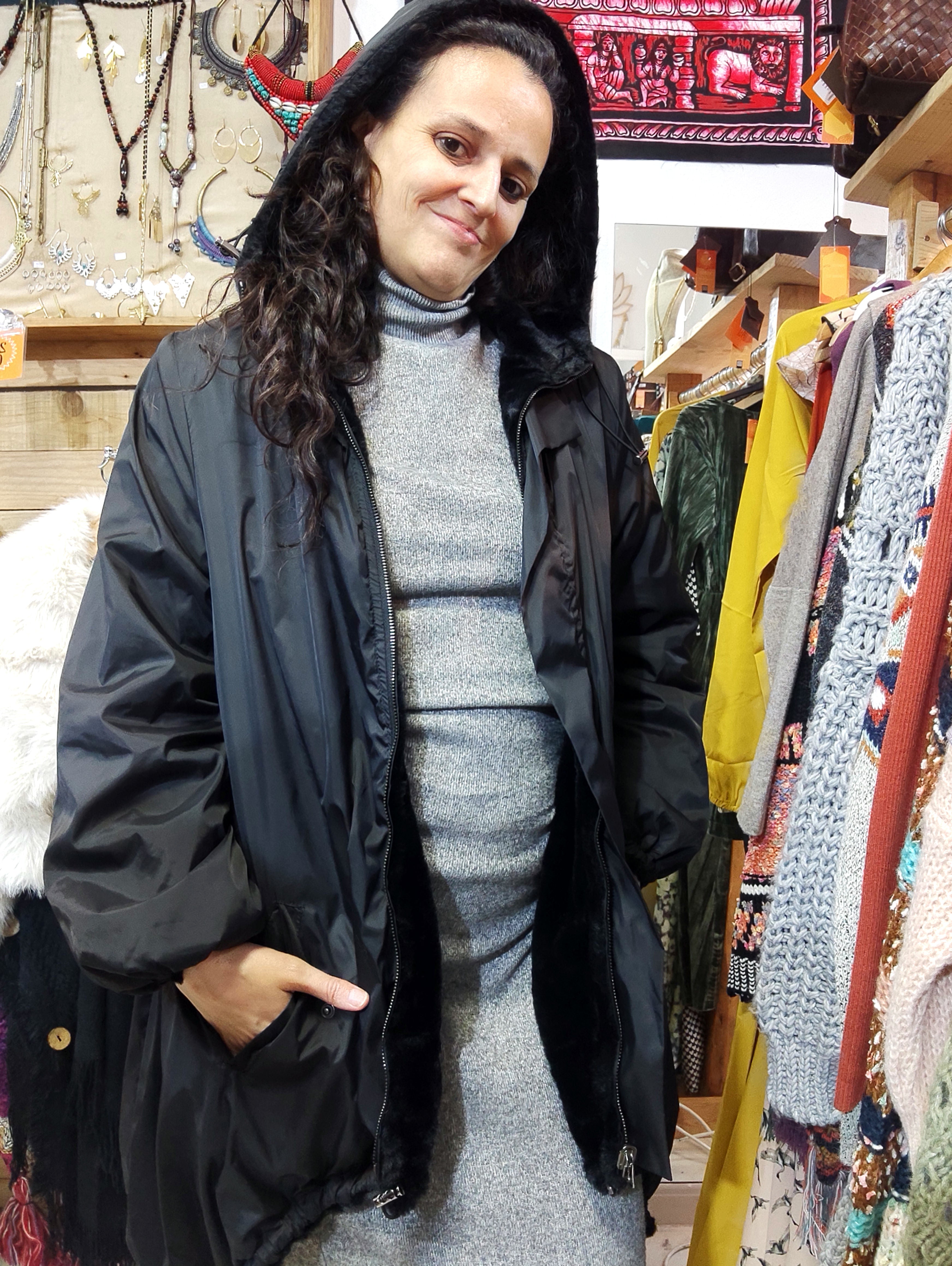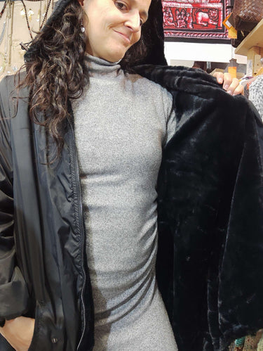 Casaco impermeável em preto com forro de pelo negro macio que abraça o corpo com calor e maciez.