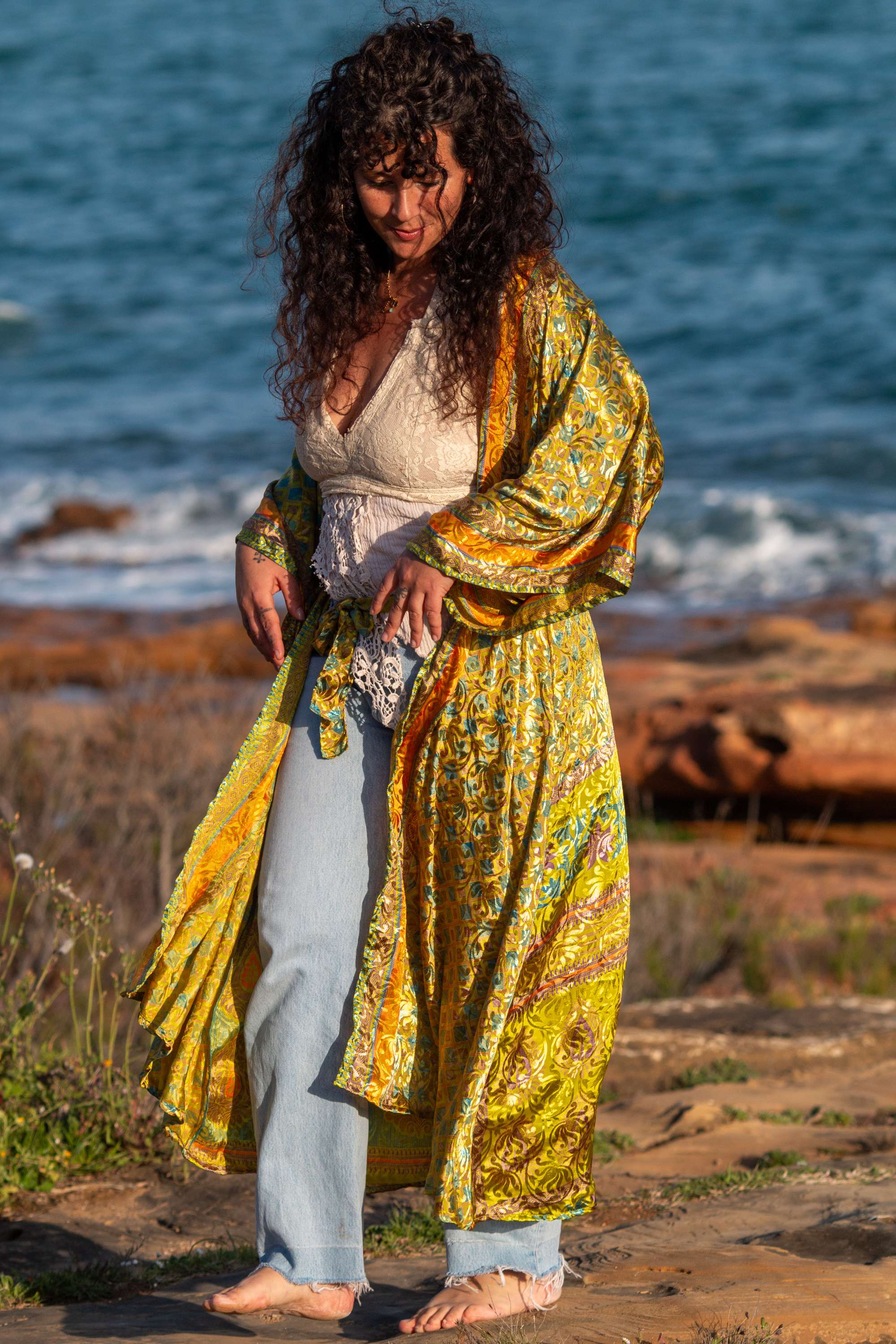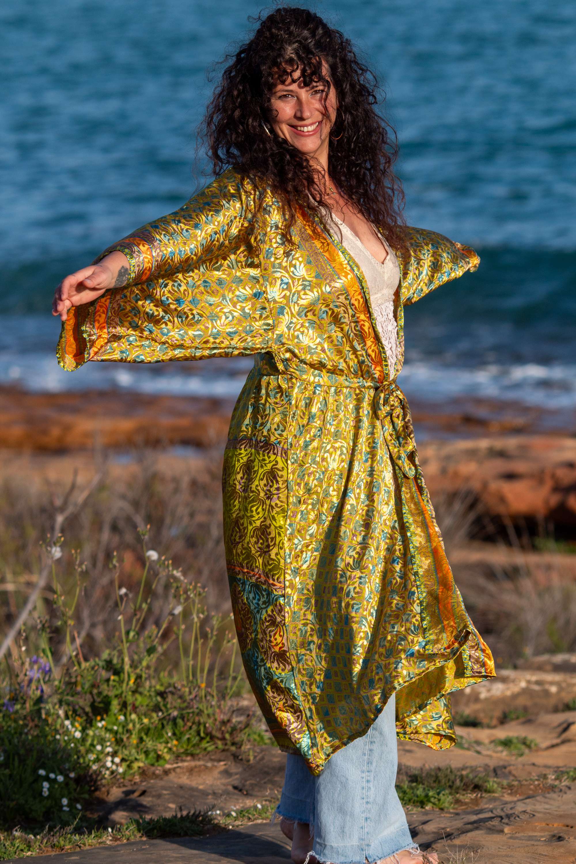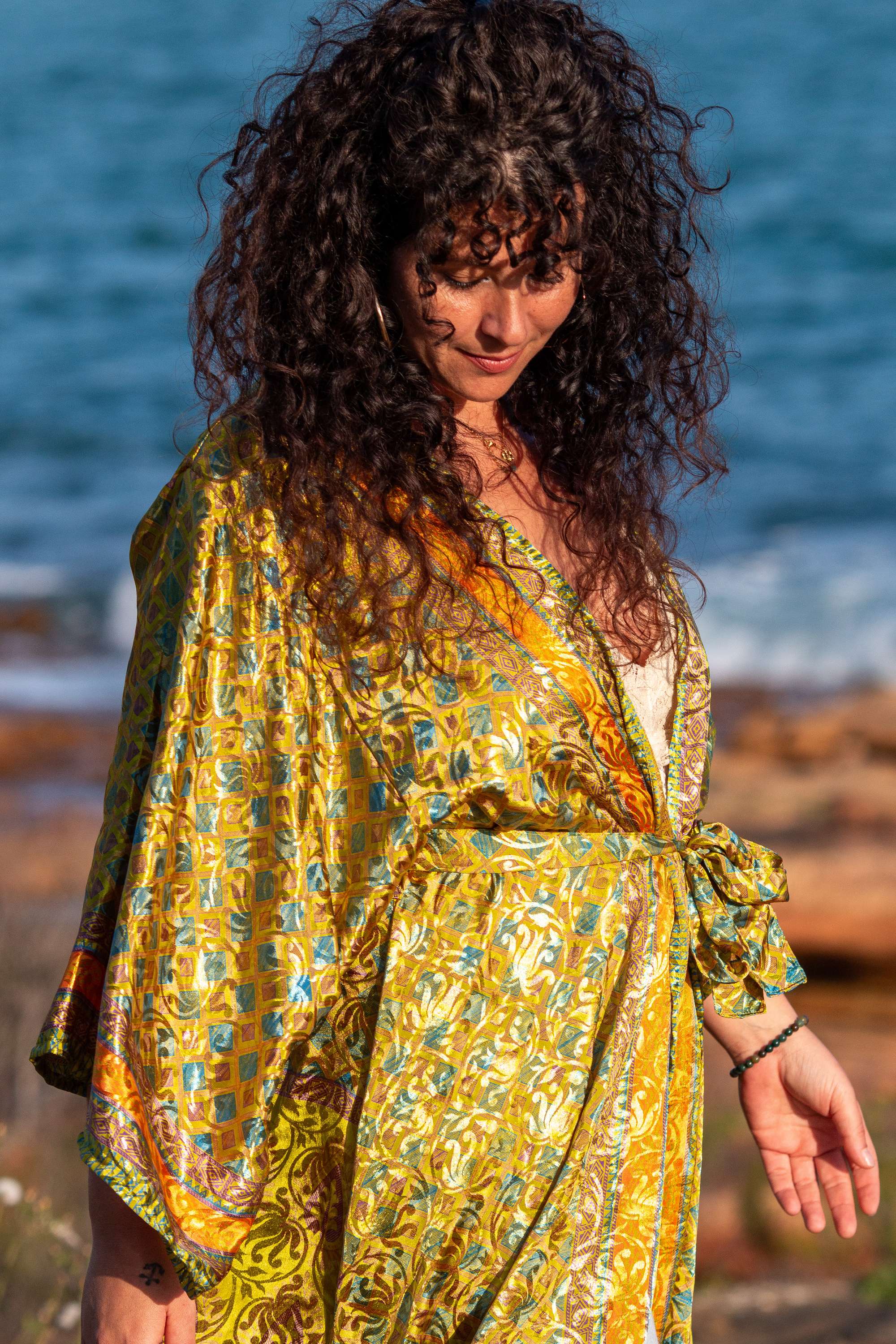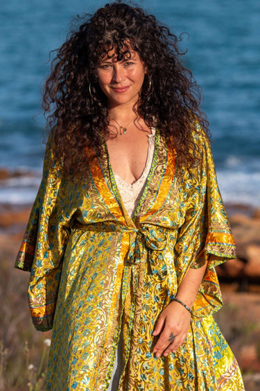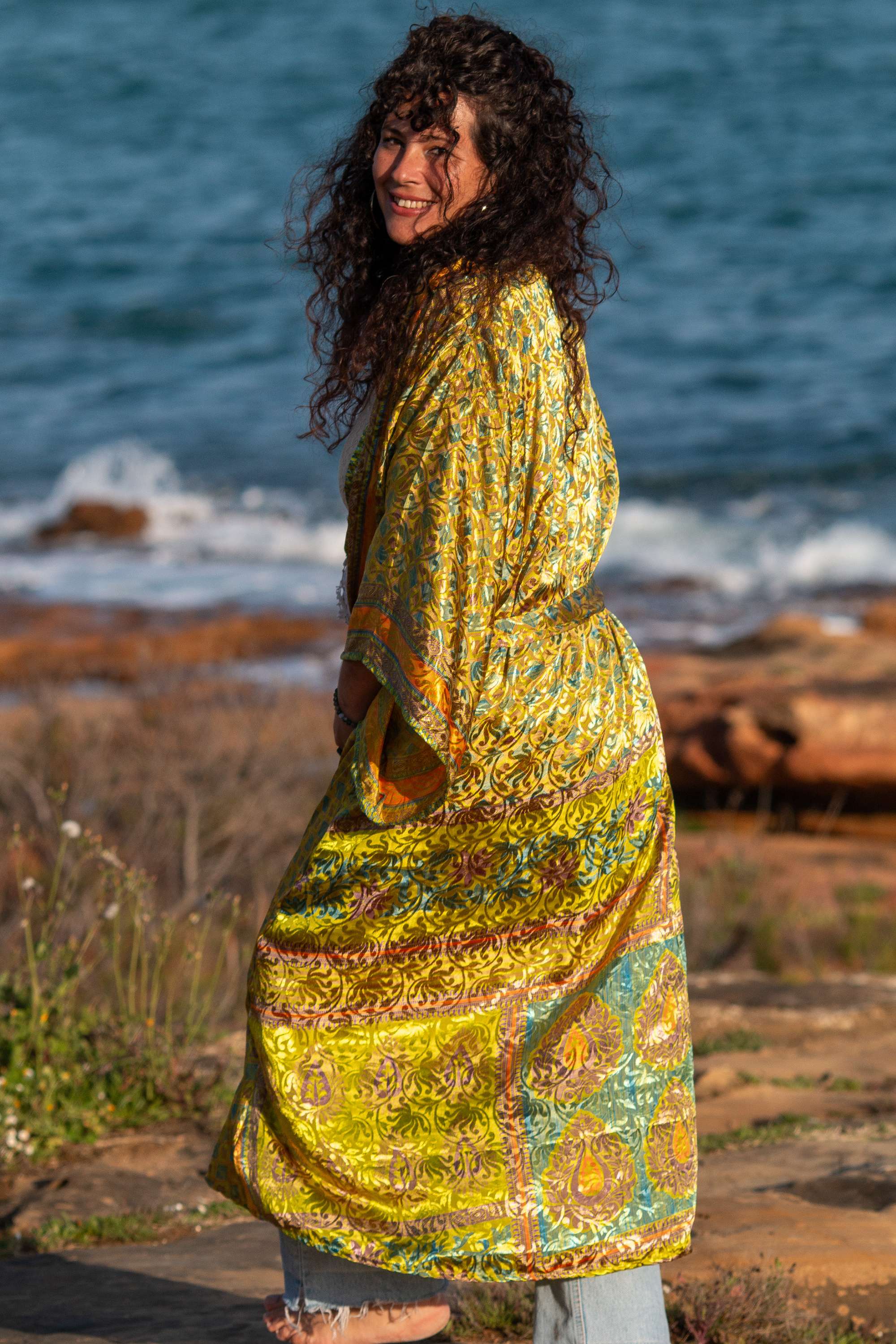 Envolve-te no Quimono Kavya, uma peça nascida do upcycling de saris que guardavam memórias de mulheres indianas.