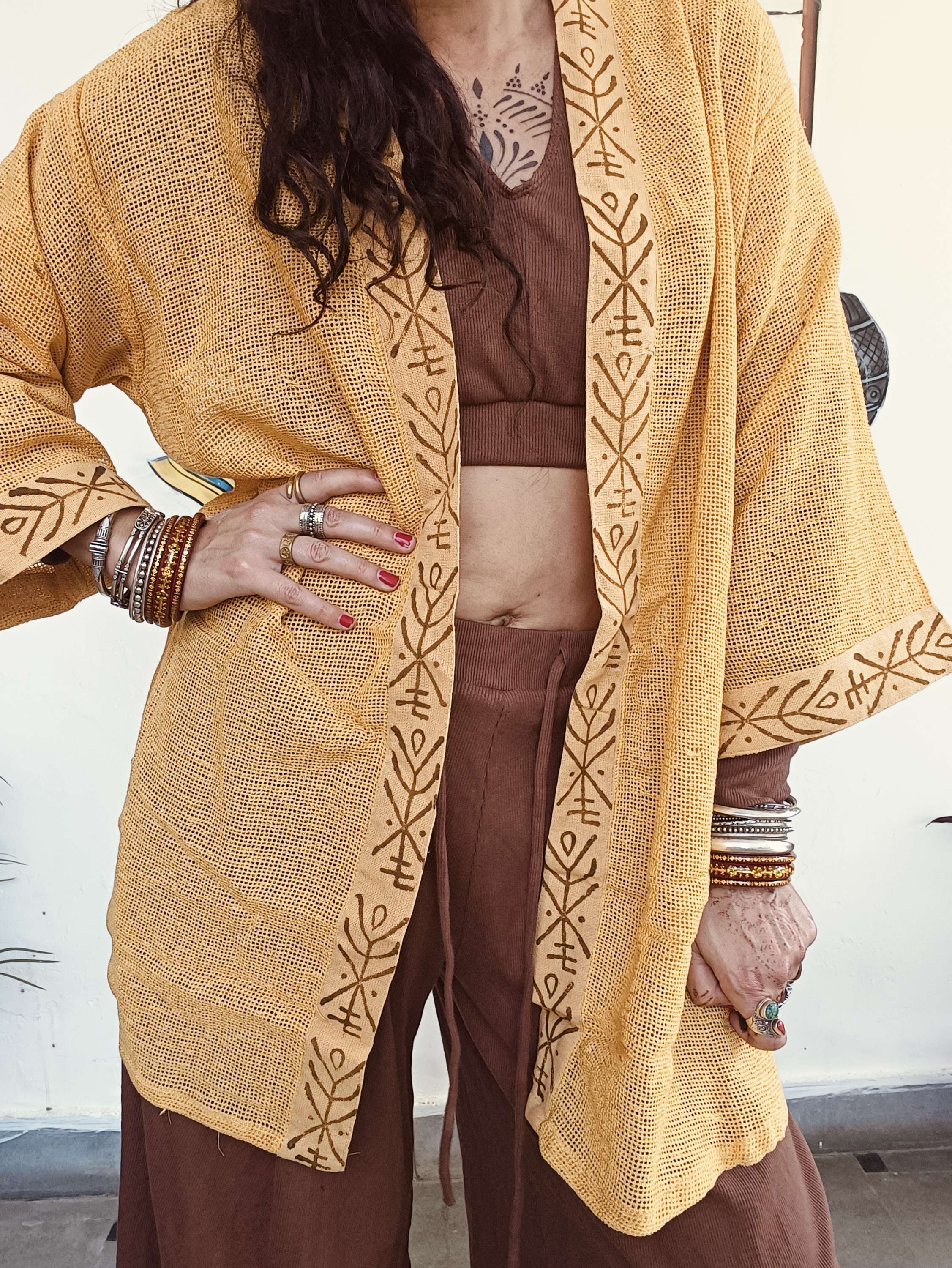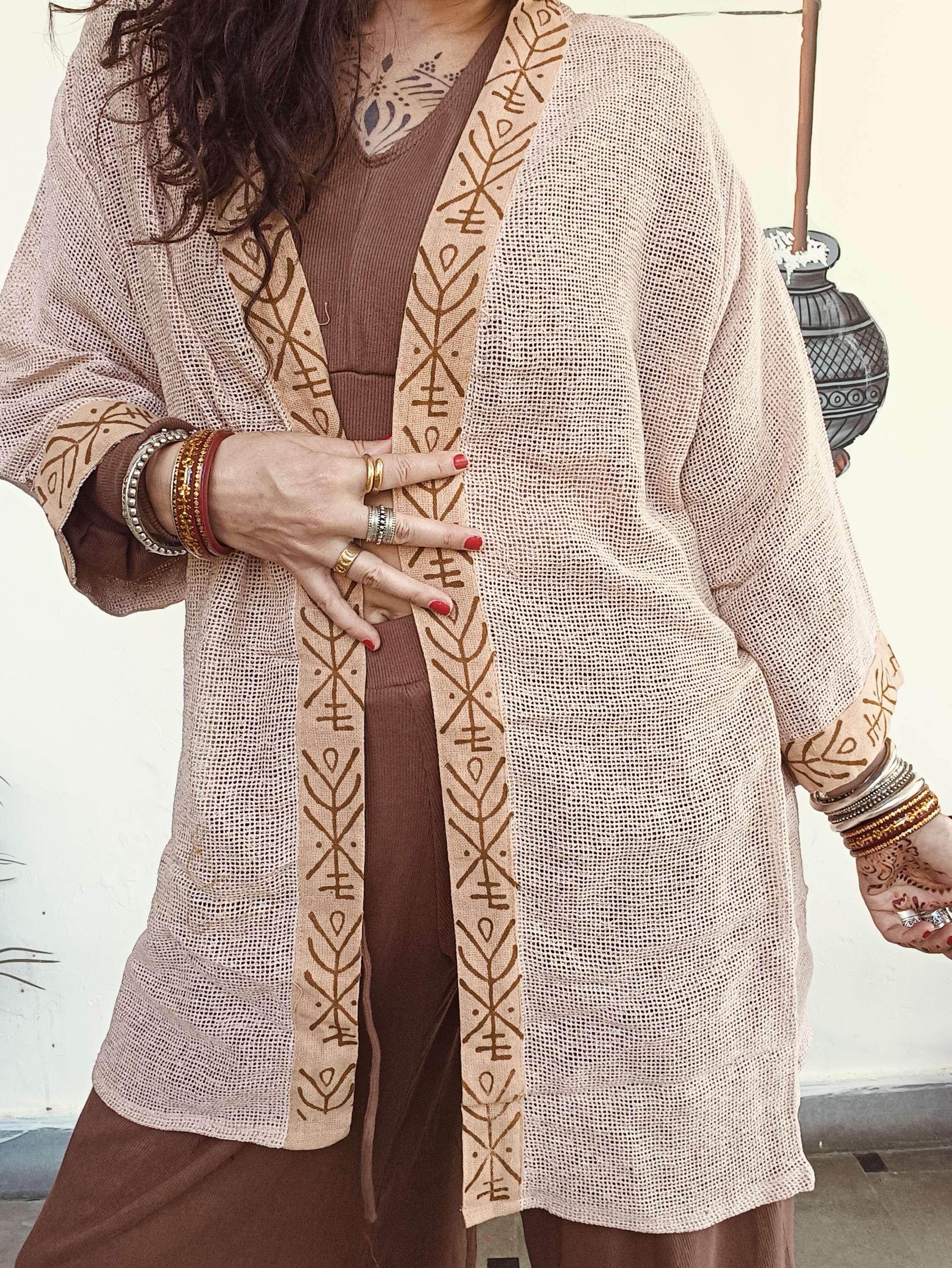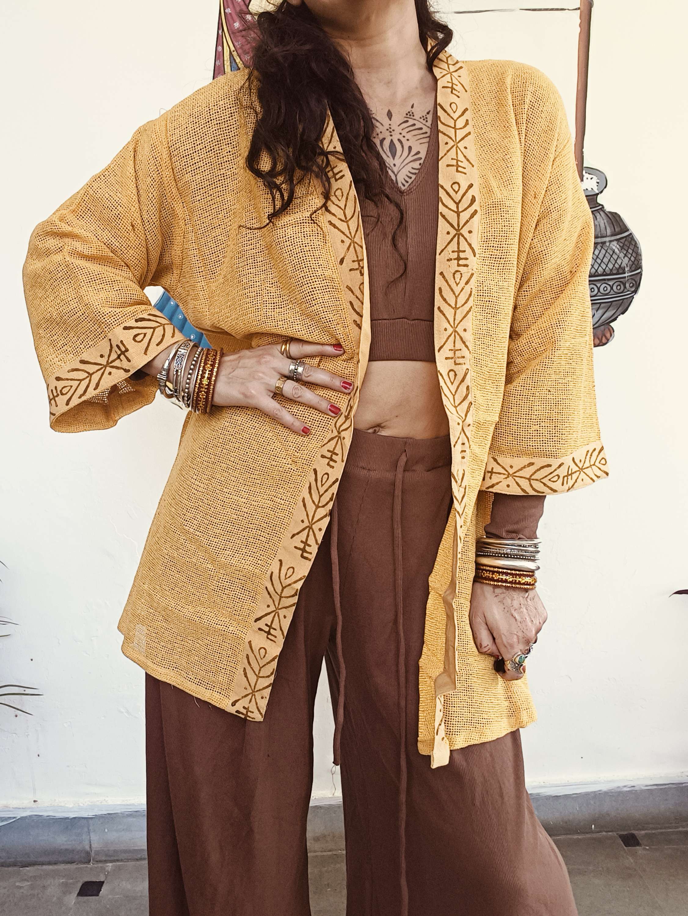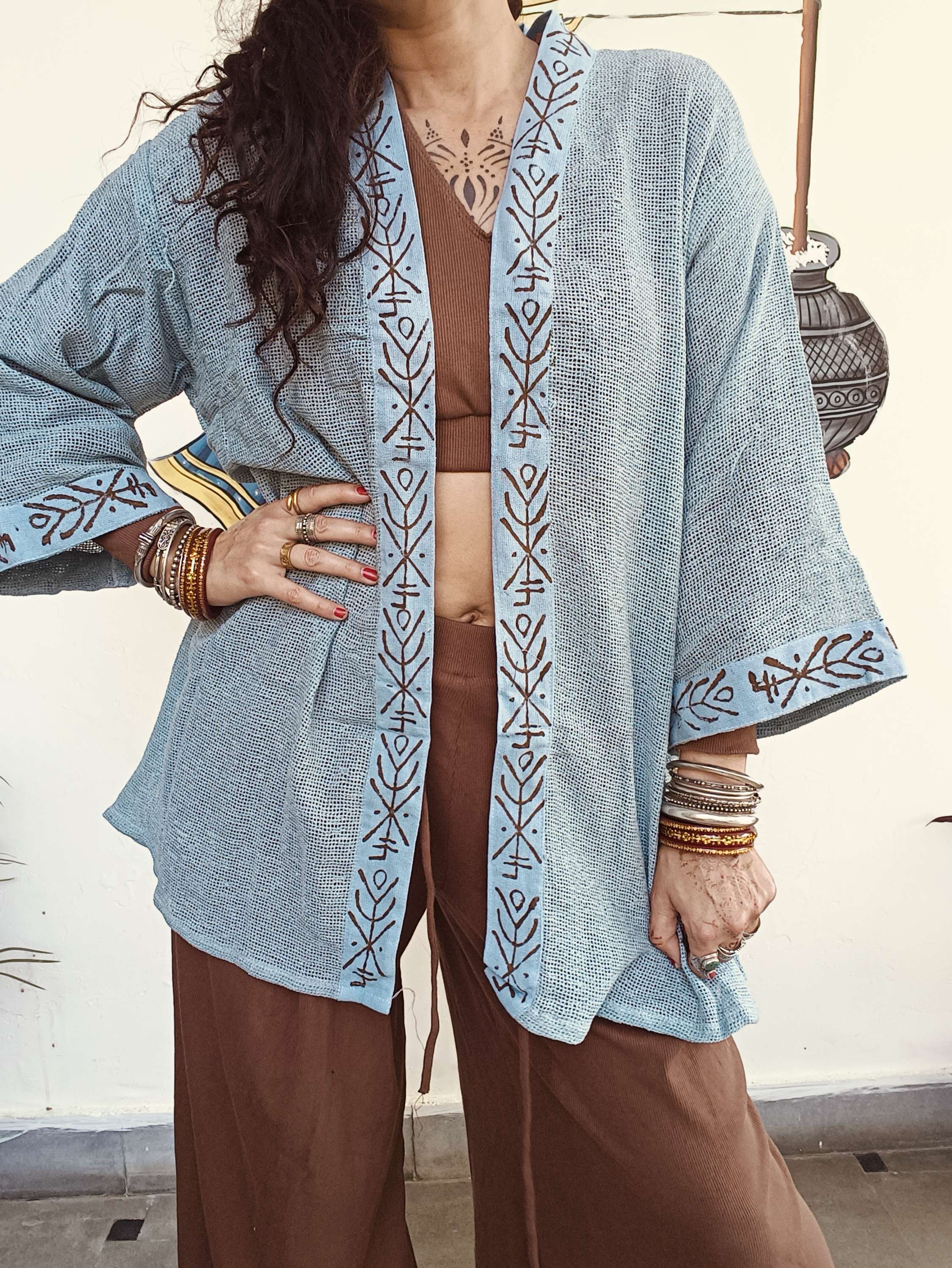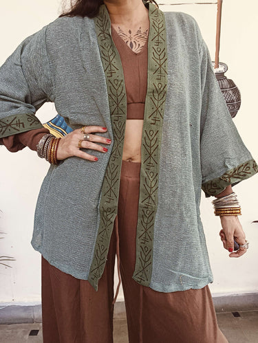 Quimono em algodão macio com padrão em block print exclusivo que celebra a tradição artesanal.