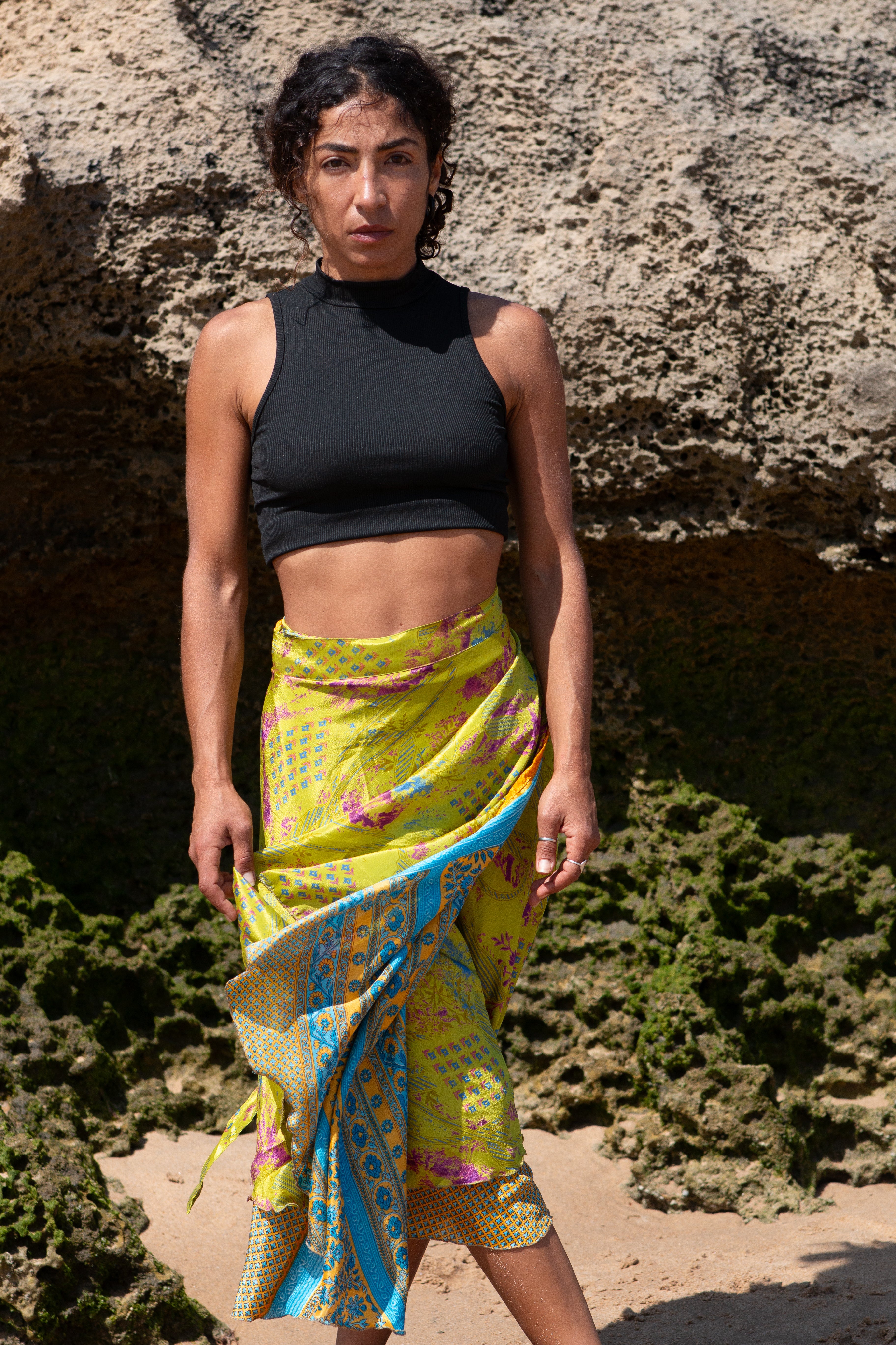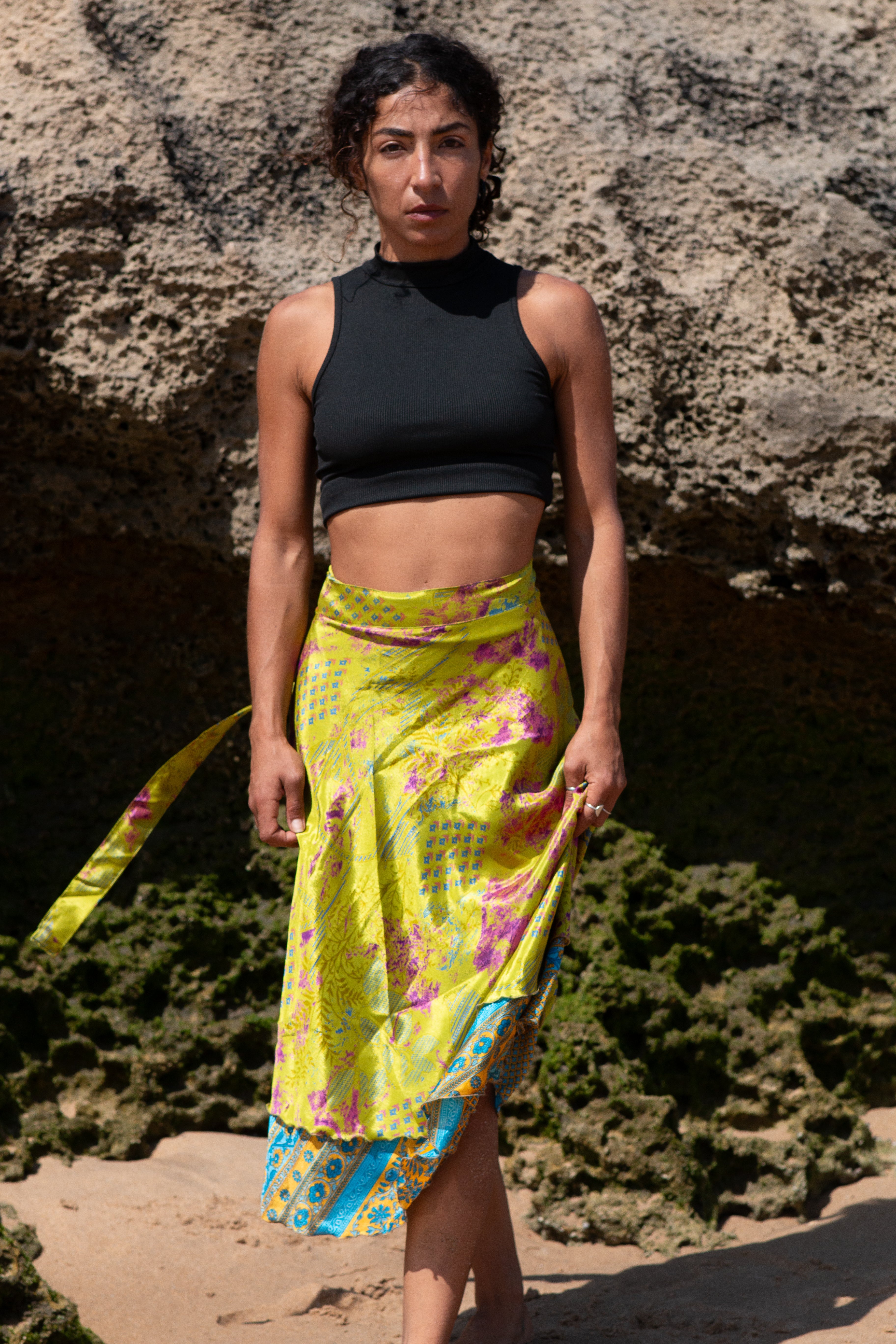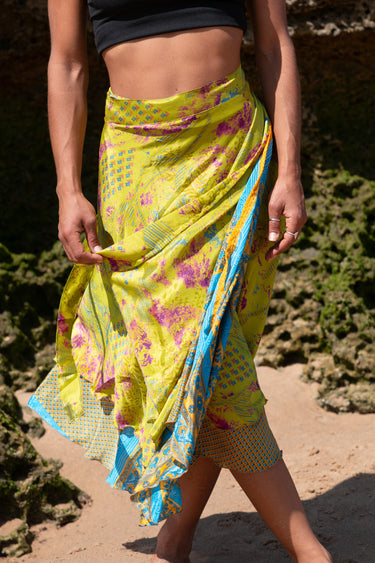 A Saia Kiran é uma saia de trespasse criada a partir de saris reciclados com histórias próprias.