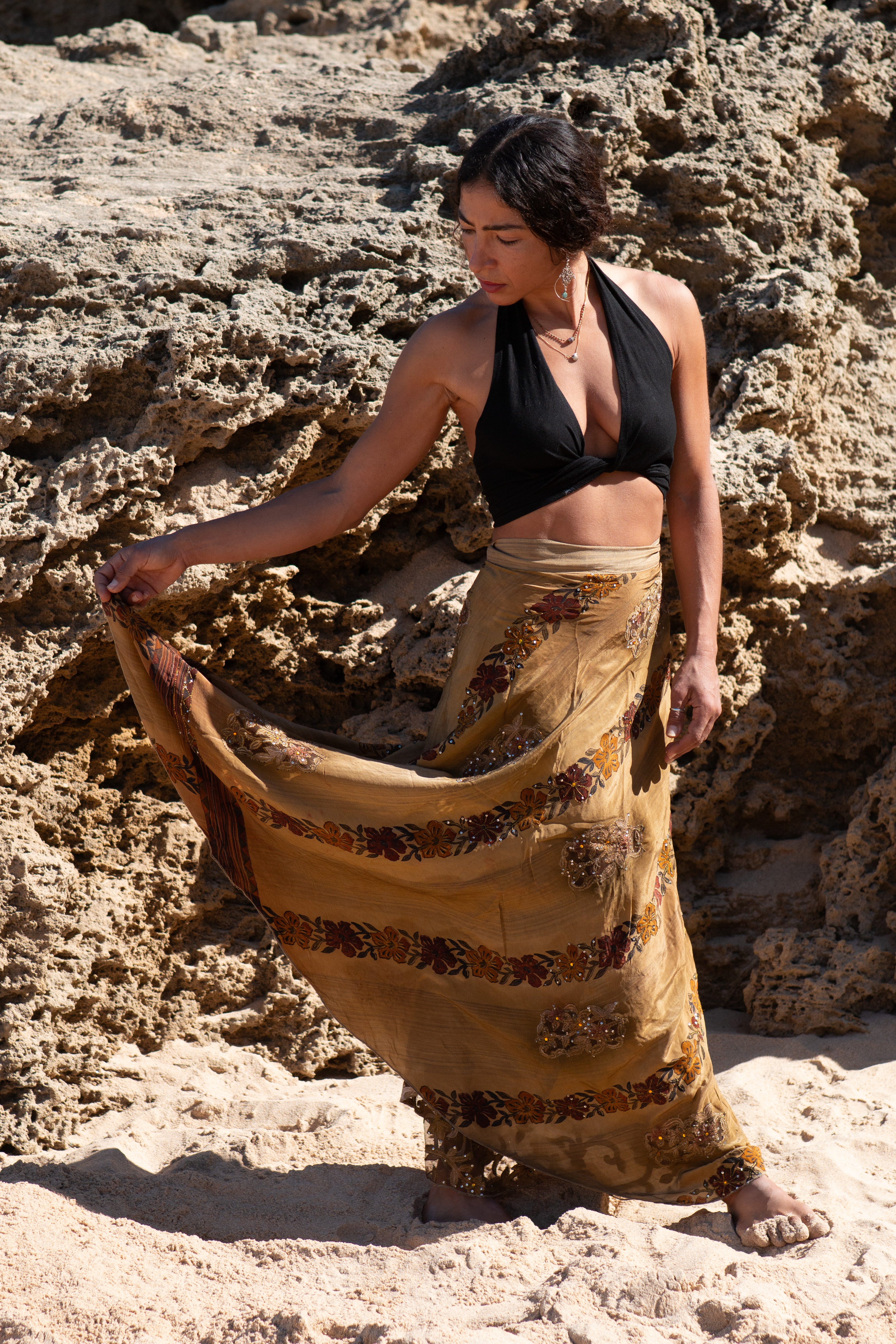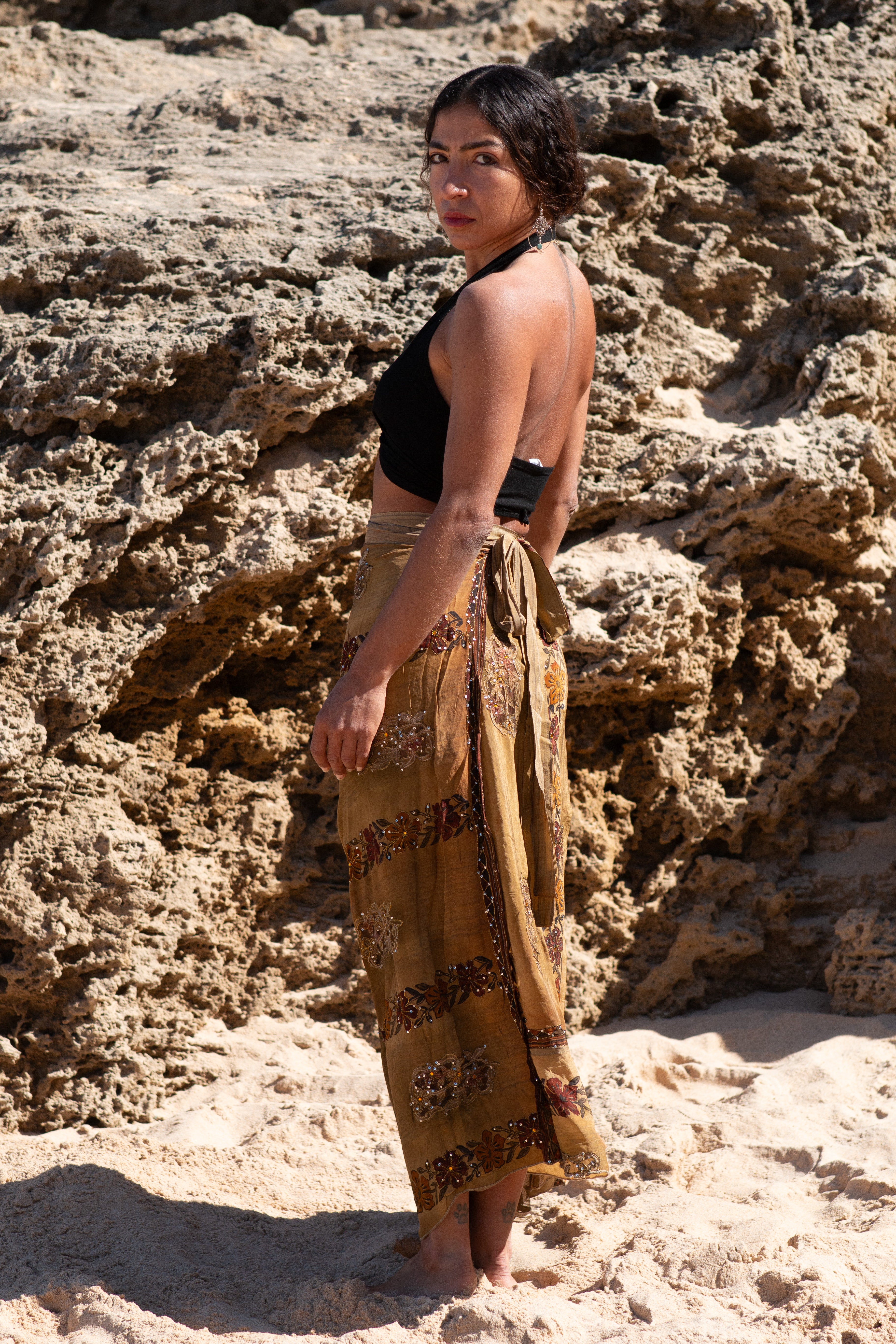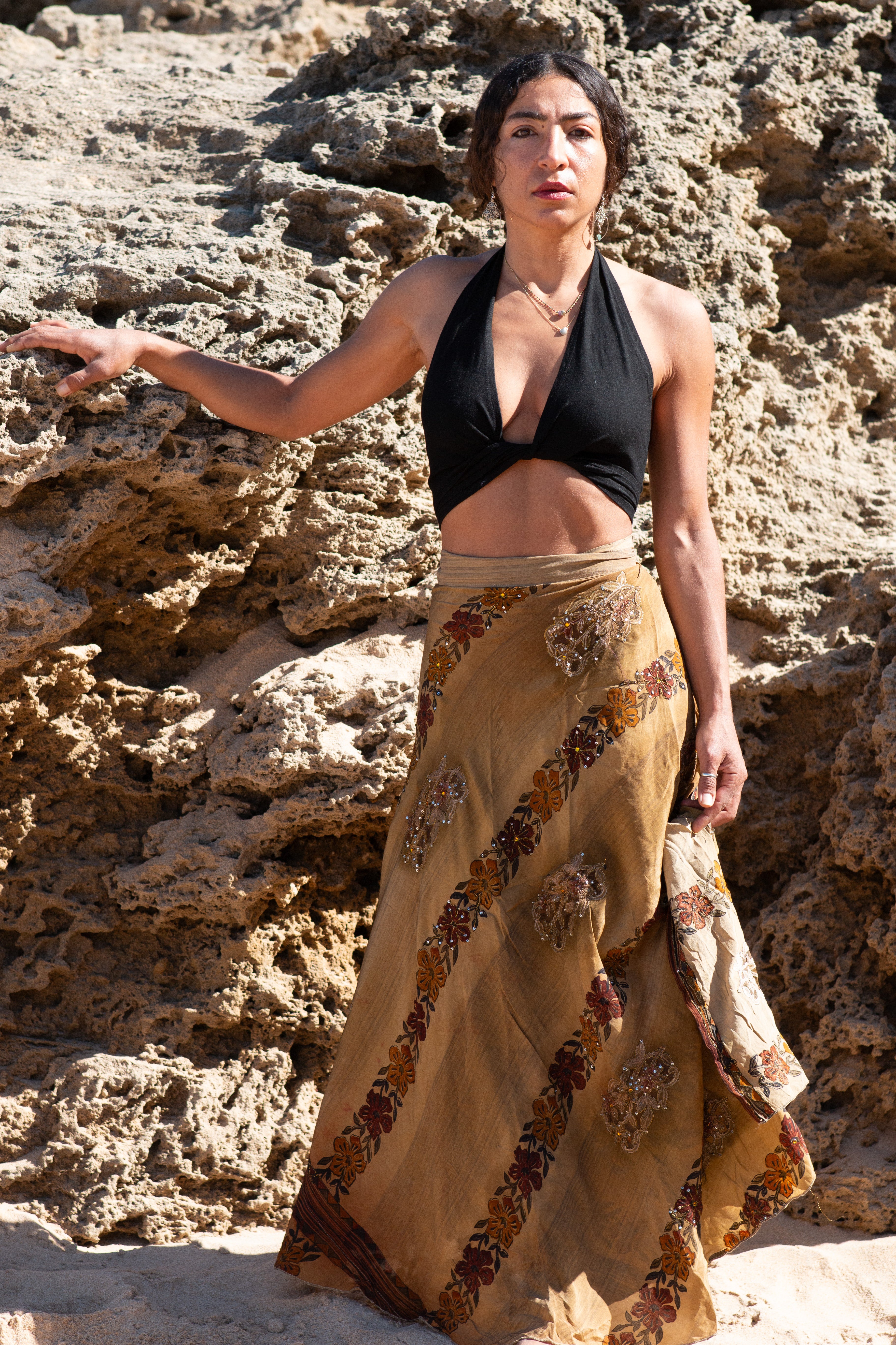 A saia Mayara é uma saia de trespasse criada a partir de saris de seda reciclados com histórias próprias.