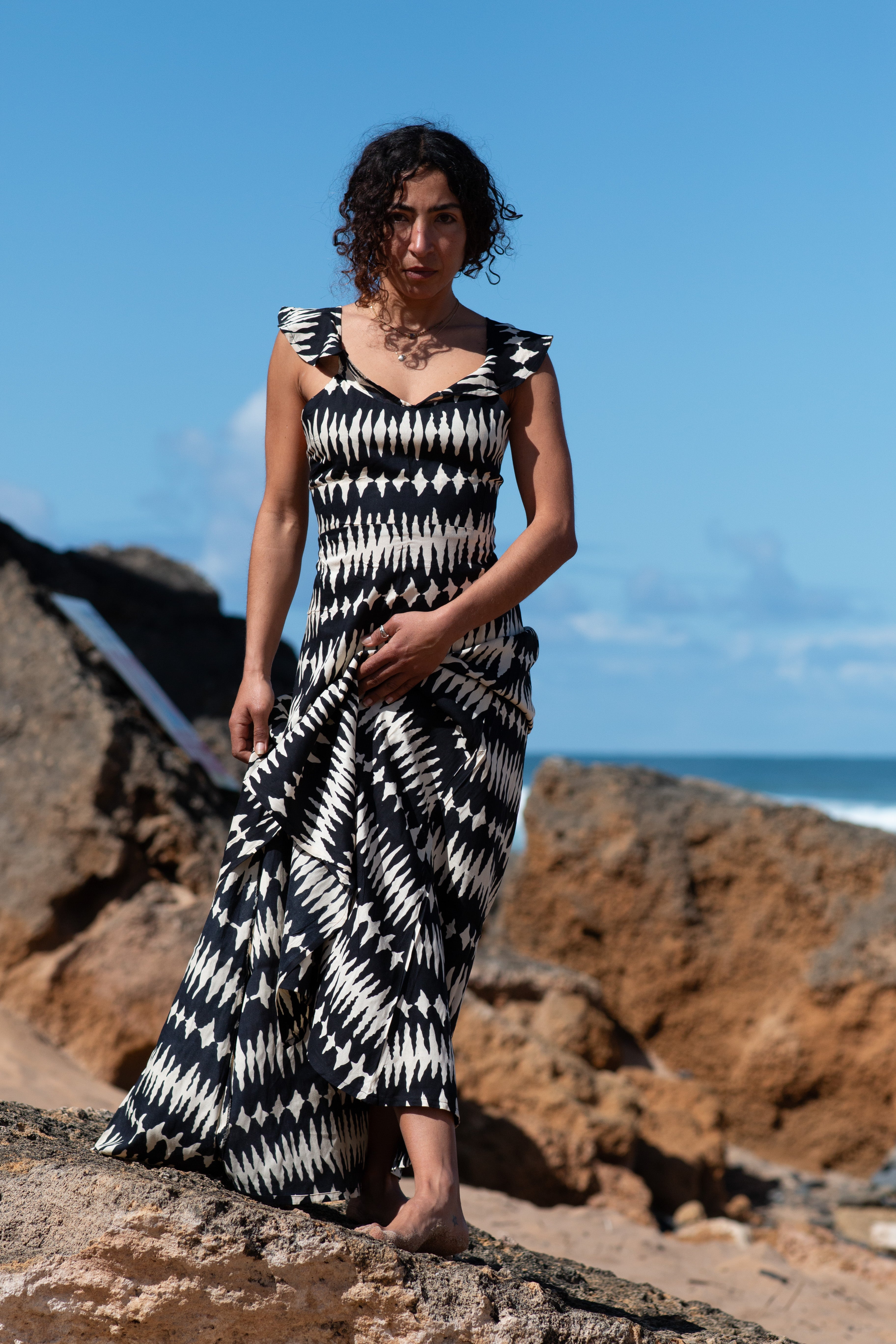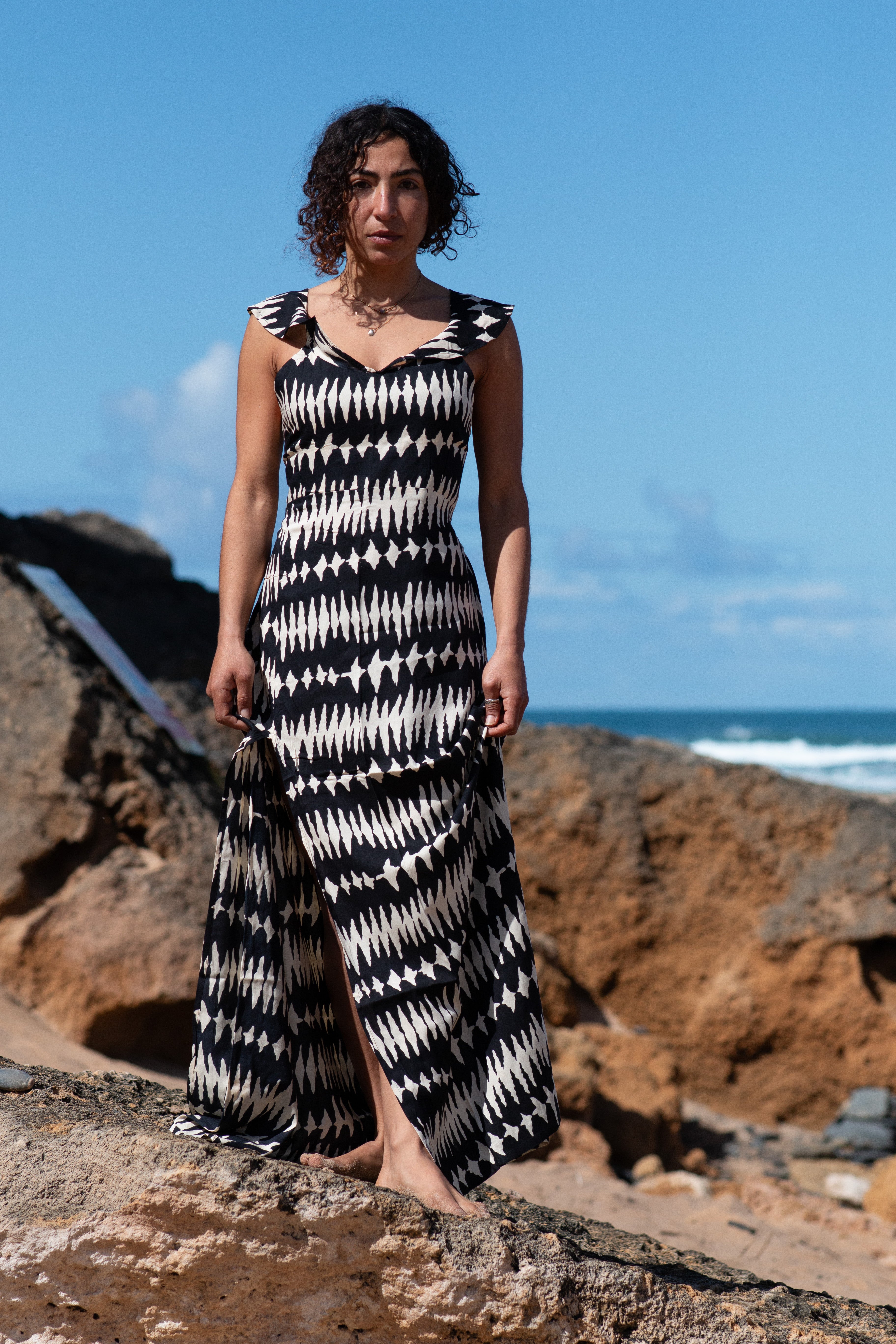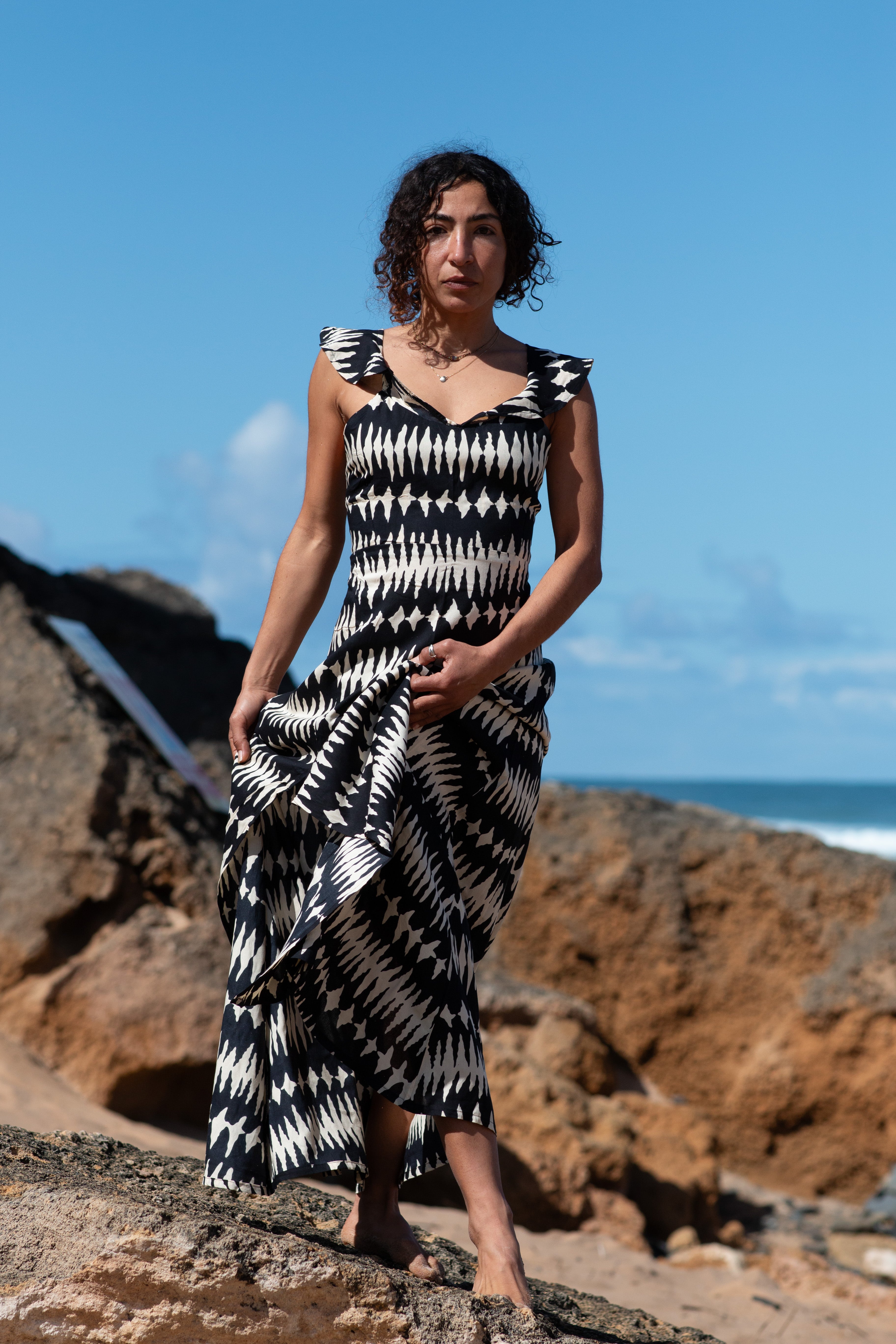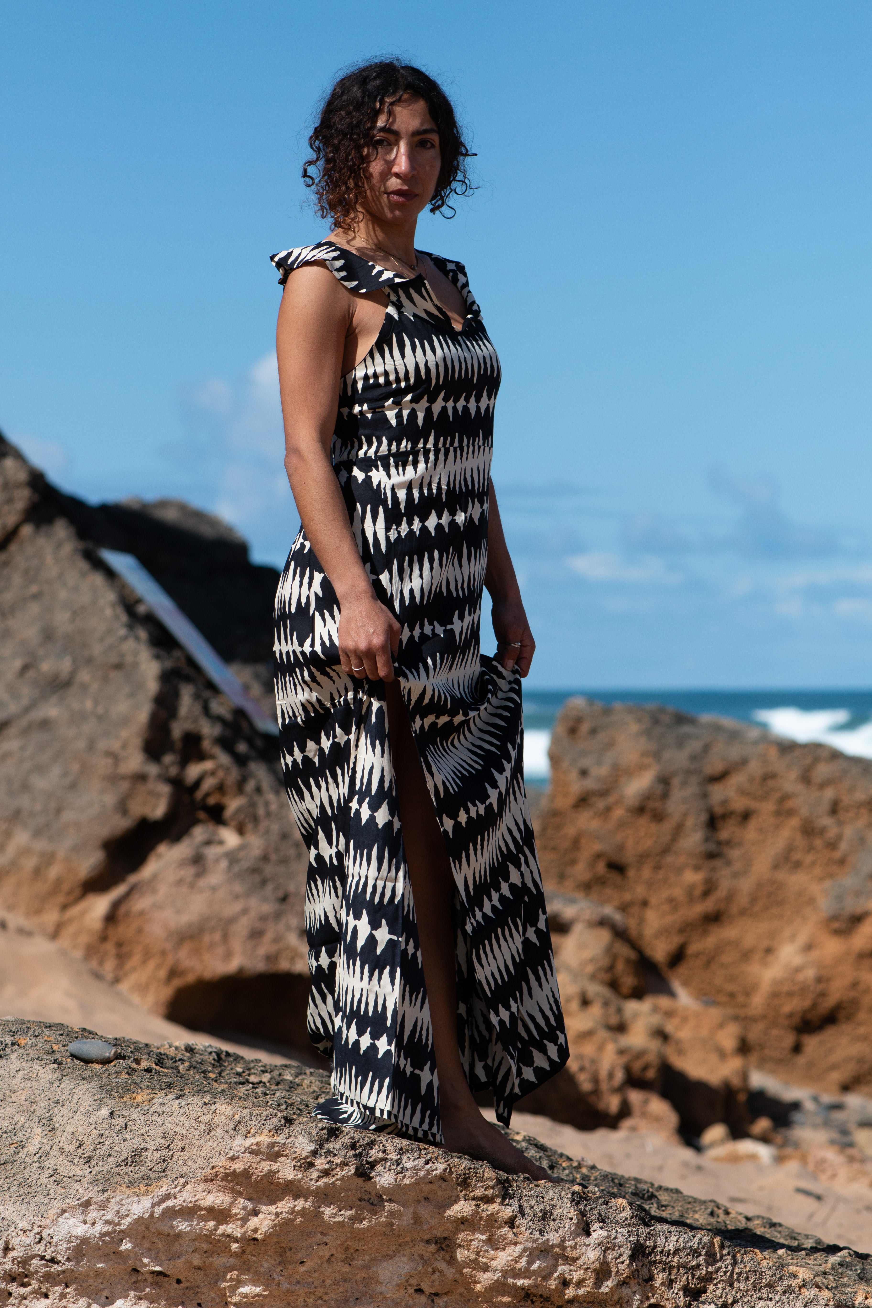 Fluido e versátil, este vestido feito em rayon adapta-se perfeitamente do tamanho 36 ao 40, oferecendo conforto e elegância.