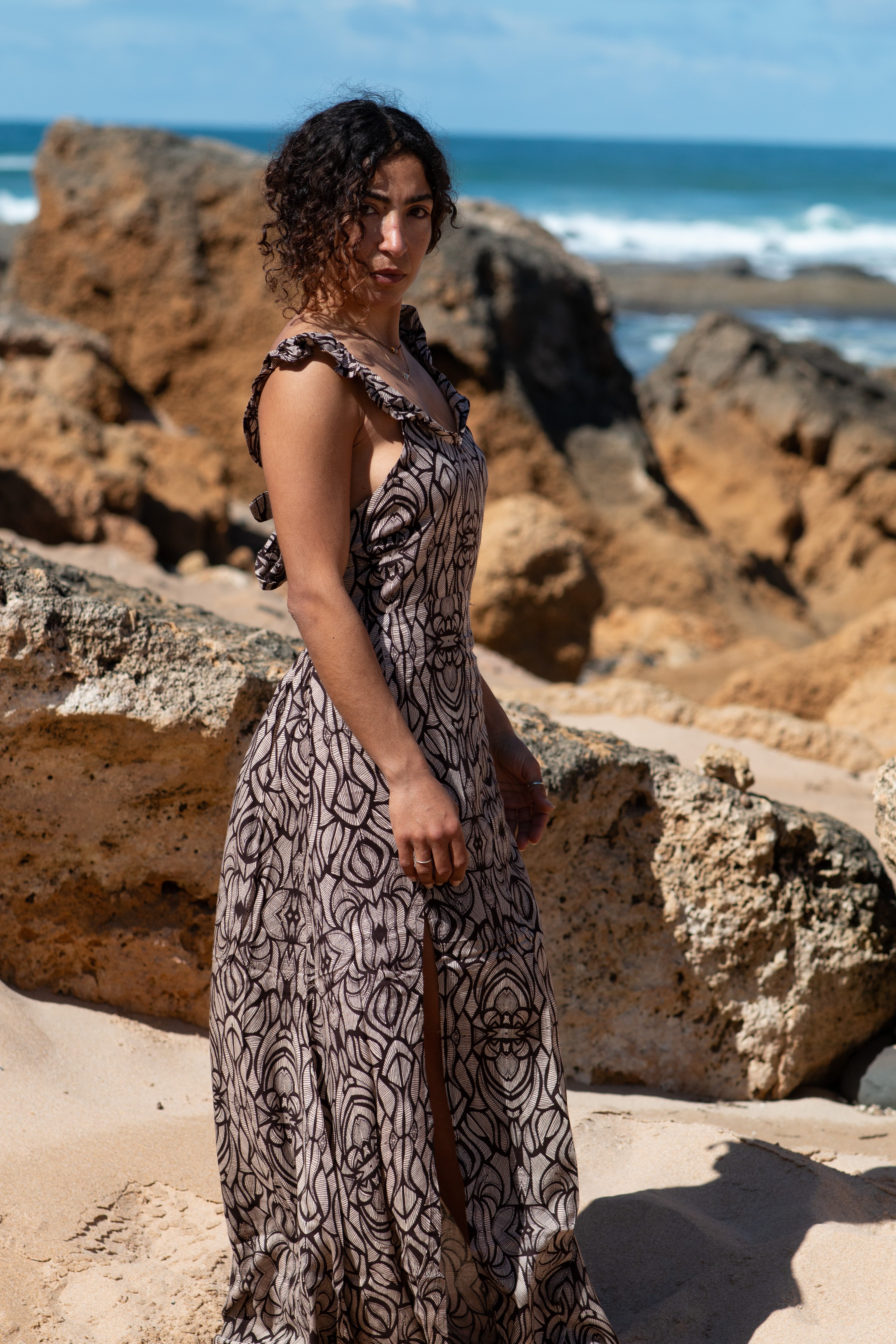 Fluido e versátil, este vestido feito em rayon adapta-se perfeitamente do tamanho 36 ao 40, oferecendo conforto e elegância.