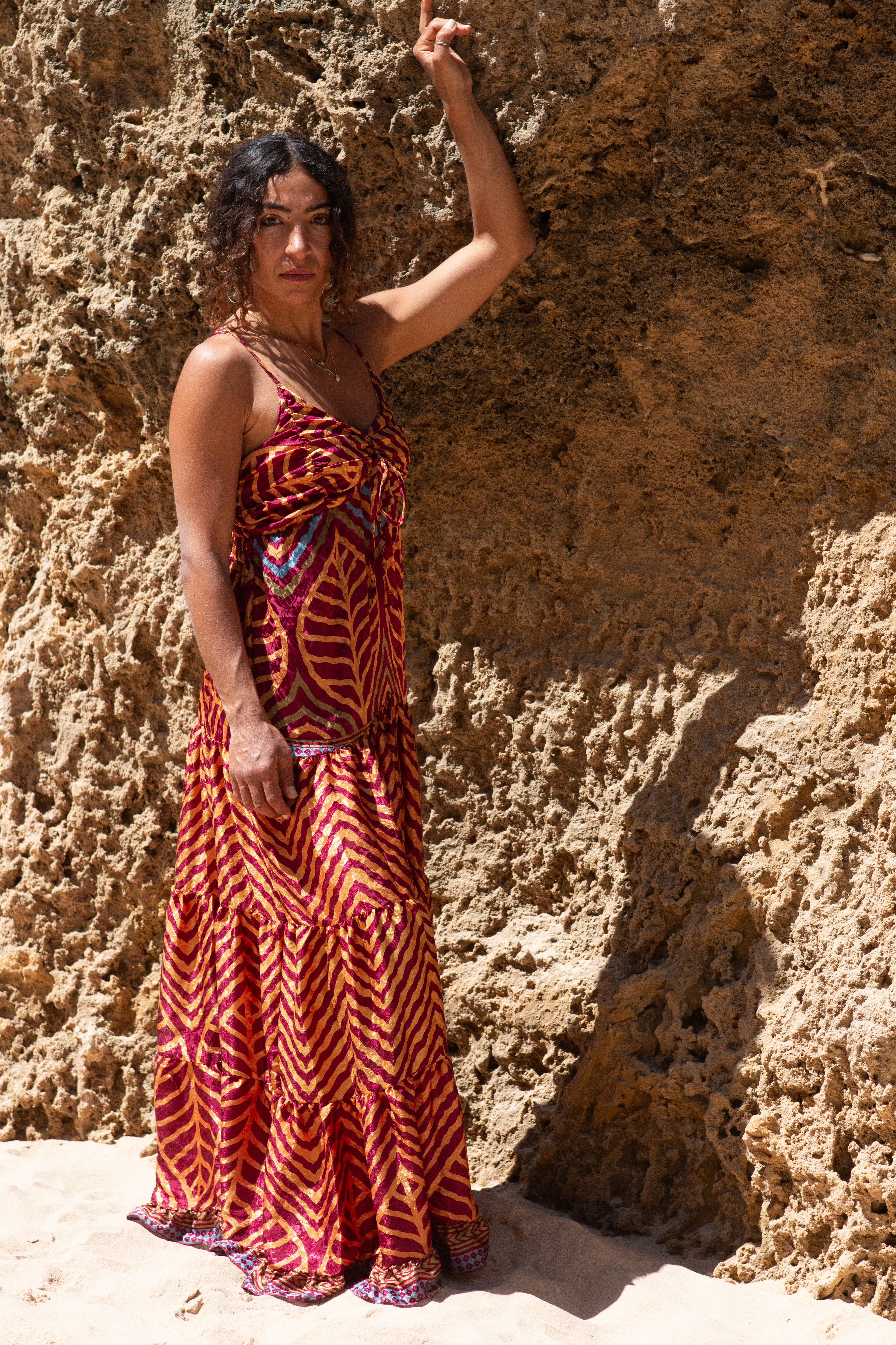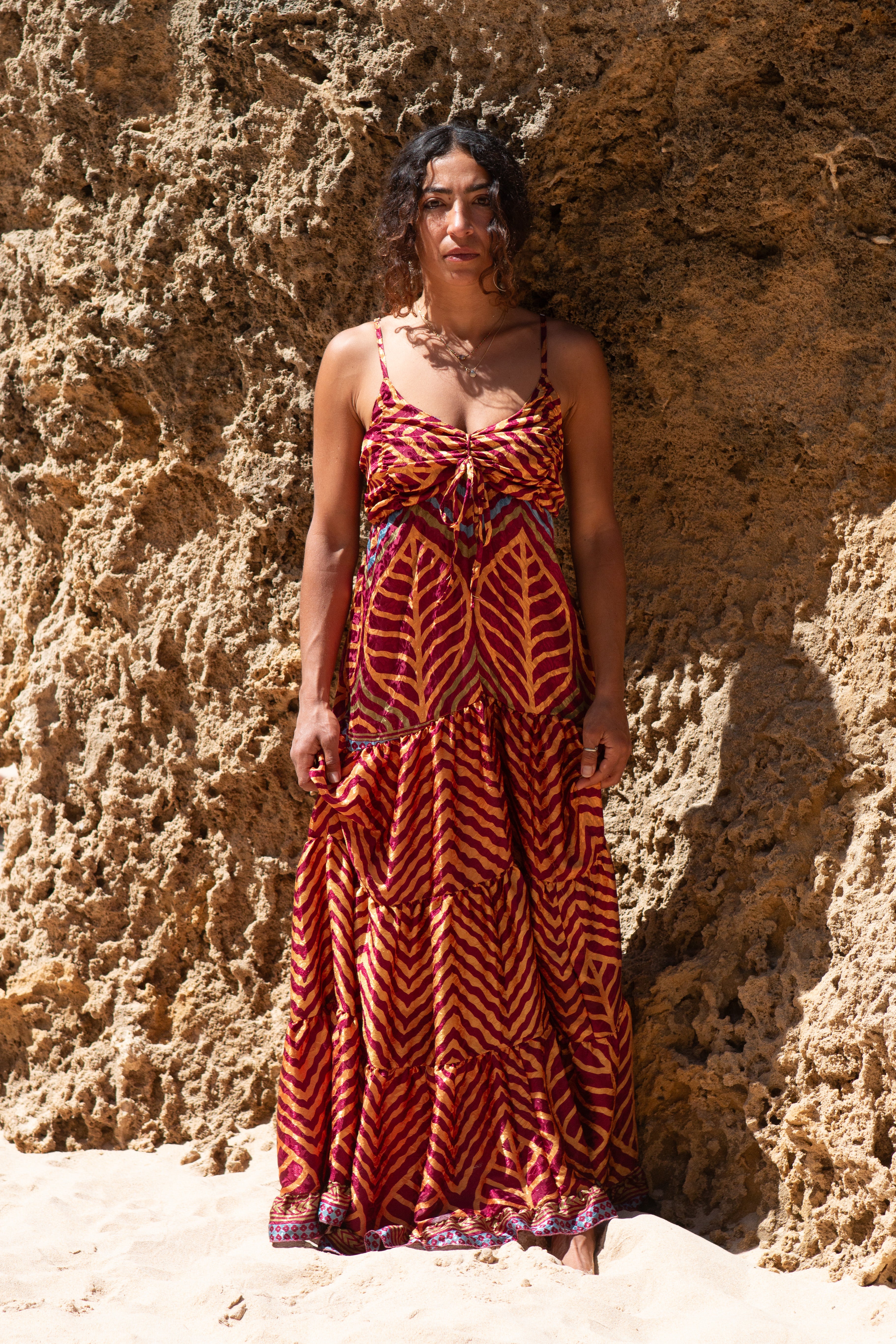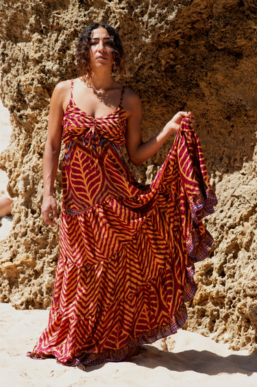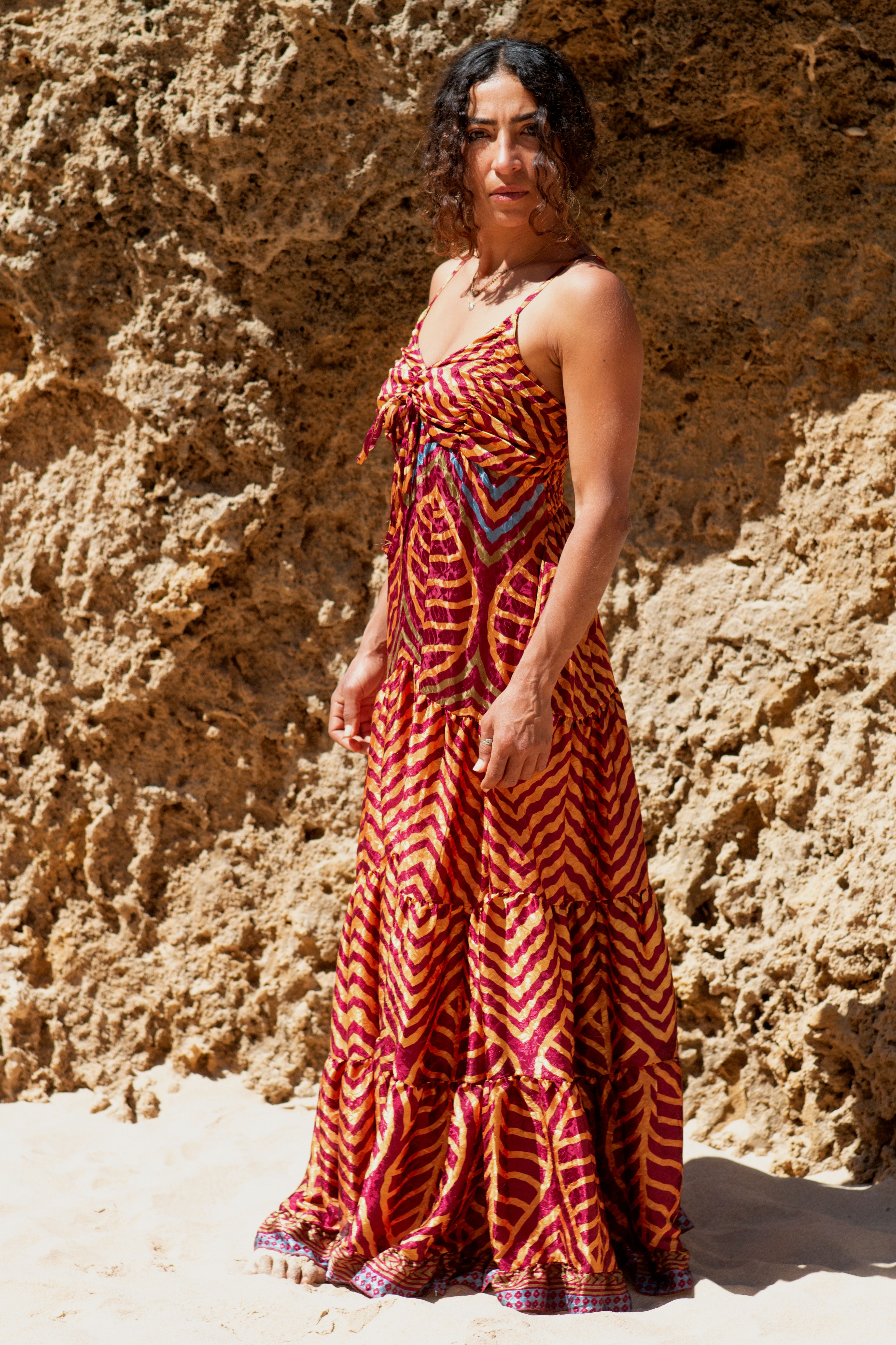 Vestido confecionado a partir de sari reciclado.
