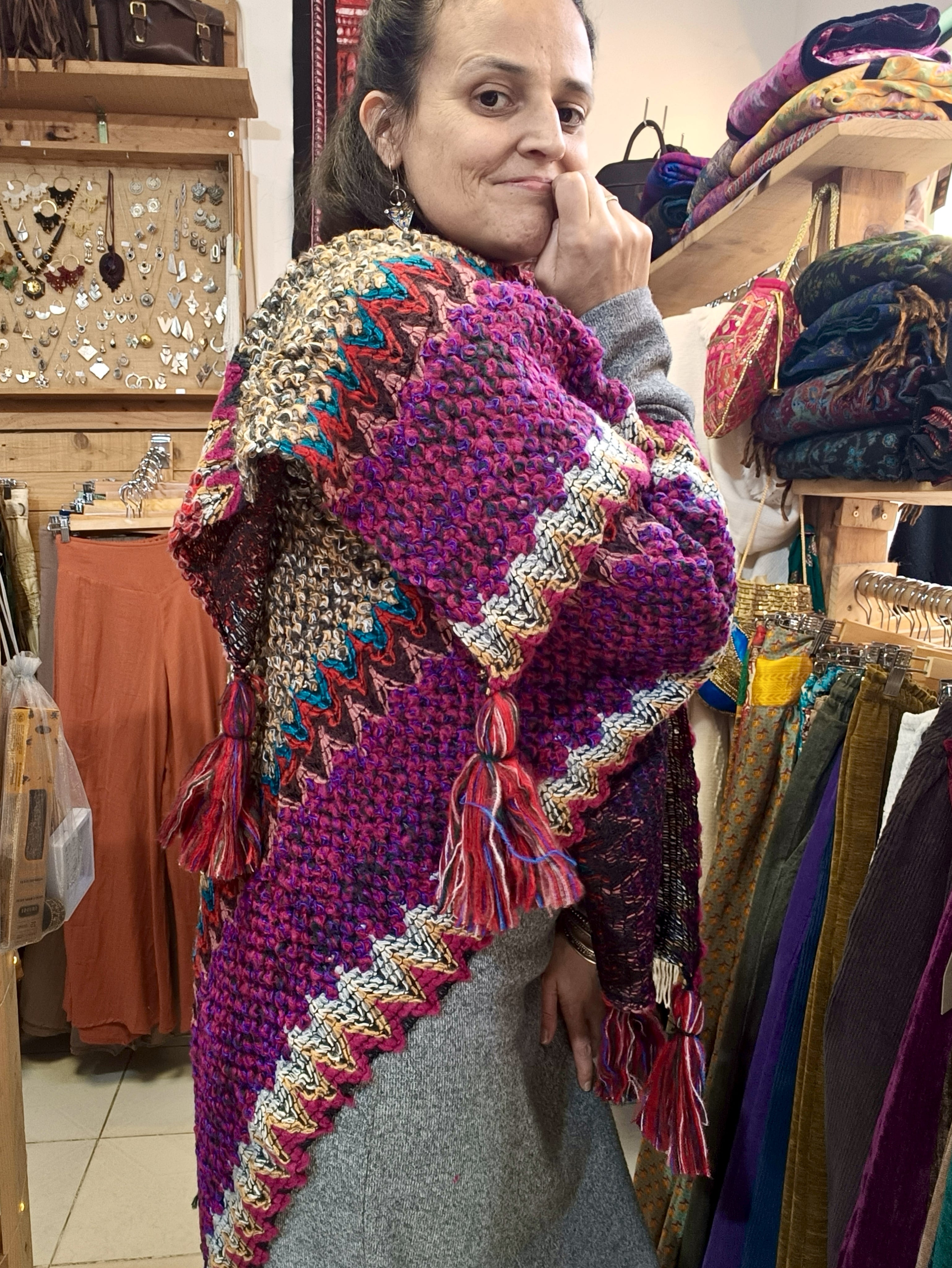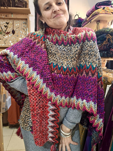 Xaile quente e confortável, em mistura de lã e acrílico, com padrões coloridos e cheios de personalidade.