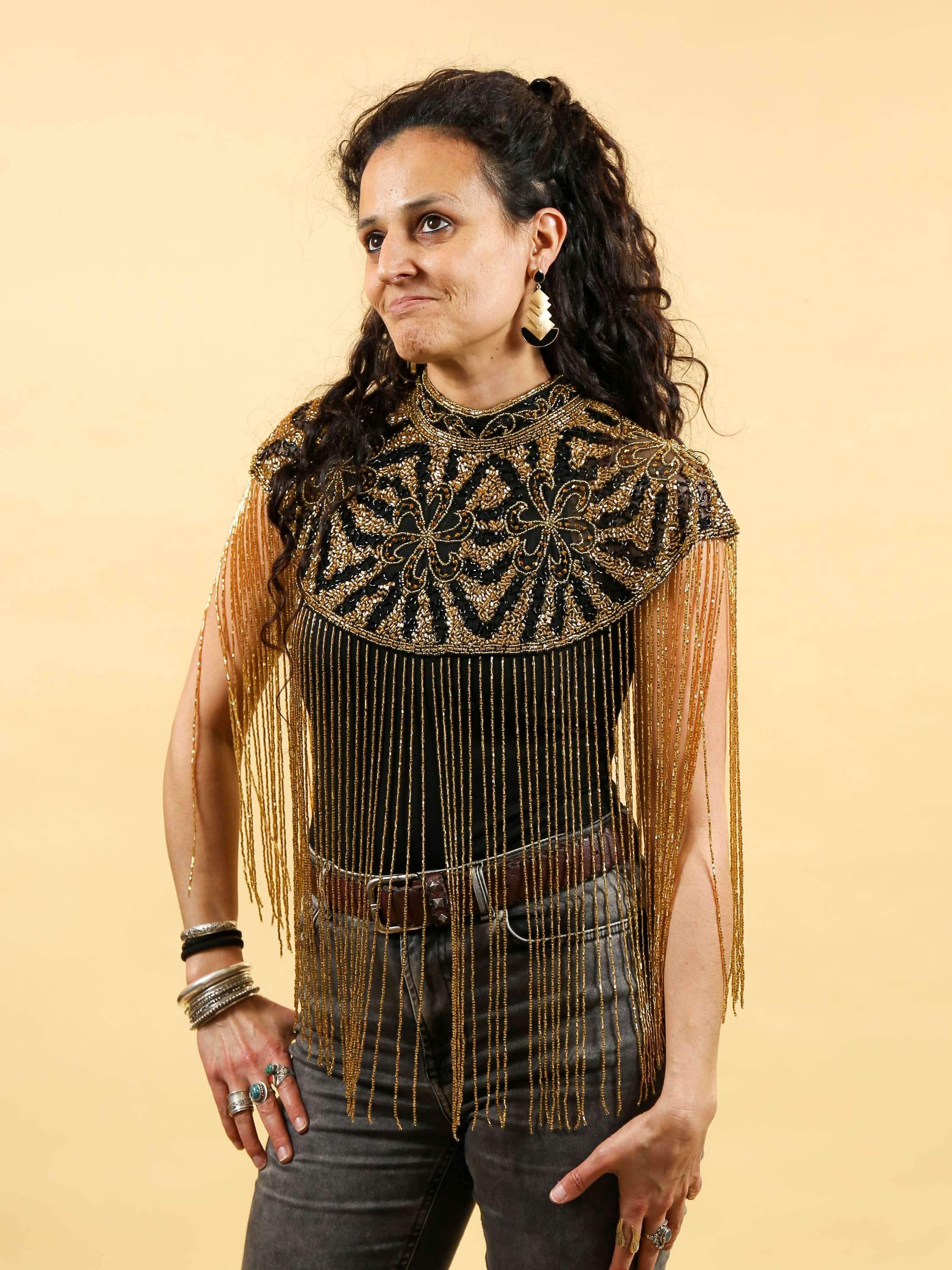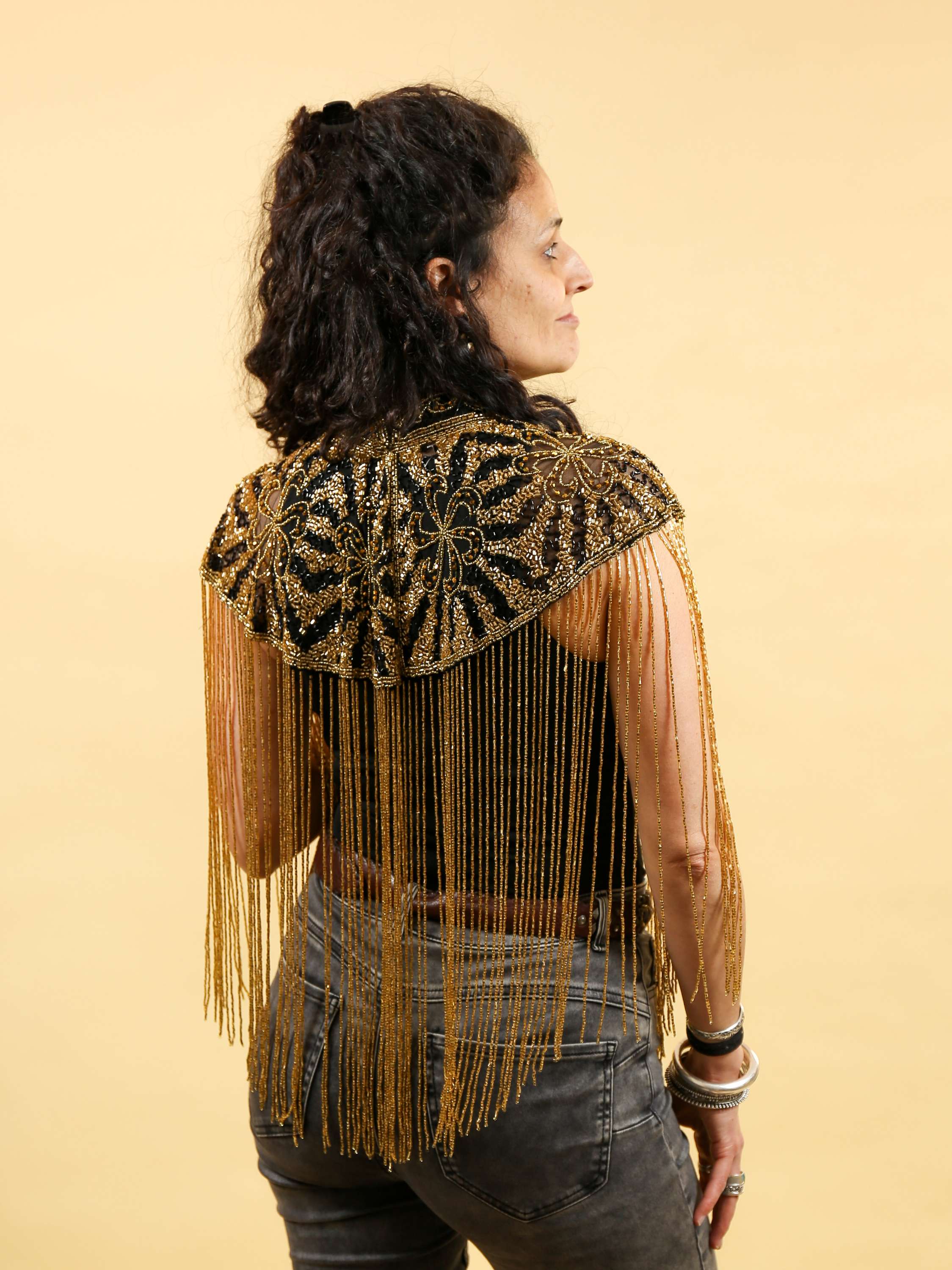 O deslumbrante Xaile Afrodite é uma peça artesanal elaborada à mão, com bordados ricos e detalhes delicados que o ornam verdadeiramente único.