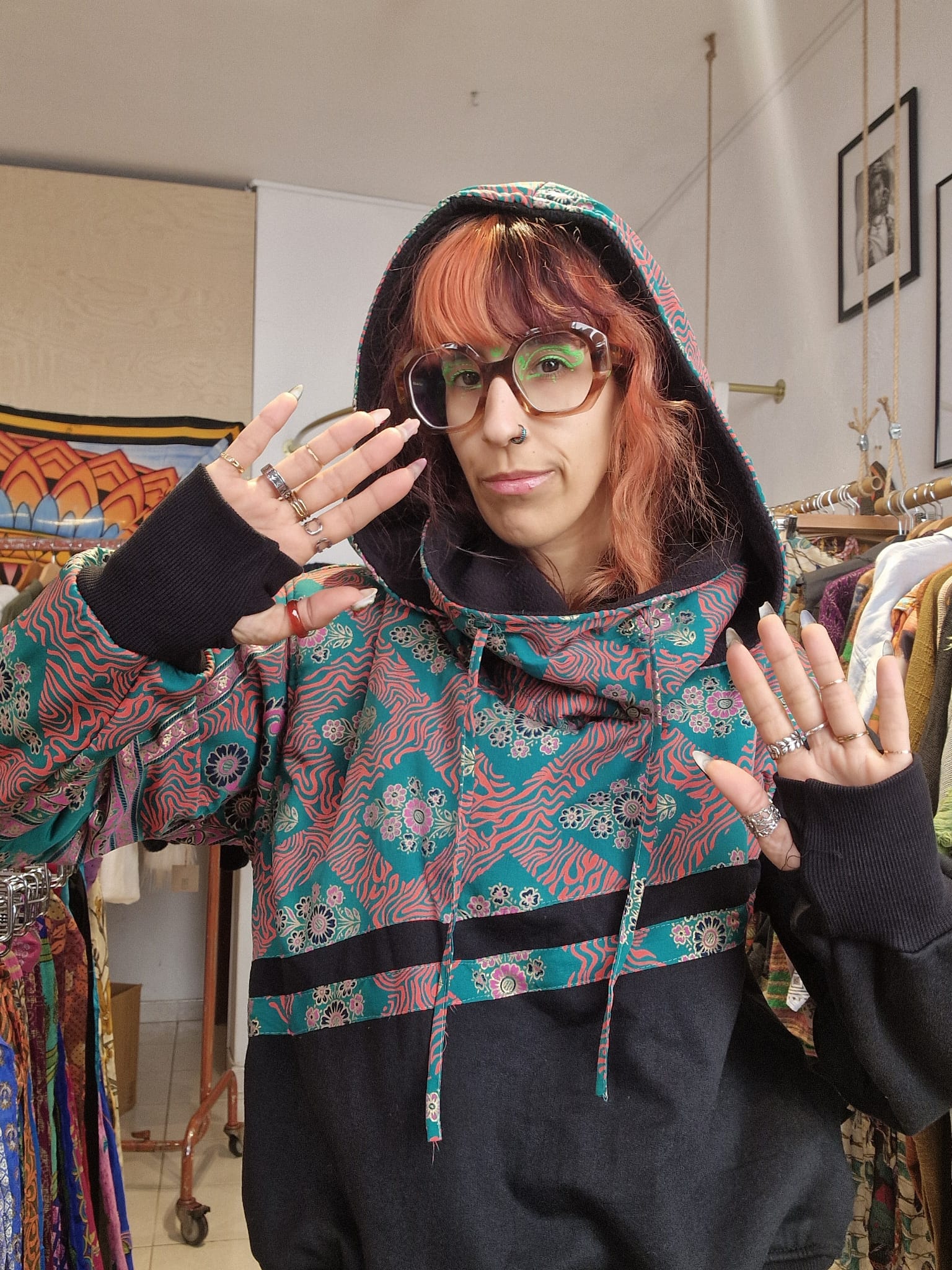 The unique design includes a generous collar, wide hood, and a functional detail on the sleeve for finger fitting.