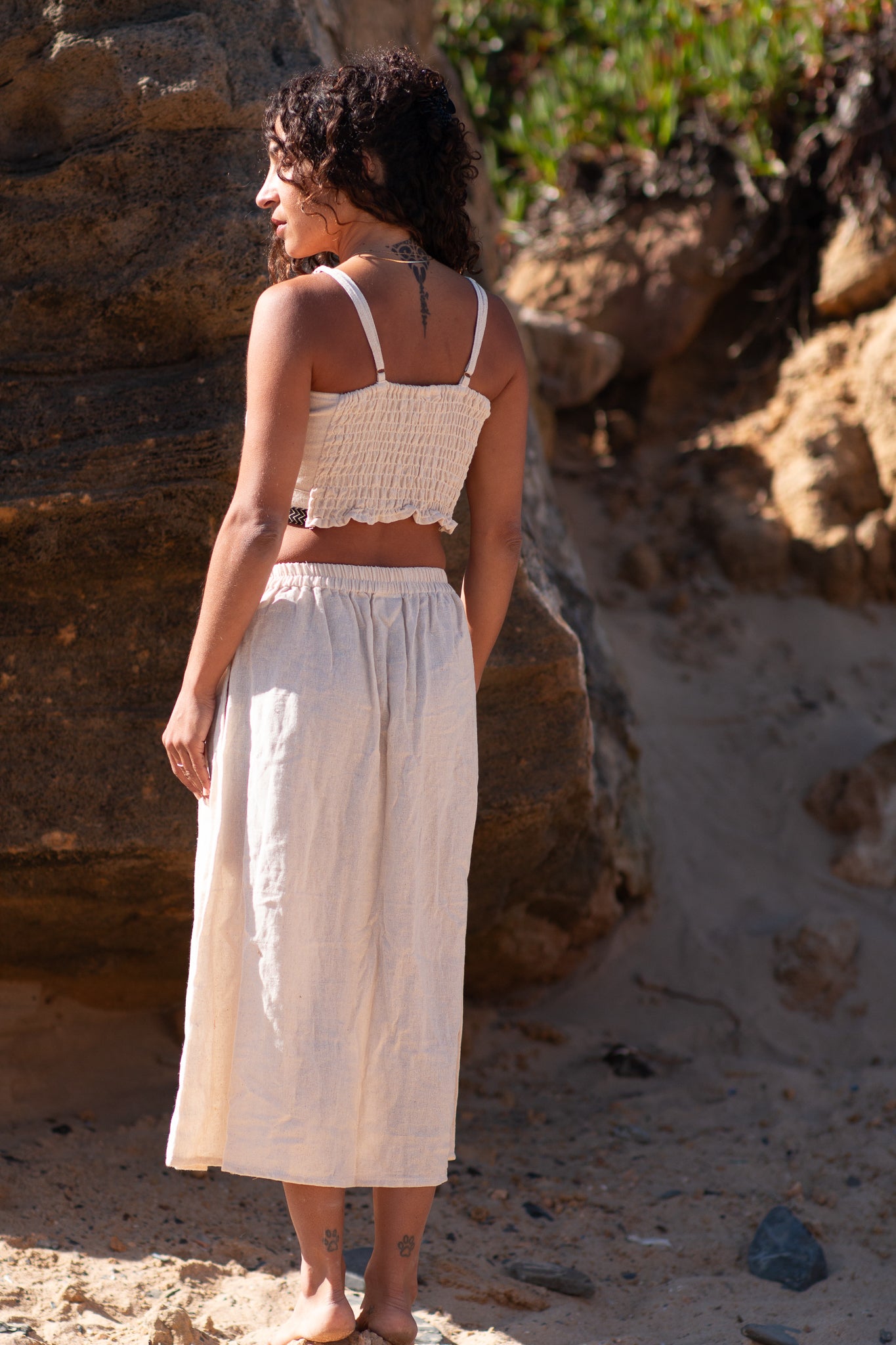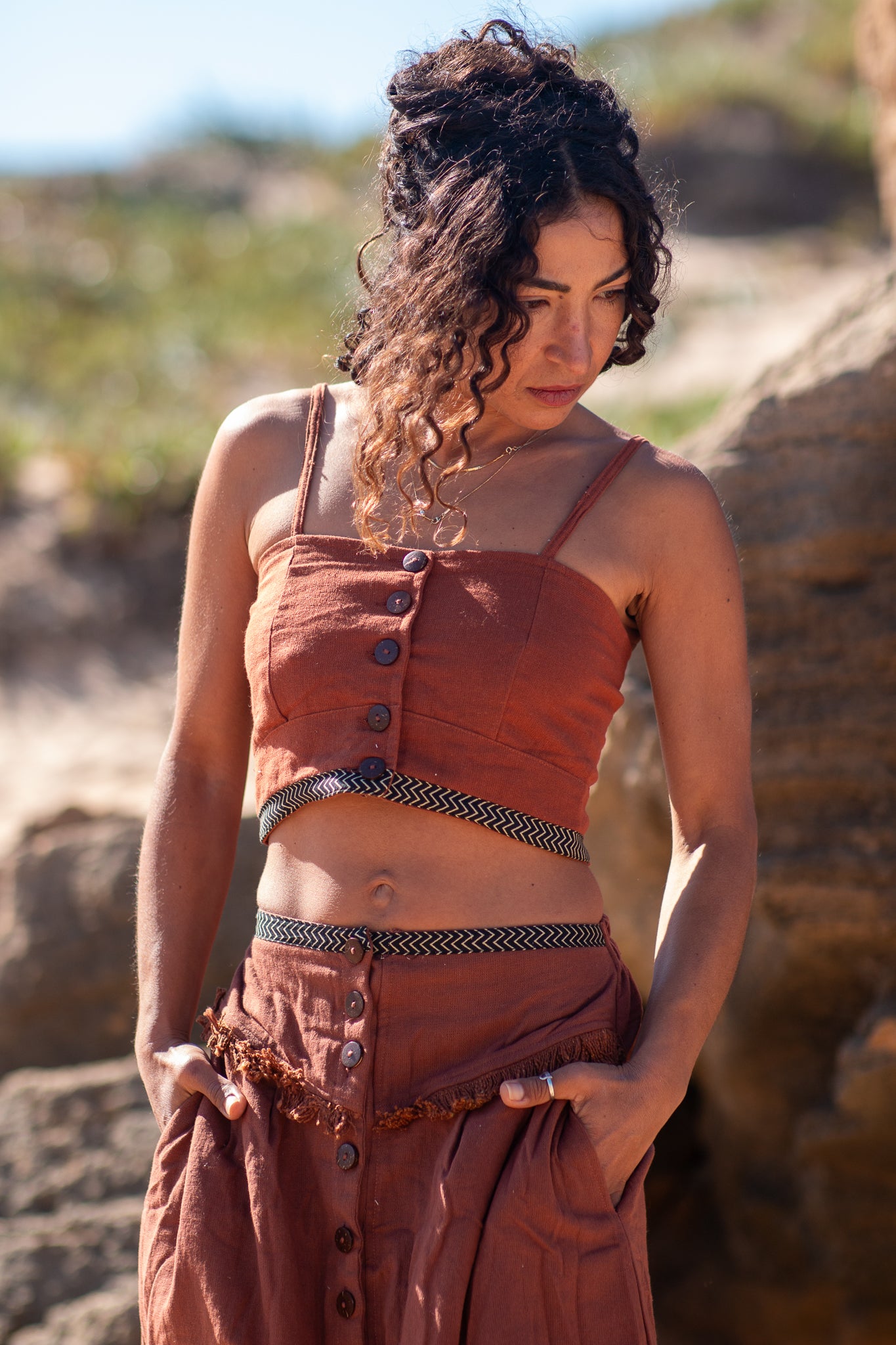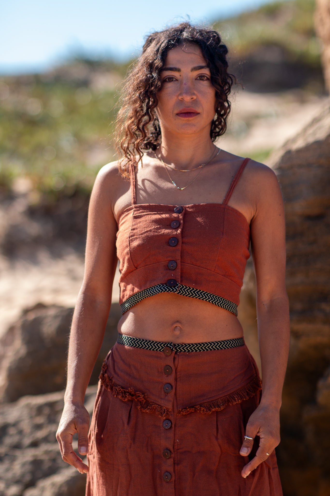 O top Reva é um crop top étnico em algodão, com alças finas, corte estruturado tipo corpete e botões de coco ao centro - detalhes artesanais que transformam uma peça simples numa declaração de estilo inconfundível.
