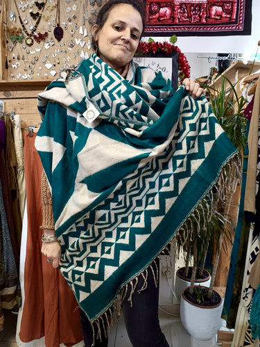 Estas bufandas presentan patrones geométricos de estilo azteca. Su tacto es muy suave y envolvente, ideal para los días fríos y la tela permite usarlas de diferentes maneras.