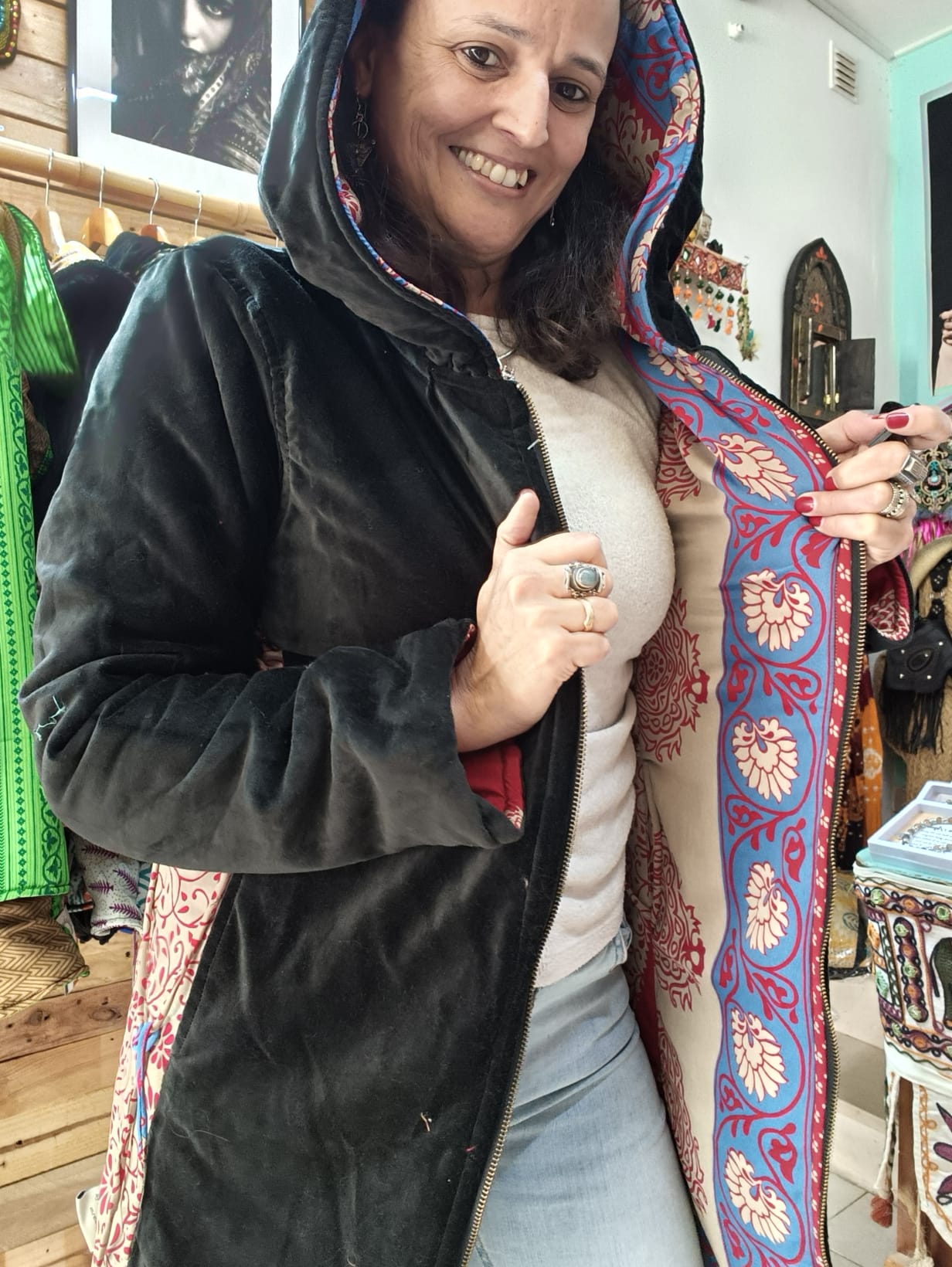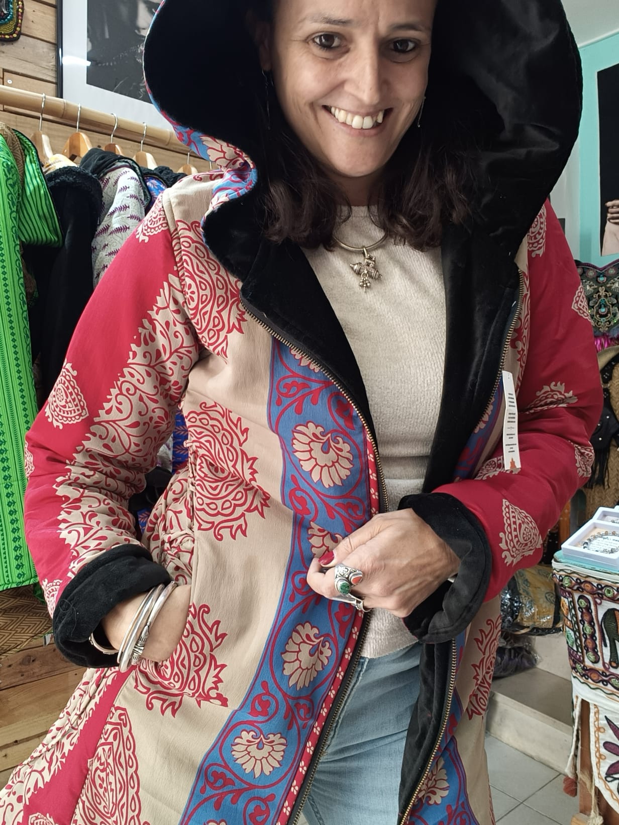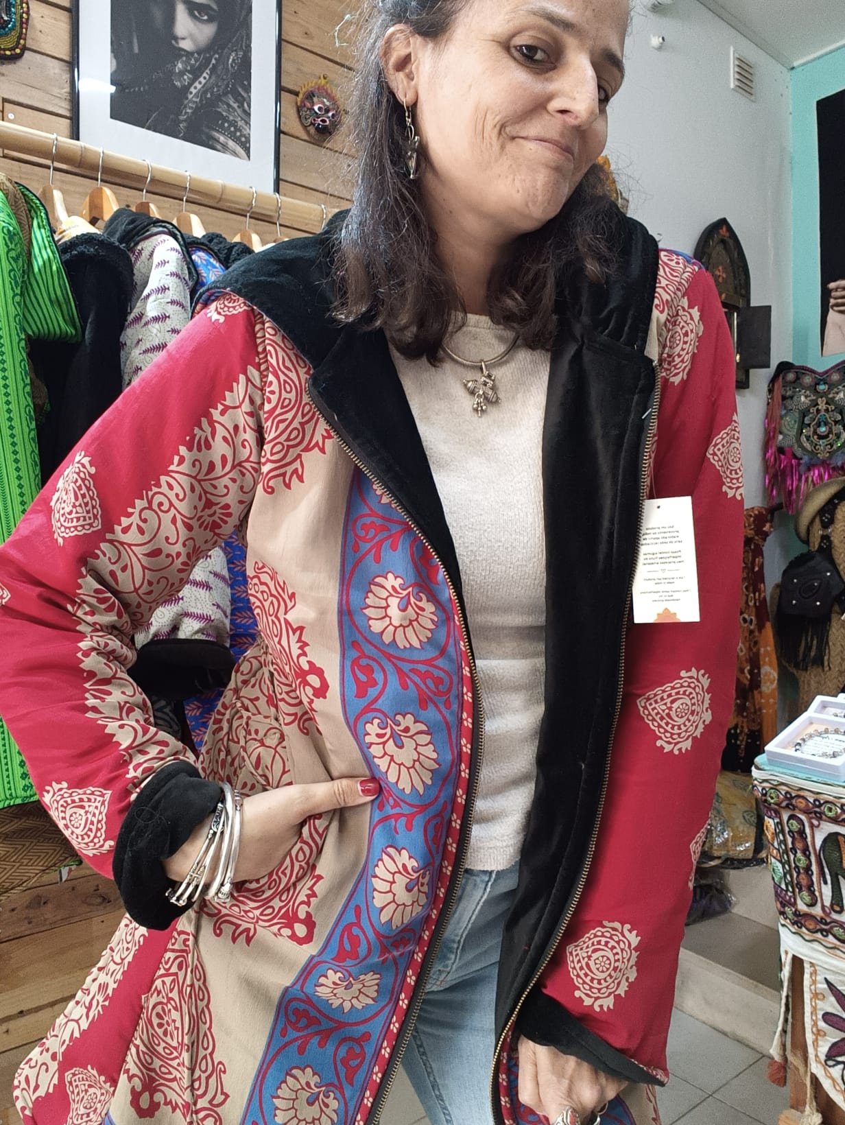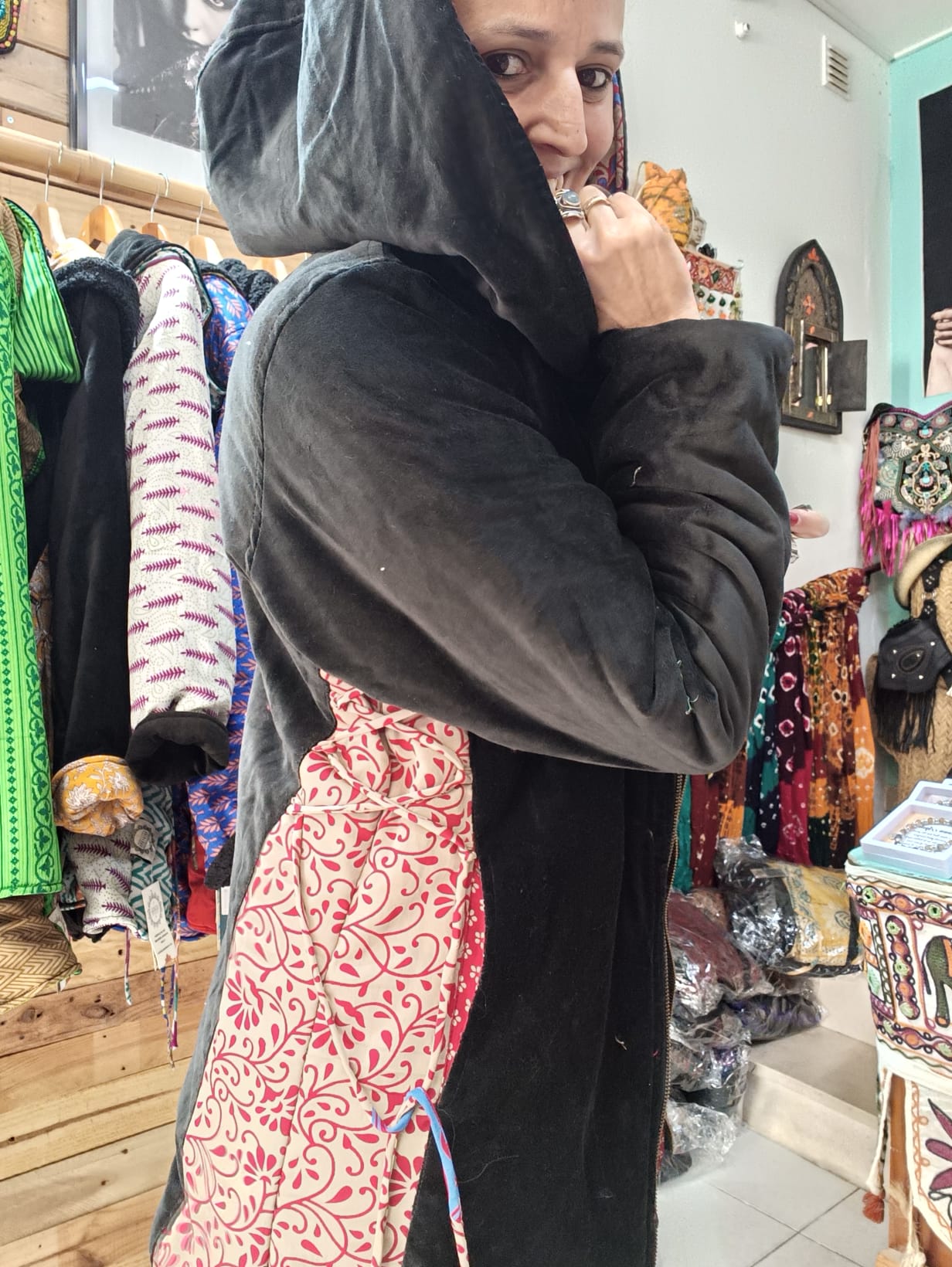 Durante el invierno, para ofrecer piezas cálidas y cómodas, elaboramos artículos con algodón cardado y forro polar, con detalles en sari.