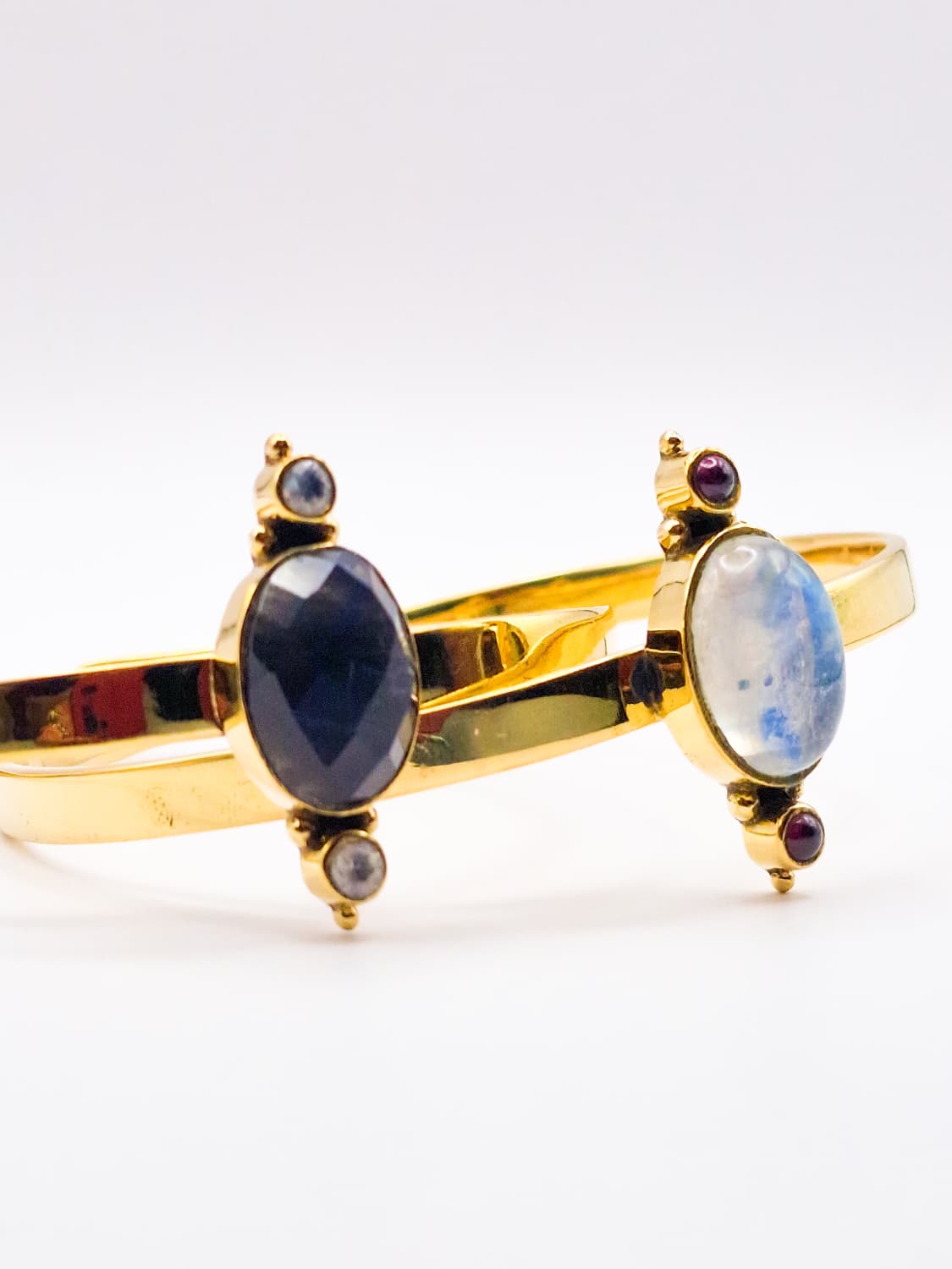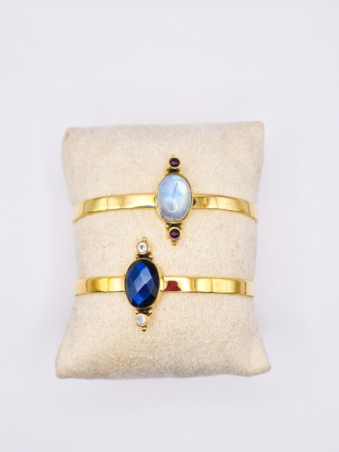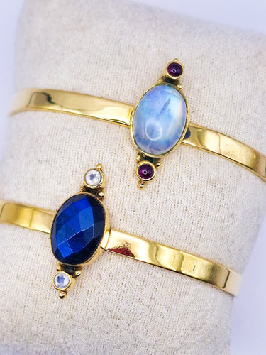 Brazaletes sencillos hechos en latón con detalles de cristales.