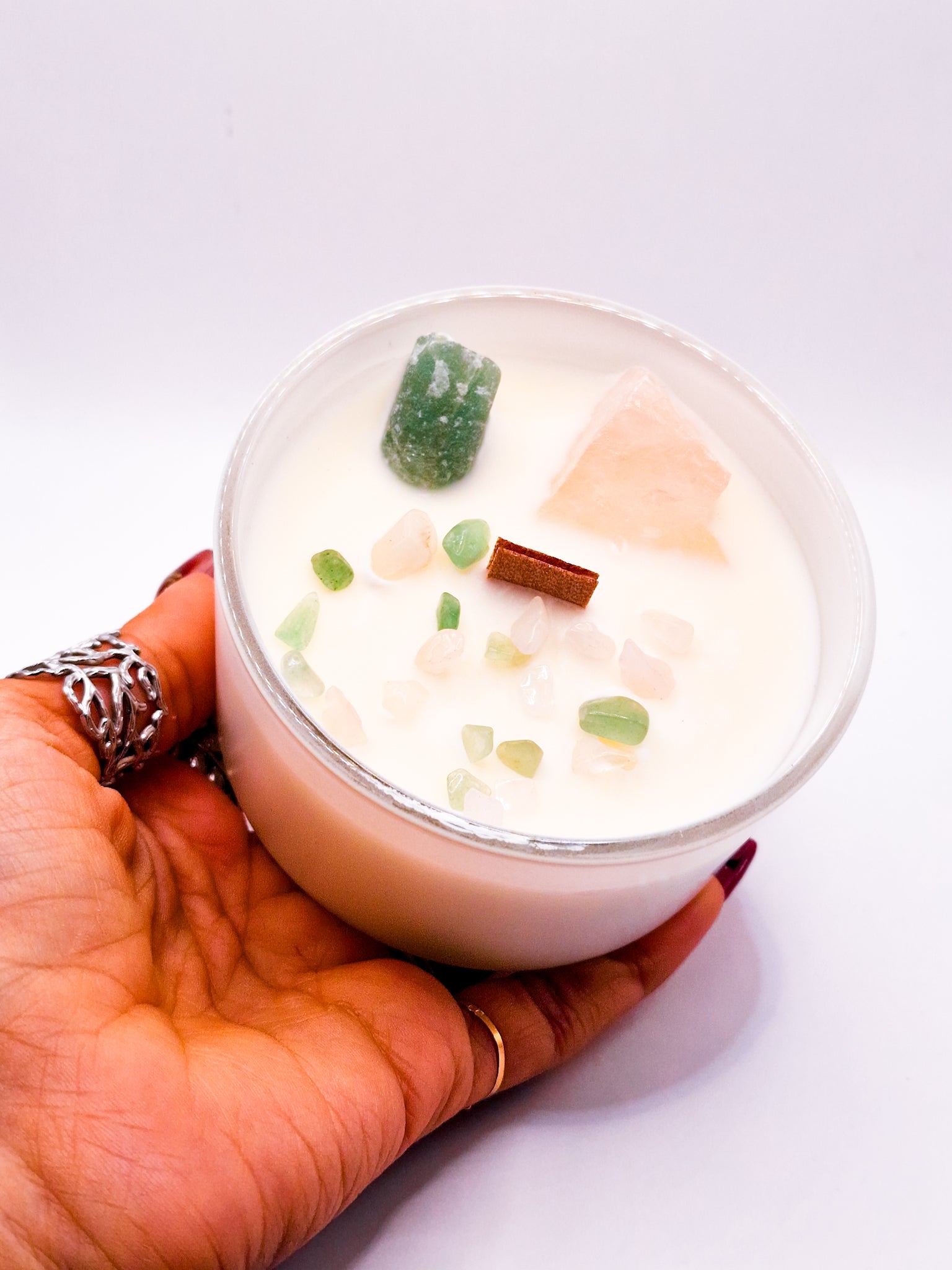 Con Cuarzo Rosa y Cristal de Jade reconocidos por estimular el amor, la compasión y la sanación emocional.