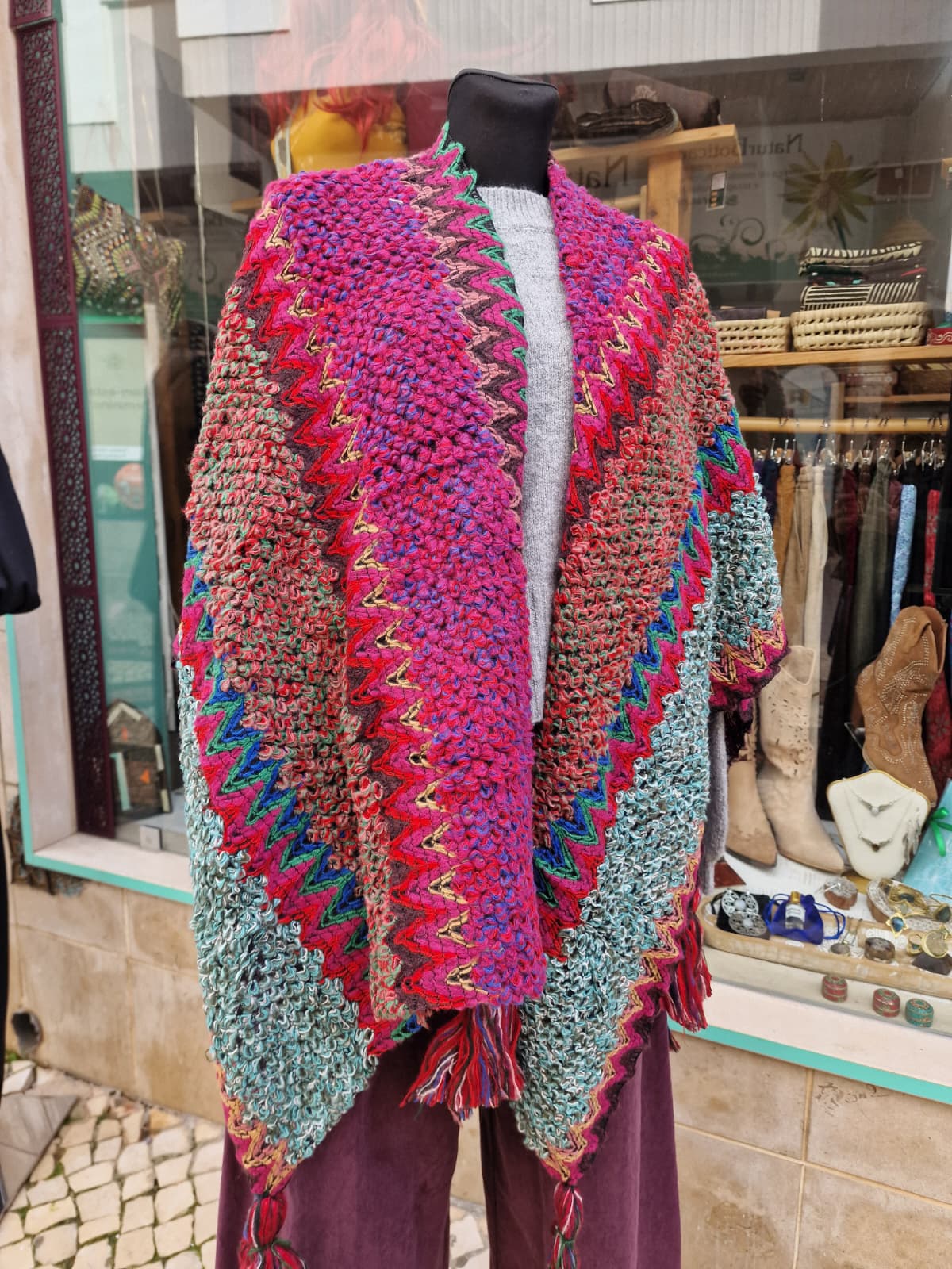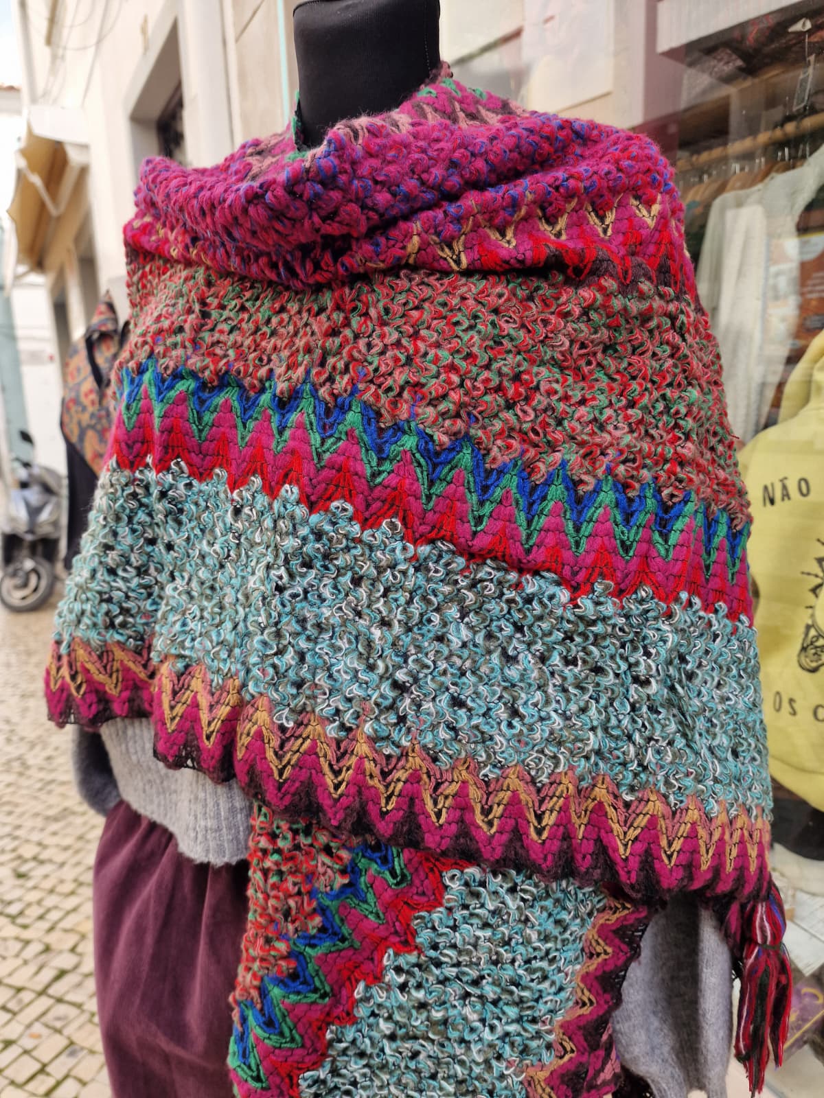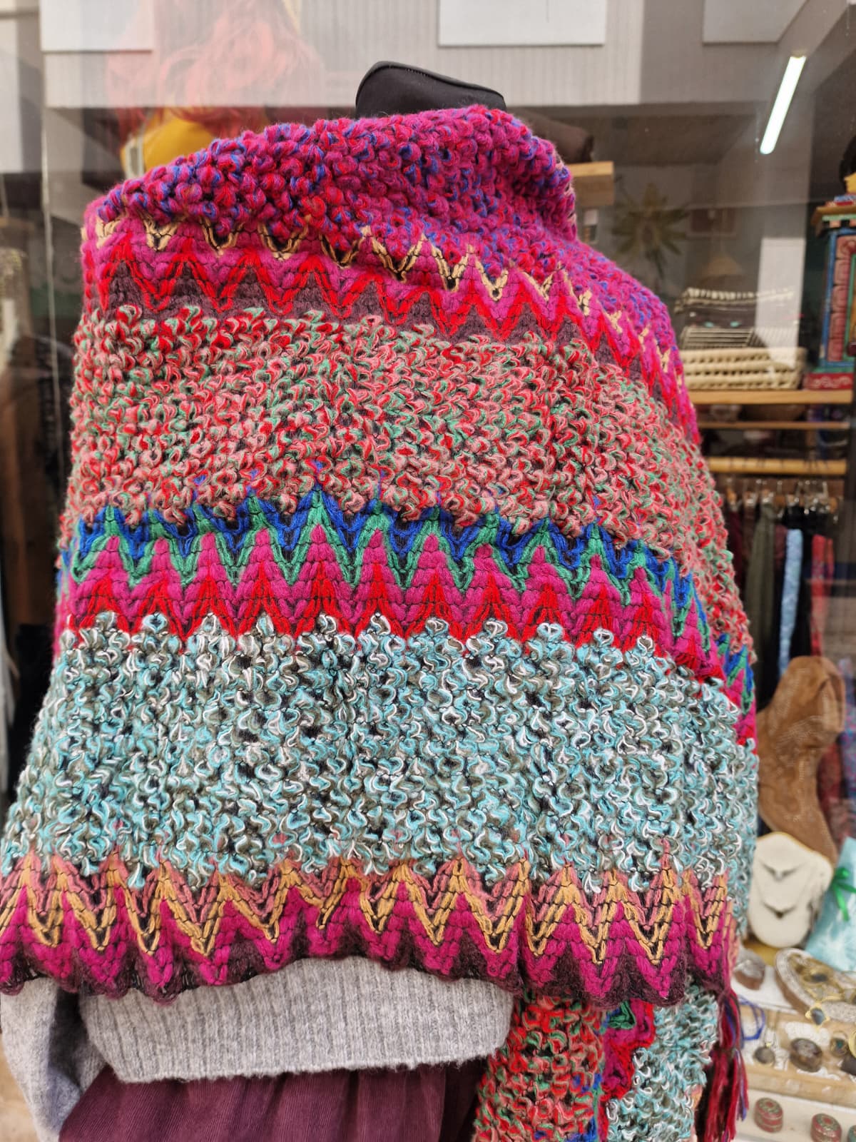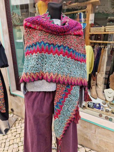 Châle chaud et confortable, en mélange de laine et d'acrylique, avec des motifs colorés et pleins de personnalité.