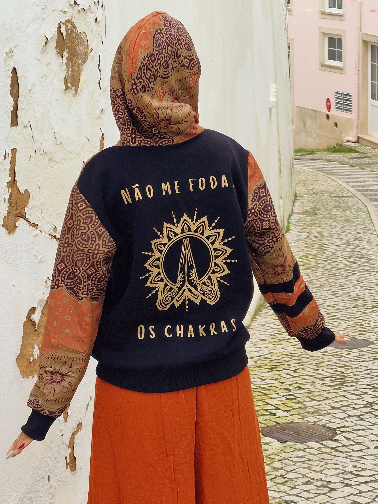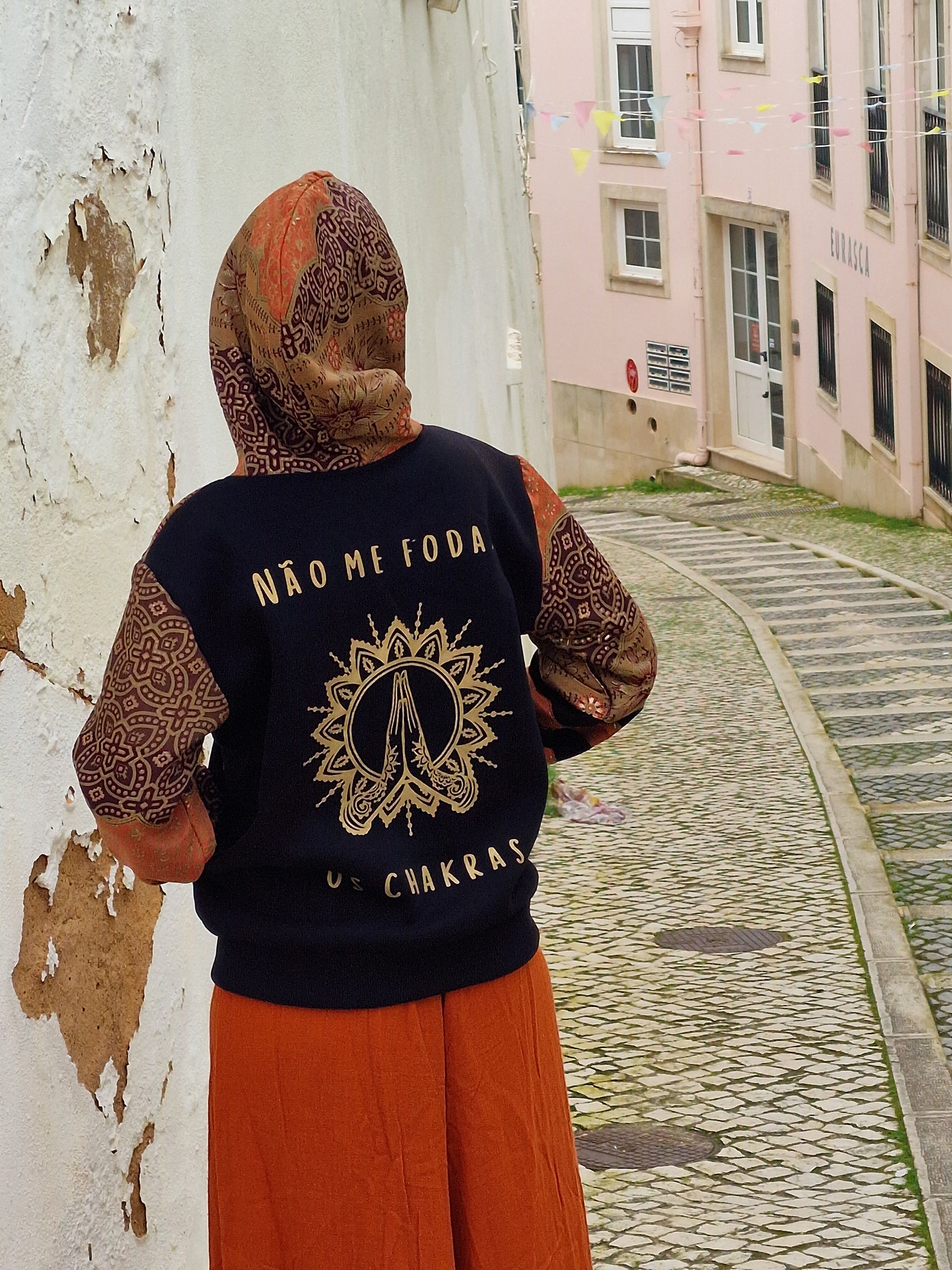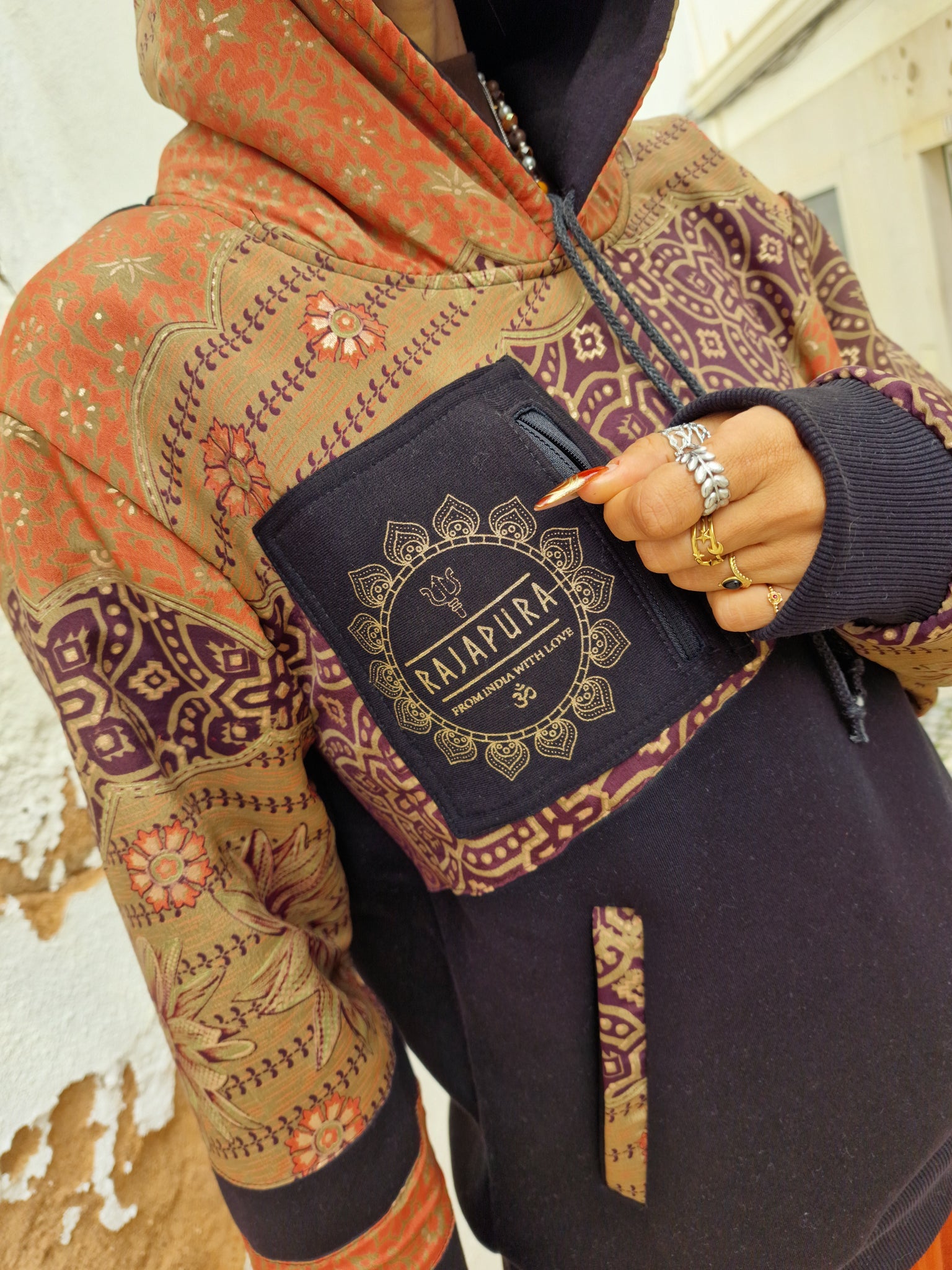 Conçu pour ceux qui vivent avec attitude et ne baissent jamais leur vibration, ce hoodie associe un coton confortable à des manches en sari recyclé, rendant chaque modèle absolument unique. Il n'en existe pas deux identiques !