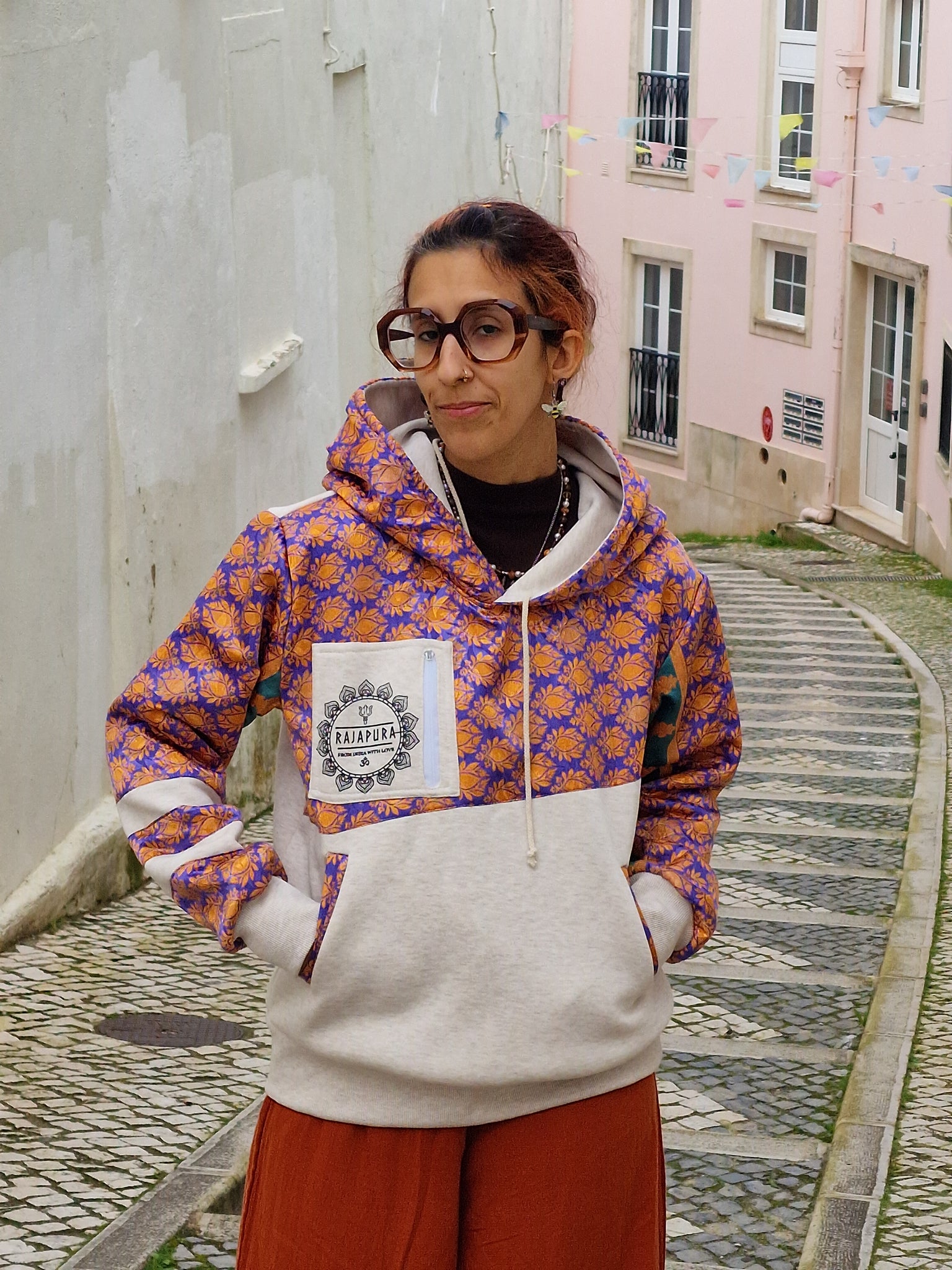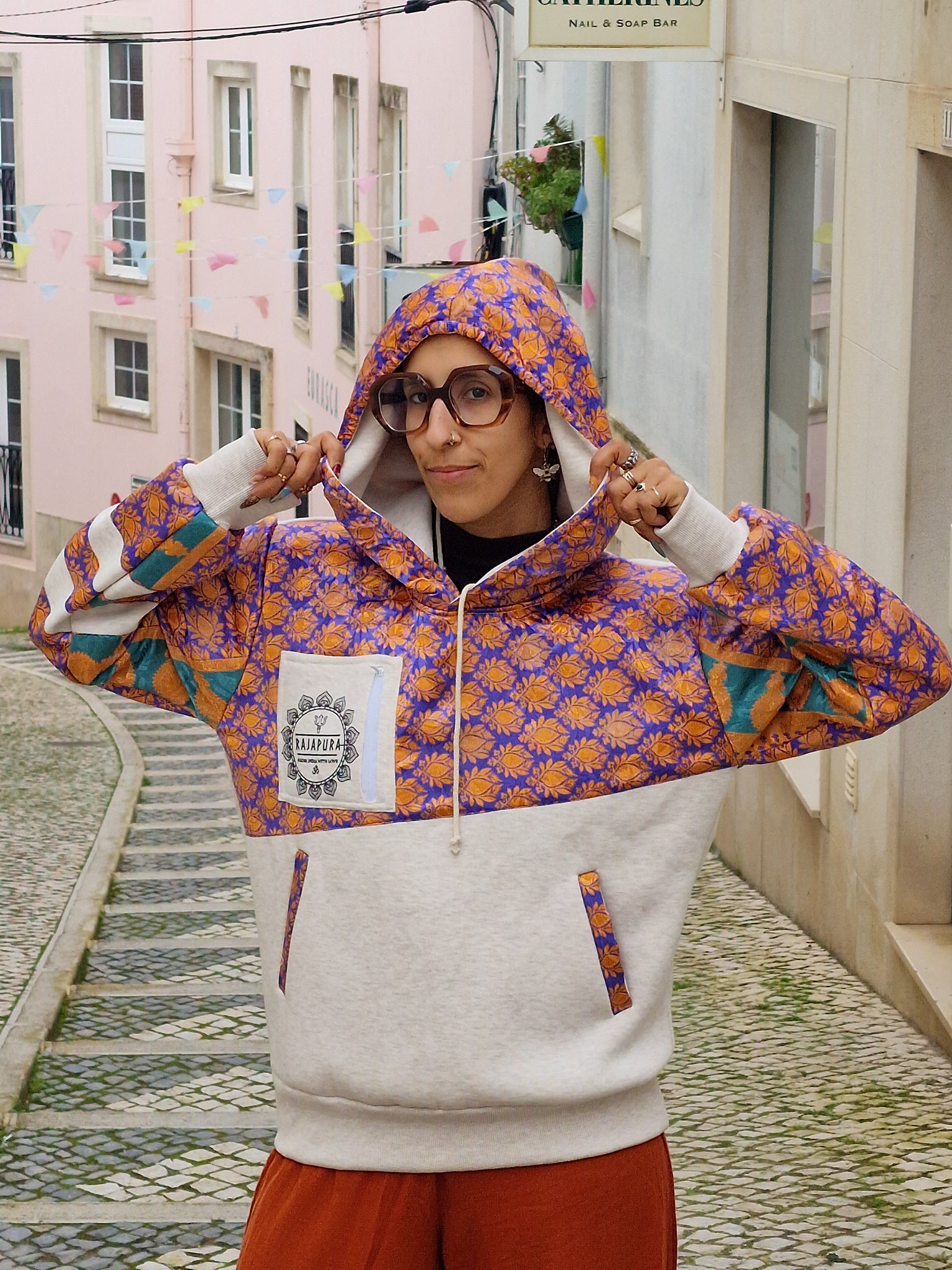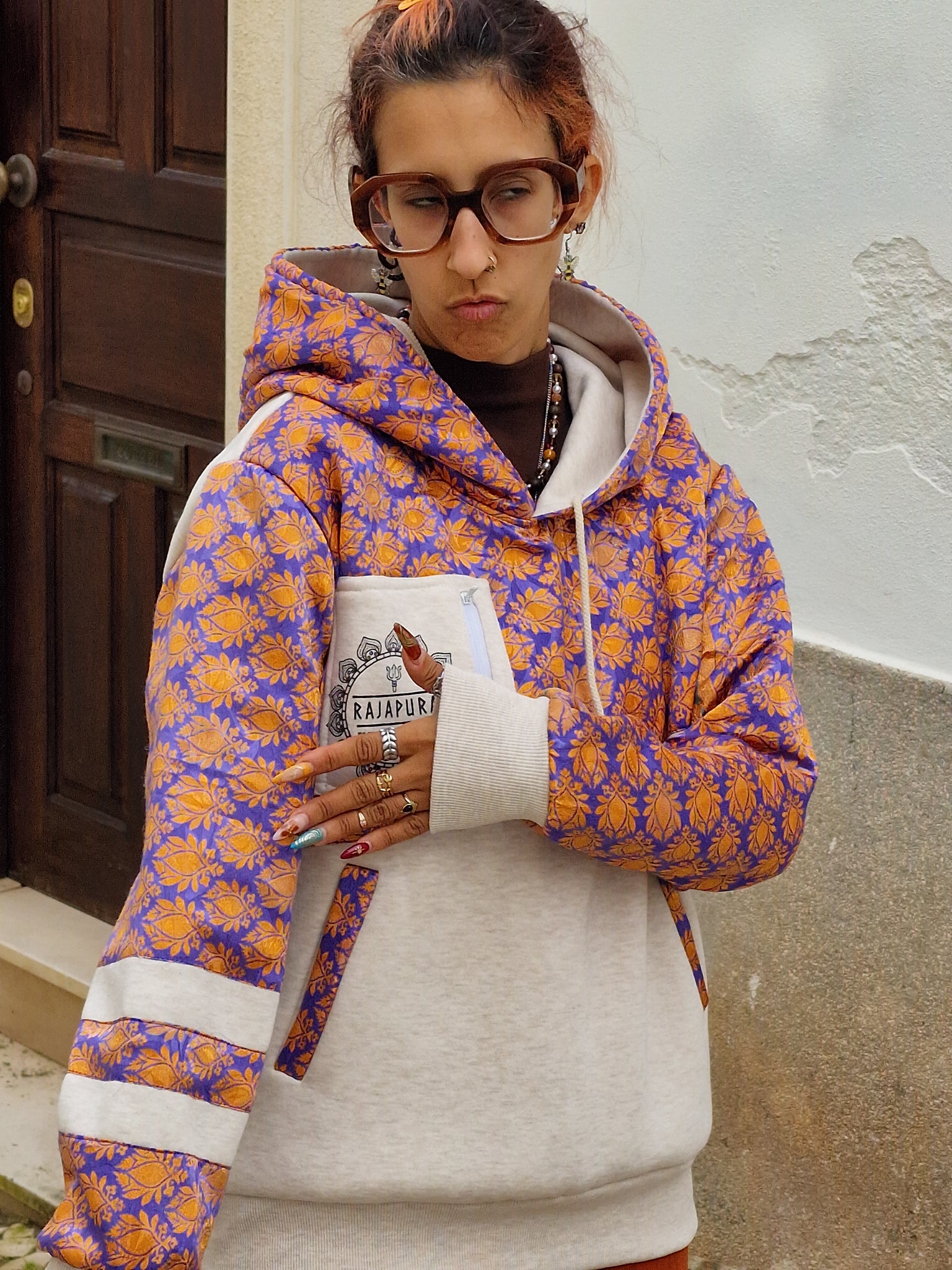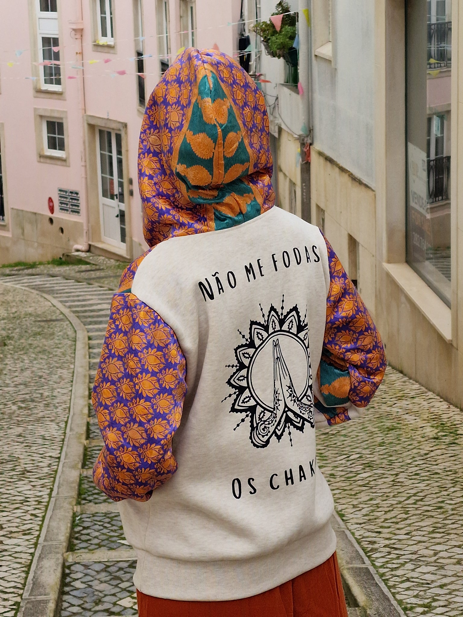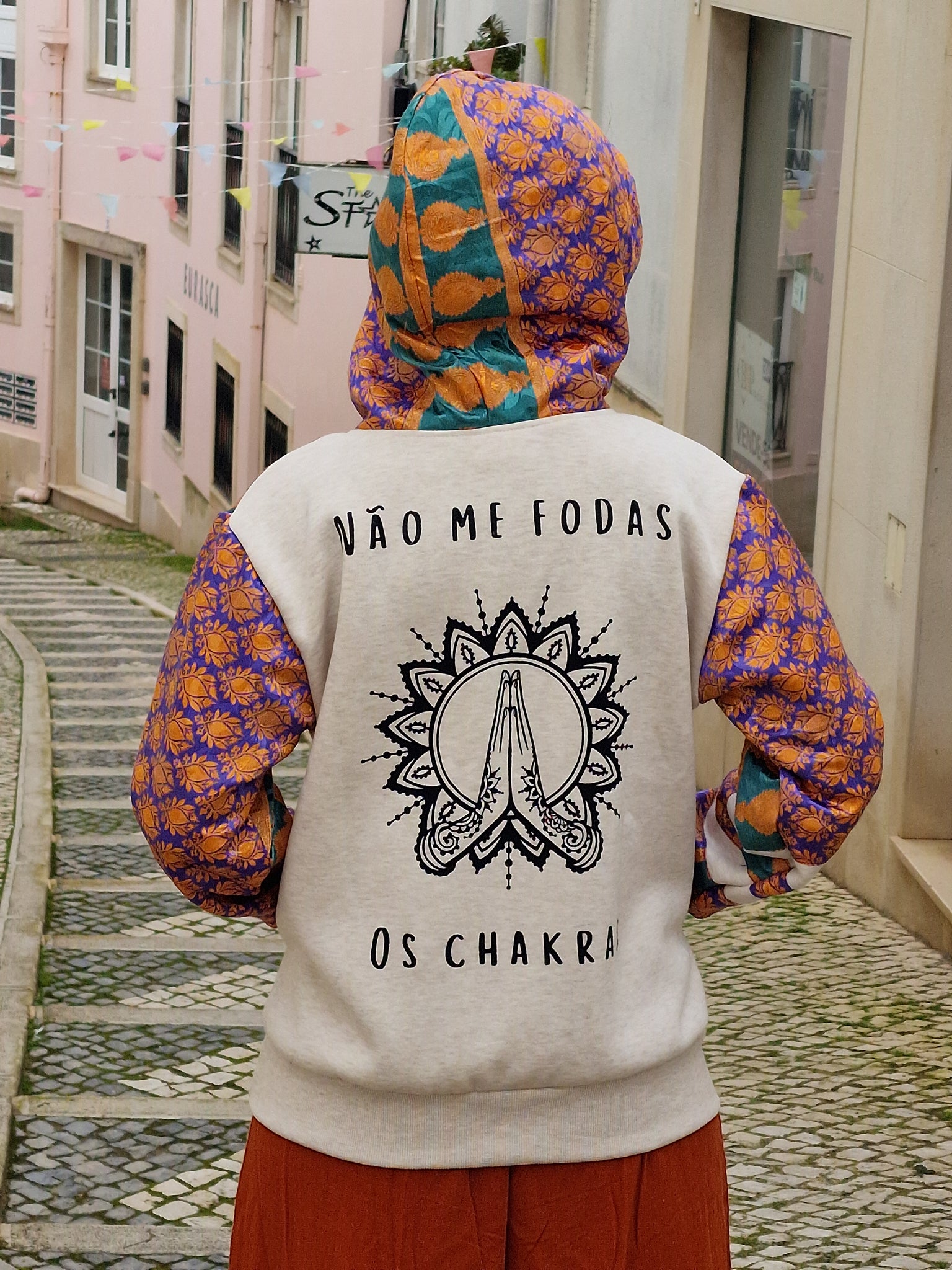 Conçu pour ceux qui vivent avec attitude et ne baissent jamais leur vibration, ce hoodie associe un coton confortable à des manches en sari recyclé, rendant chaque modèle absolument unique. Il n'en existe pas deux identiques !