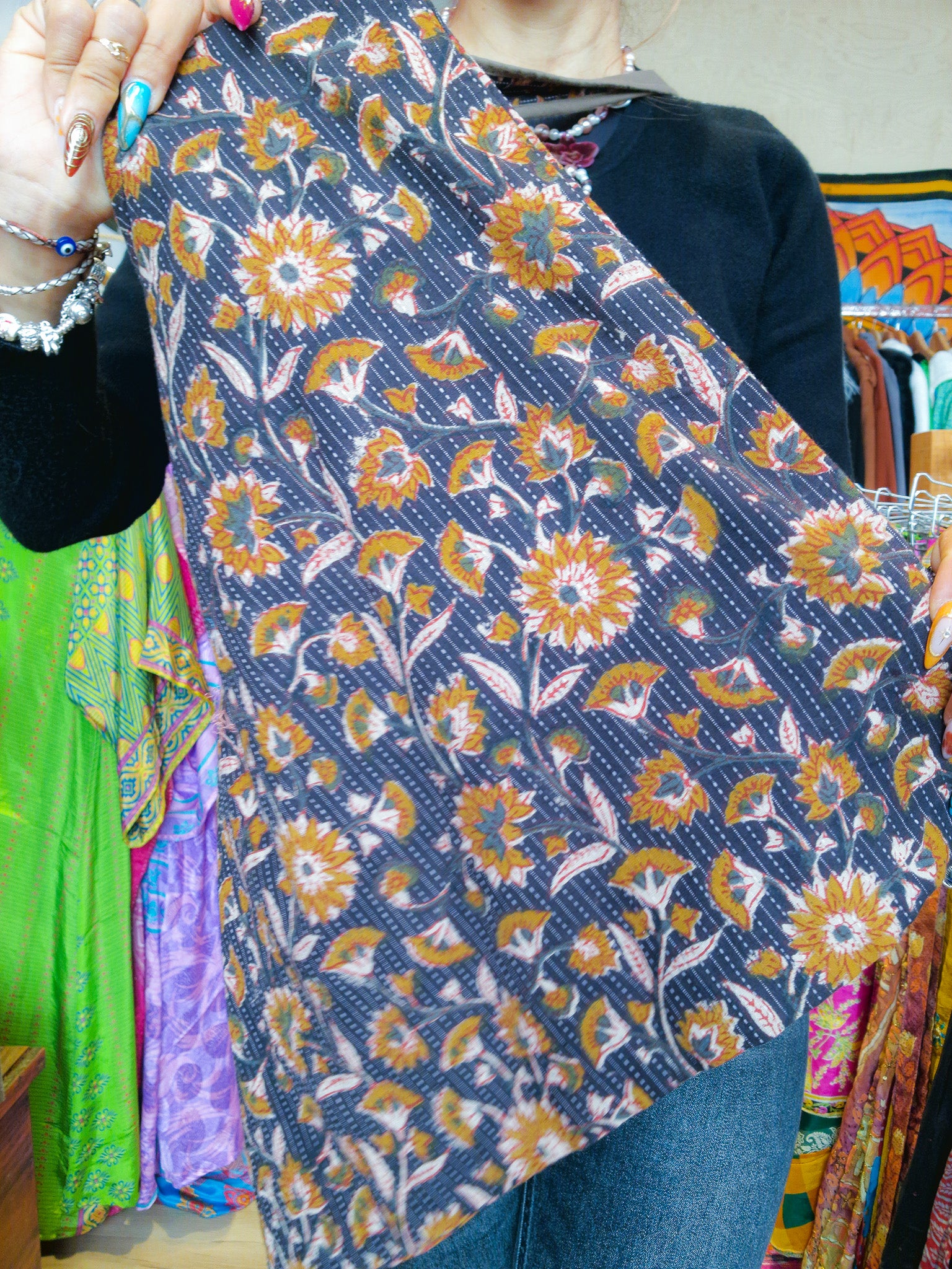 I sari, tessuti di seta, sono scelti con cura uno a uno. I loro motivi sono unici e irripetibili, il che rende ogni capo unico.