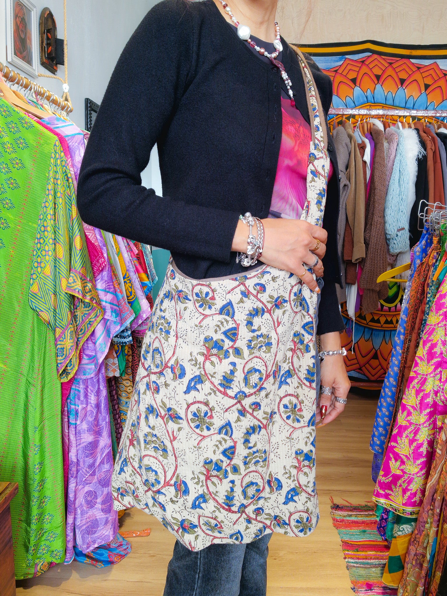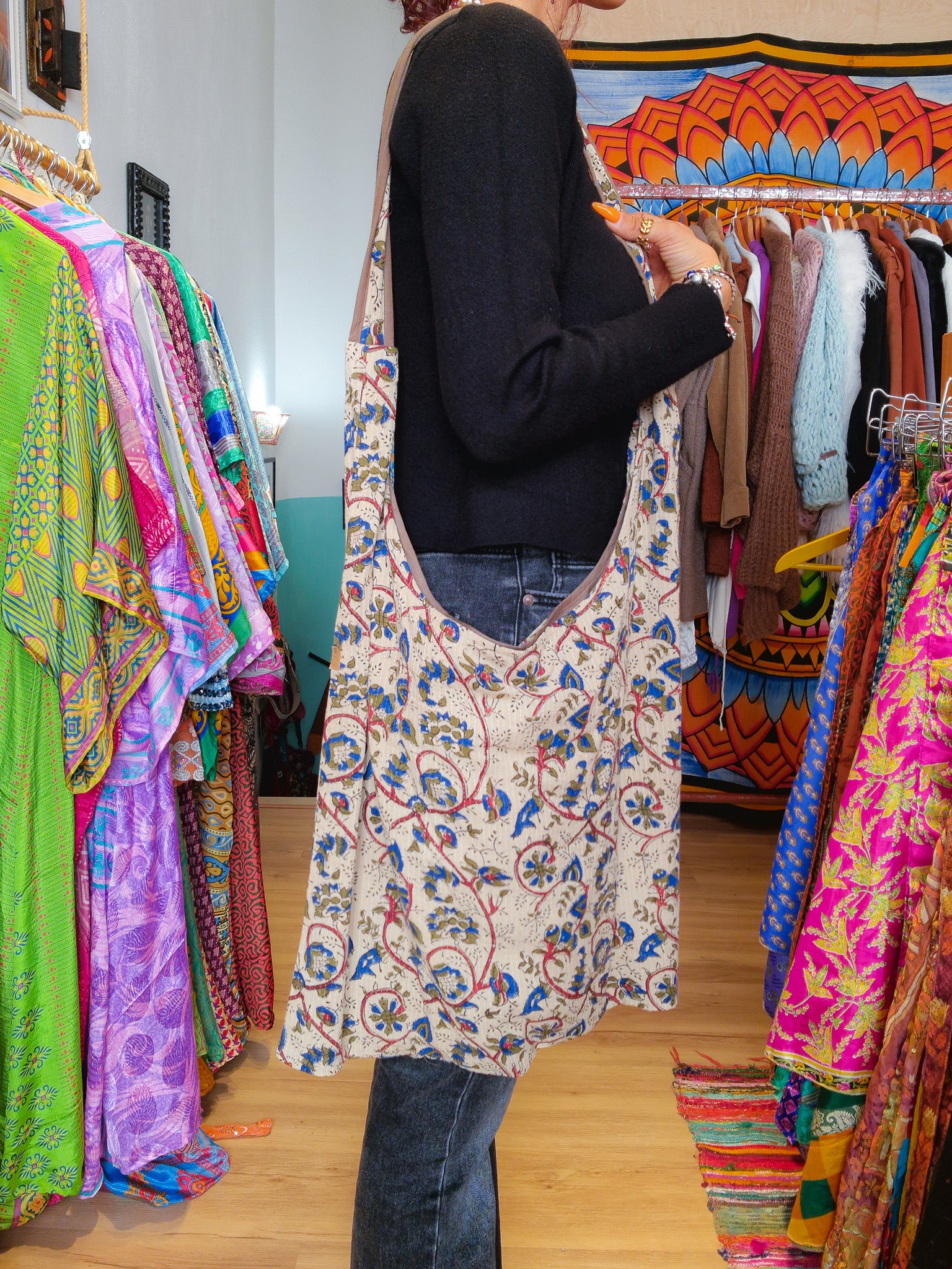 La Tote bag Étnica in cotone è una borsa artigianale realizzata con la tradizionale tecnica della stampa a blocchi, un metodo ancestrale di stampa manuale che utilizza blocchi di legno intagliati a mano.