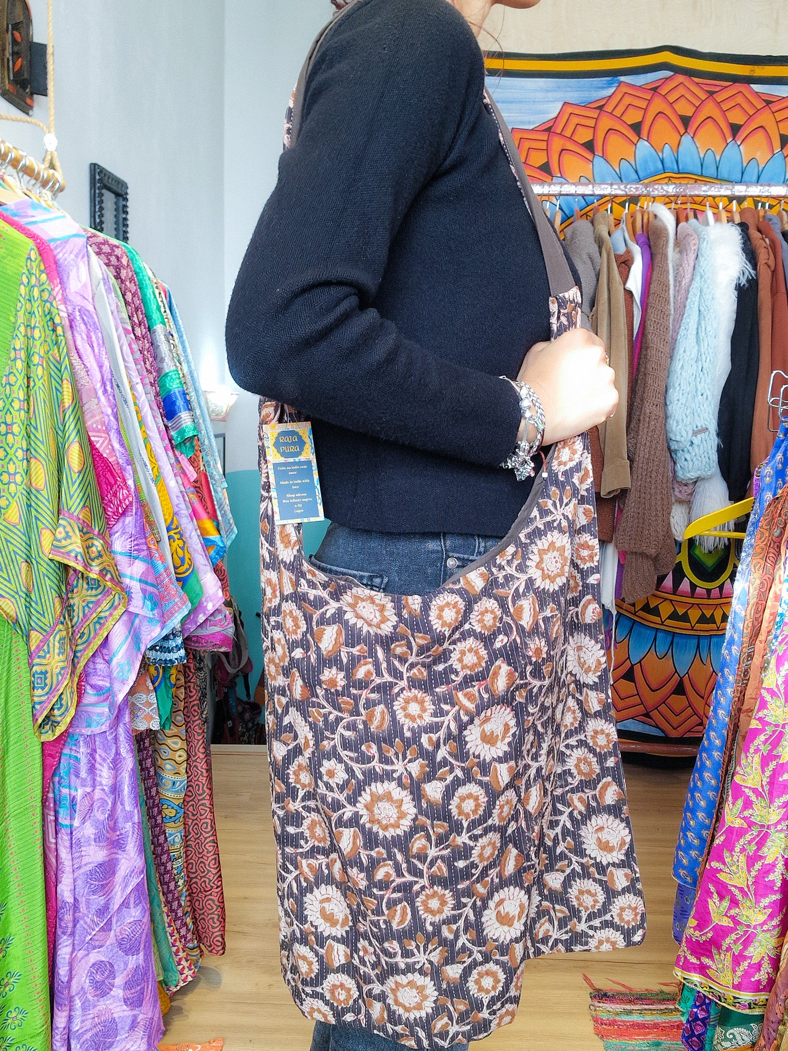 La Borsa a mano Étnica in cotone è una borsa artigianale realizzata con la tradizionale tecnica della stampa a blocchi, un metodo ancestrale di stampa manuale che utilizza blocchi di legno intagliati a mano.
