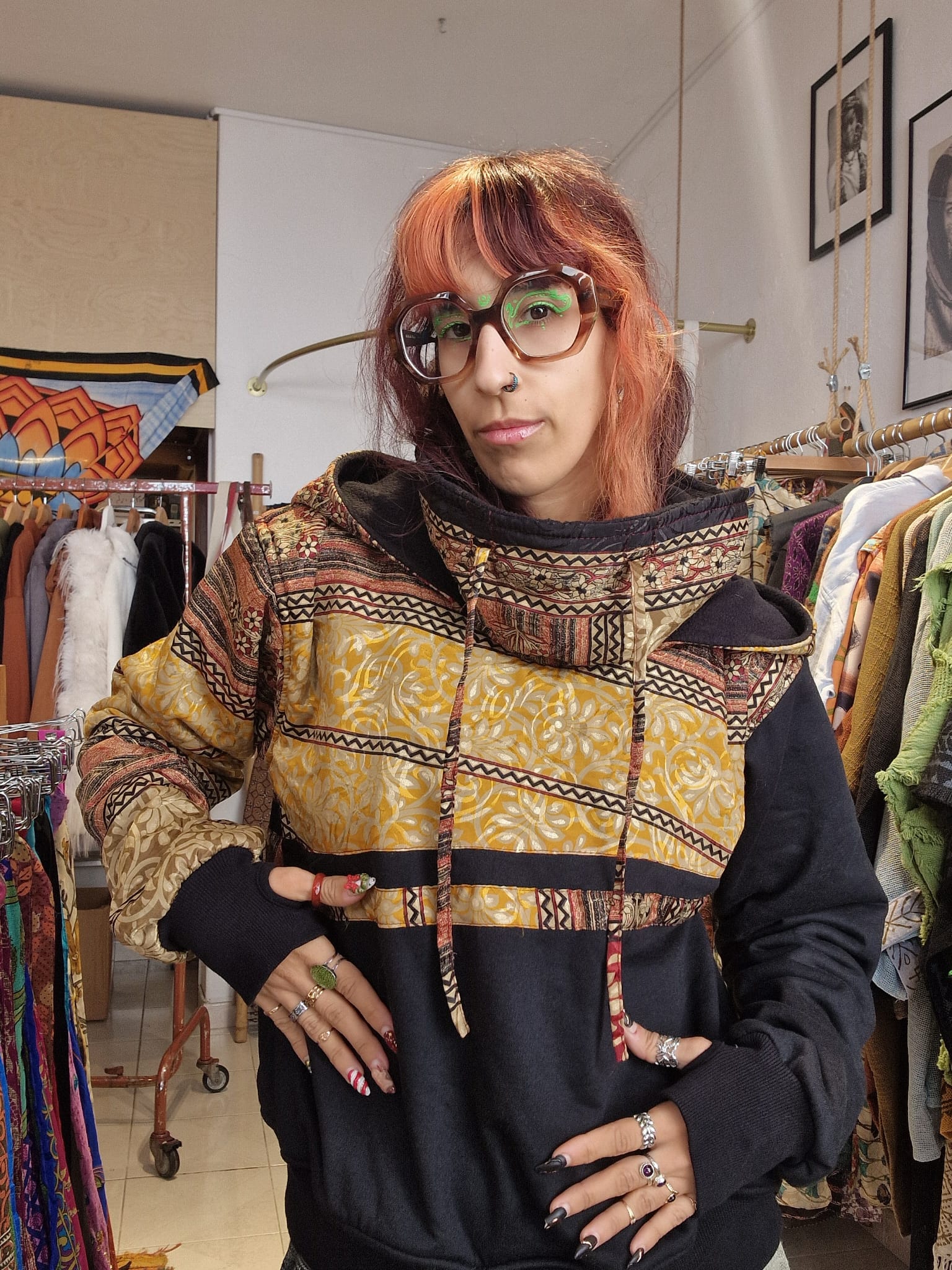 Ogni capo utilizza sari riciclato - tessuti di seconda mano scelti singolarmente - combinato con cotone cardato all’esterno e fodera in tessuto pile che offre morbidezza e isolamento termico.