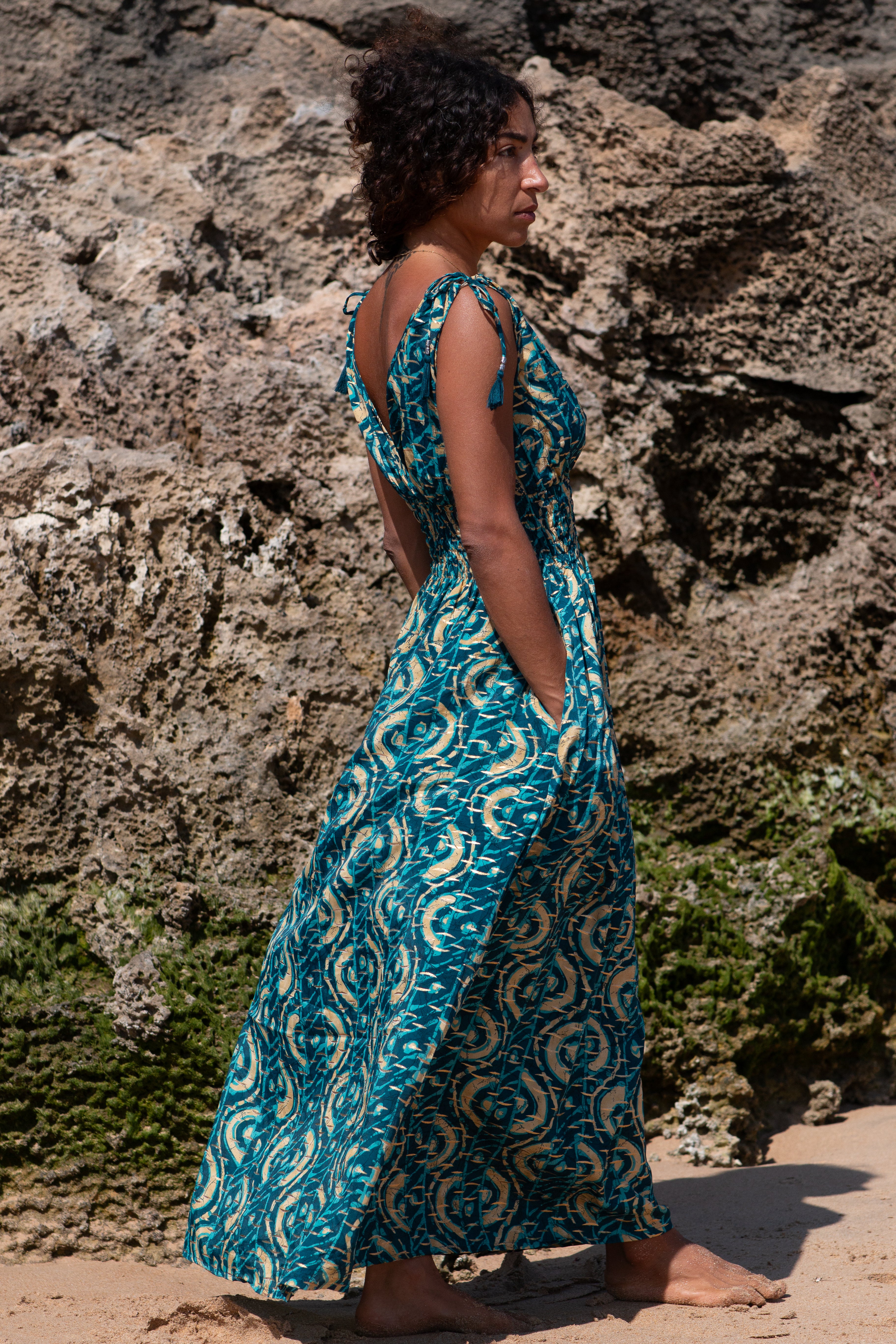 Vestito fluido in Sari riciclato, pensato per abbracciare corpi tra la taglia 36 e 40 con libertà e comodità.