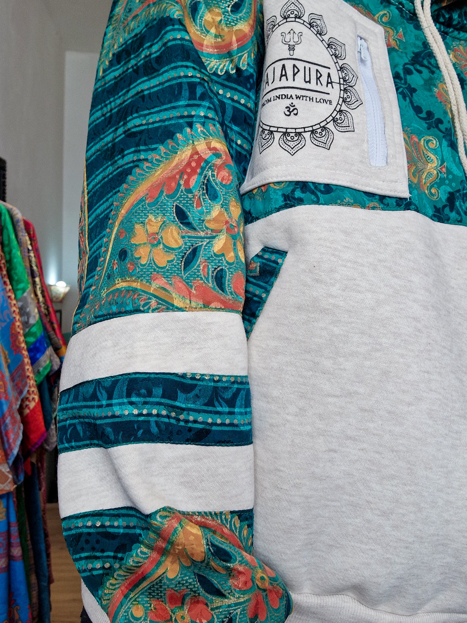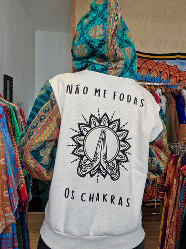 Creata per chi vive con atteggiamento e non abbassa mai la vibrazione, questa felpa unisce cotone confortevole a maniche in Sari riciclato, rendendo ogni modello assolutamente unico. Non ce ne sono due uguali!