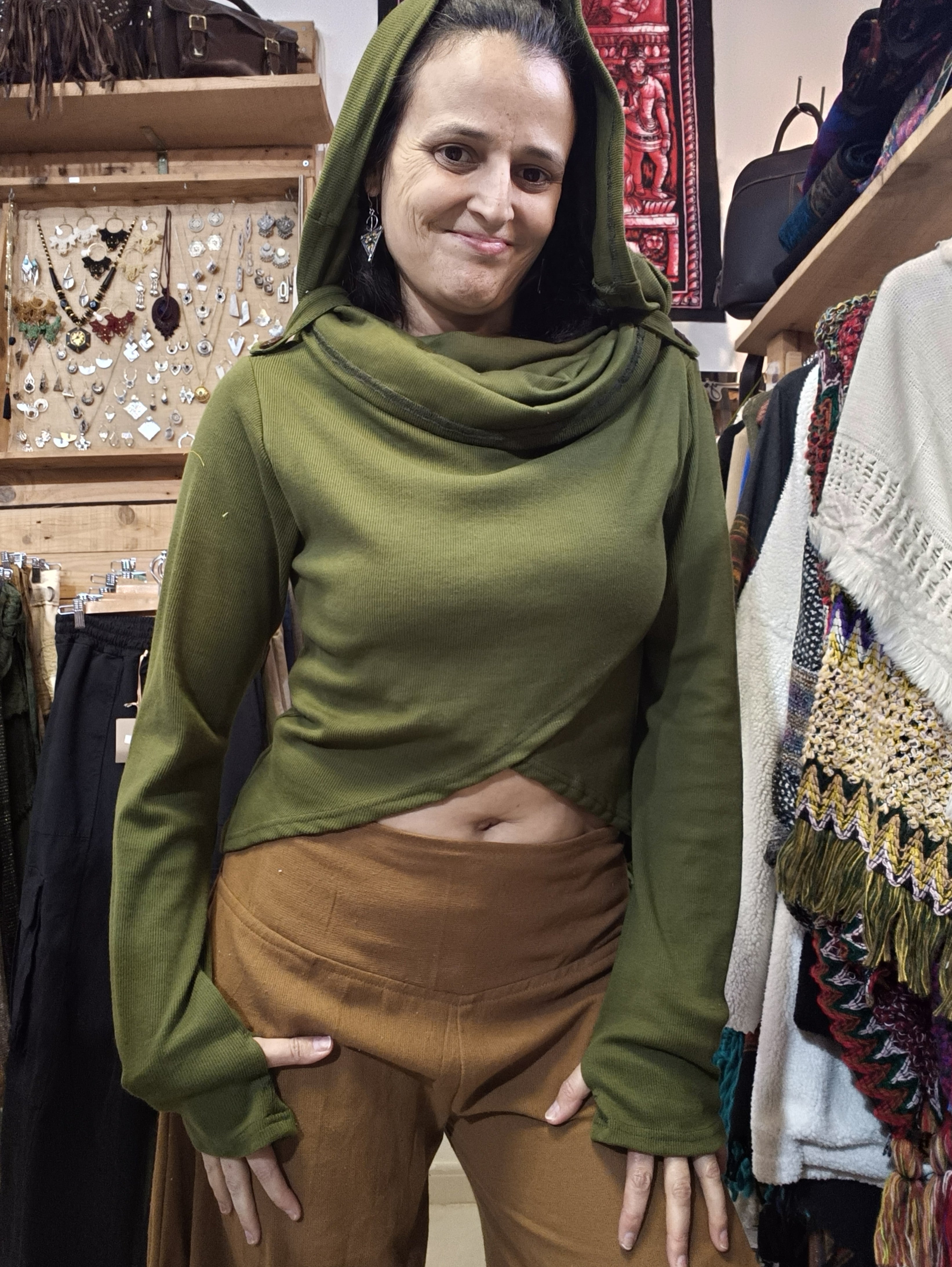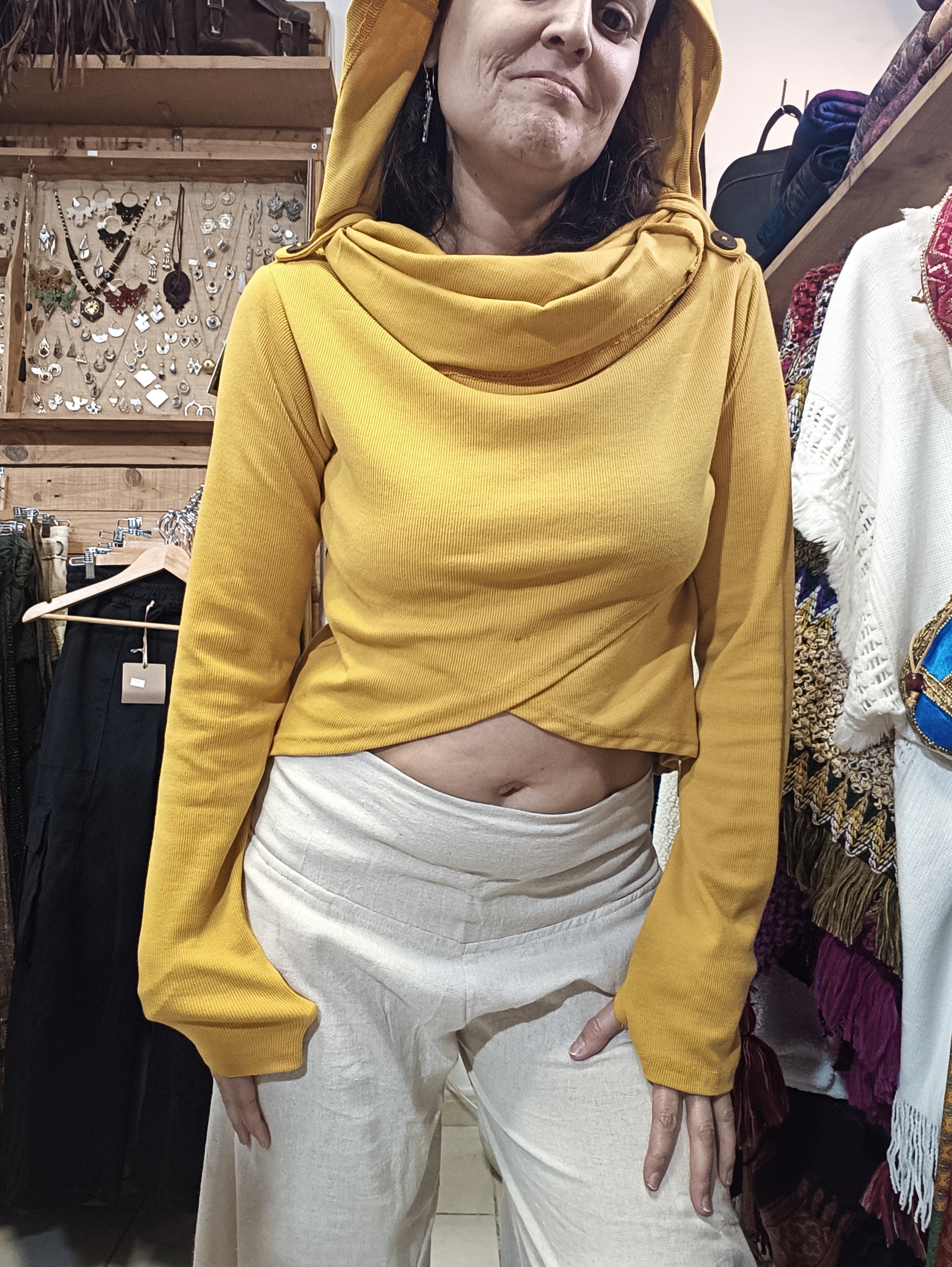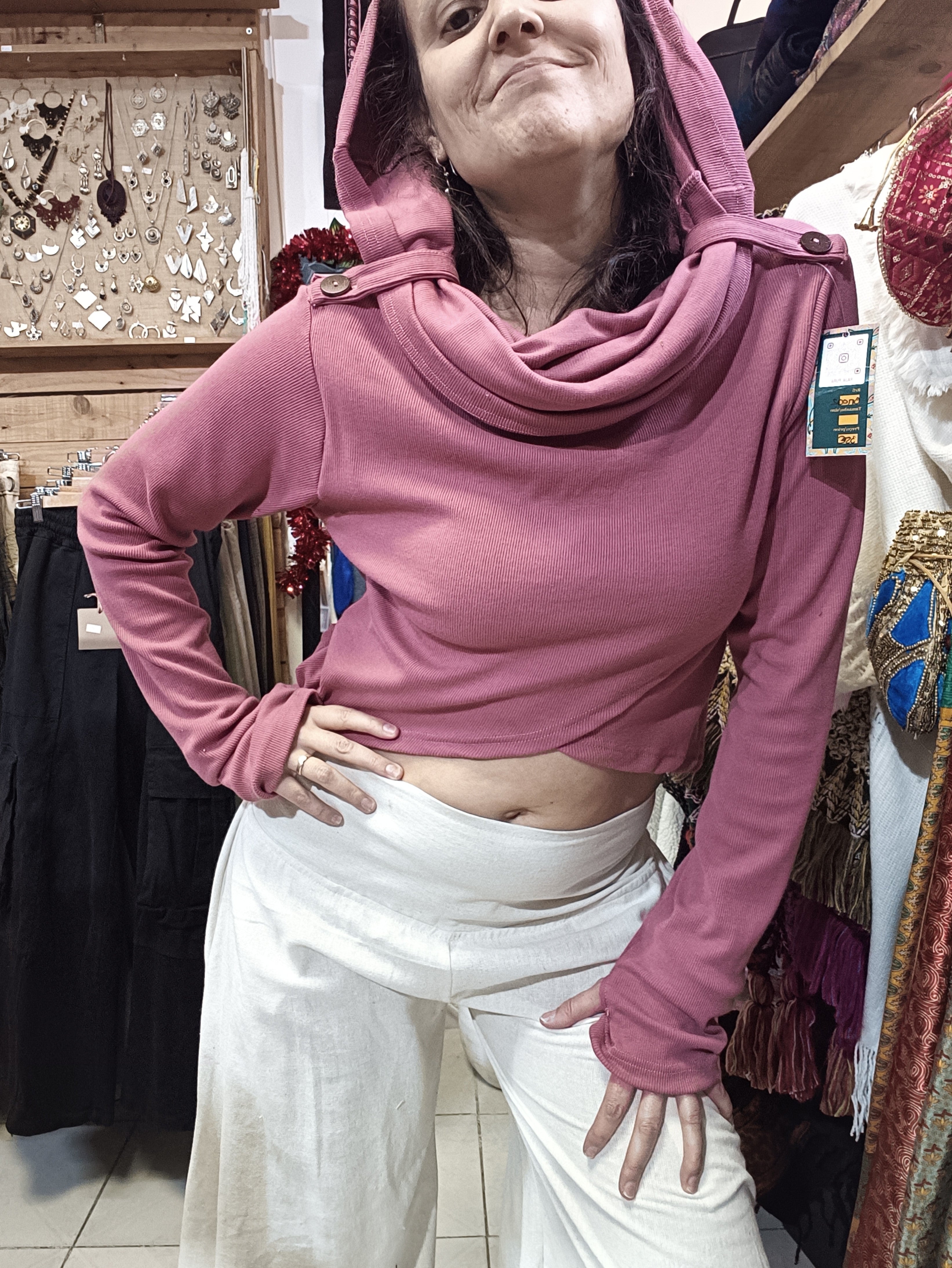 Blusa em algodão rib com capuz oversized que funciona como gola, conferindo um toque étnico e singular à peça. Design cruzado na região frontal com aberturas para o polegar na manga, proporcionando conforto e funcionalidade. Tamanho único com elasticidade que se adapta do 36 ao 40, garantindo um ajuste versátil e elegante para diferentes silhuetas.