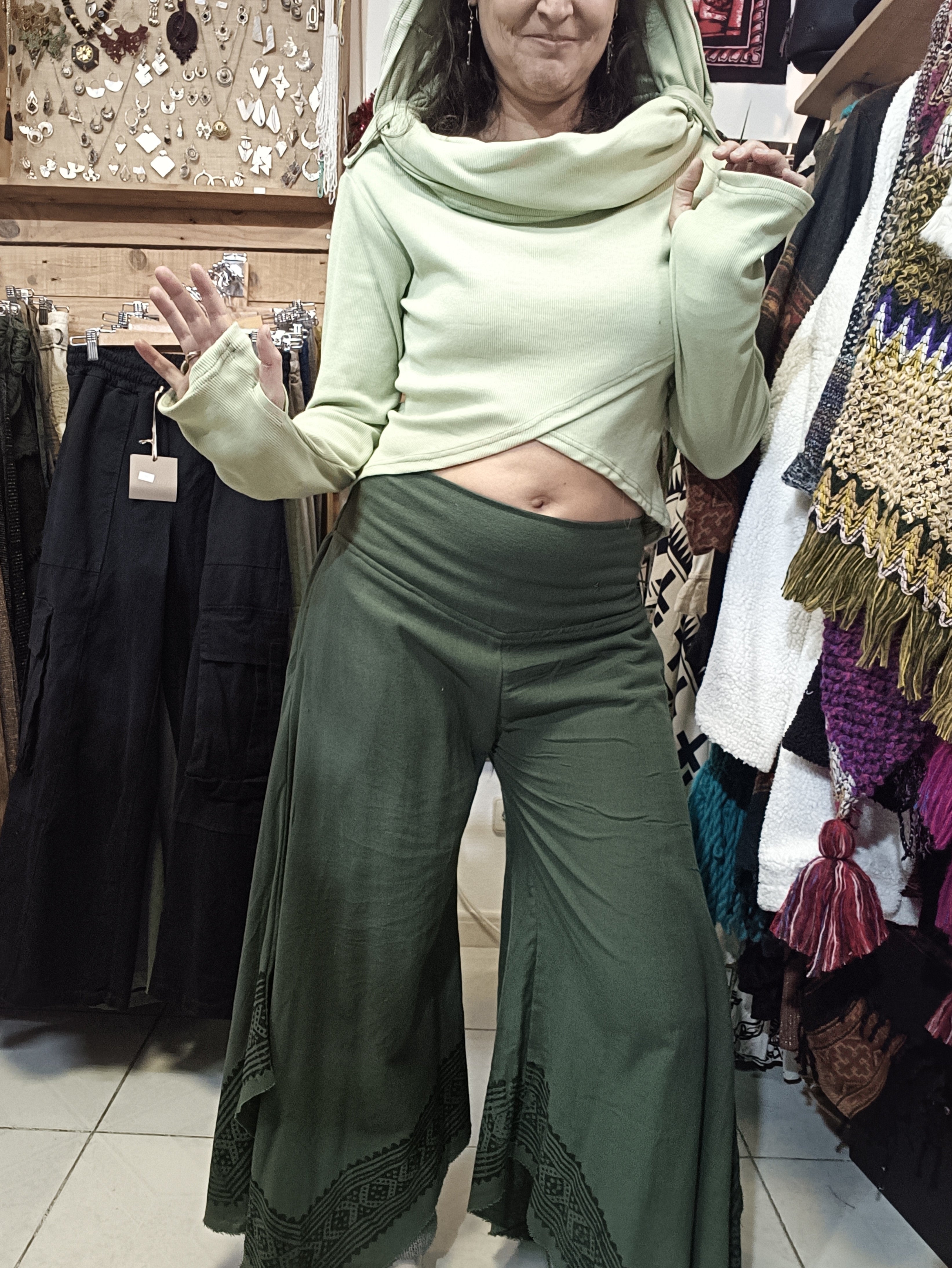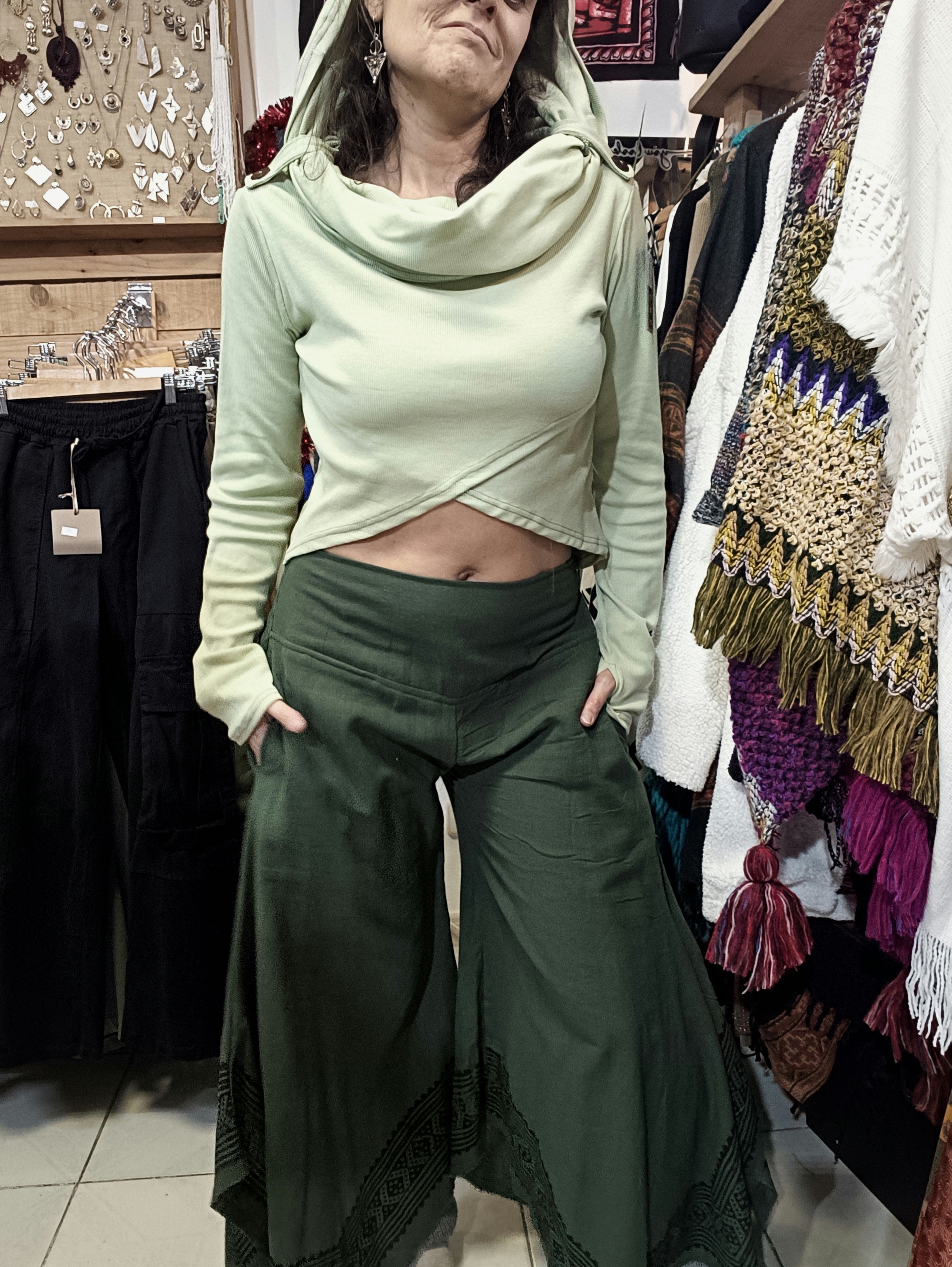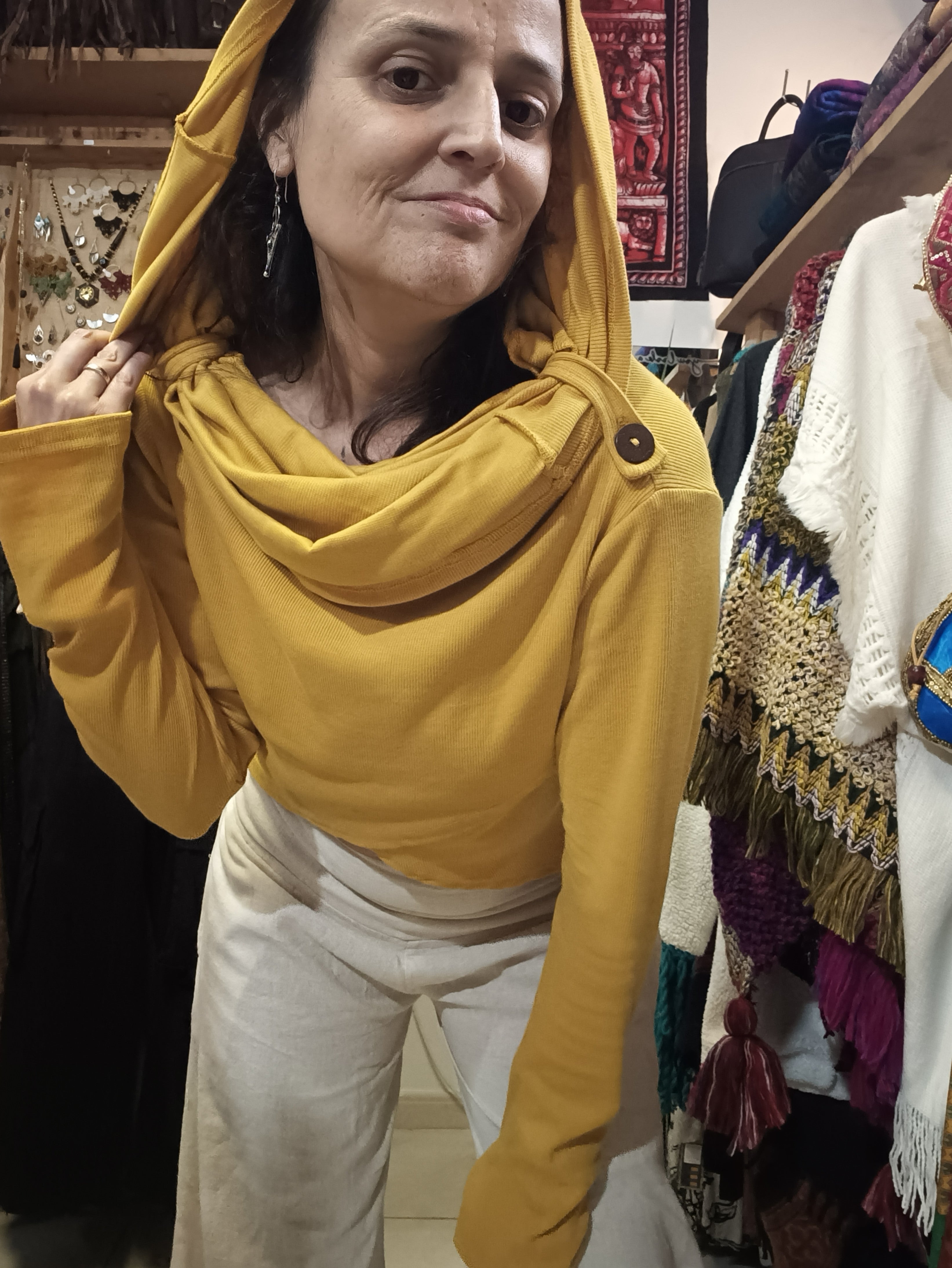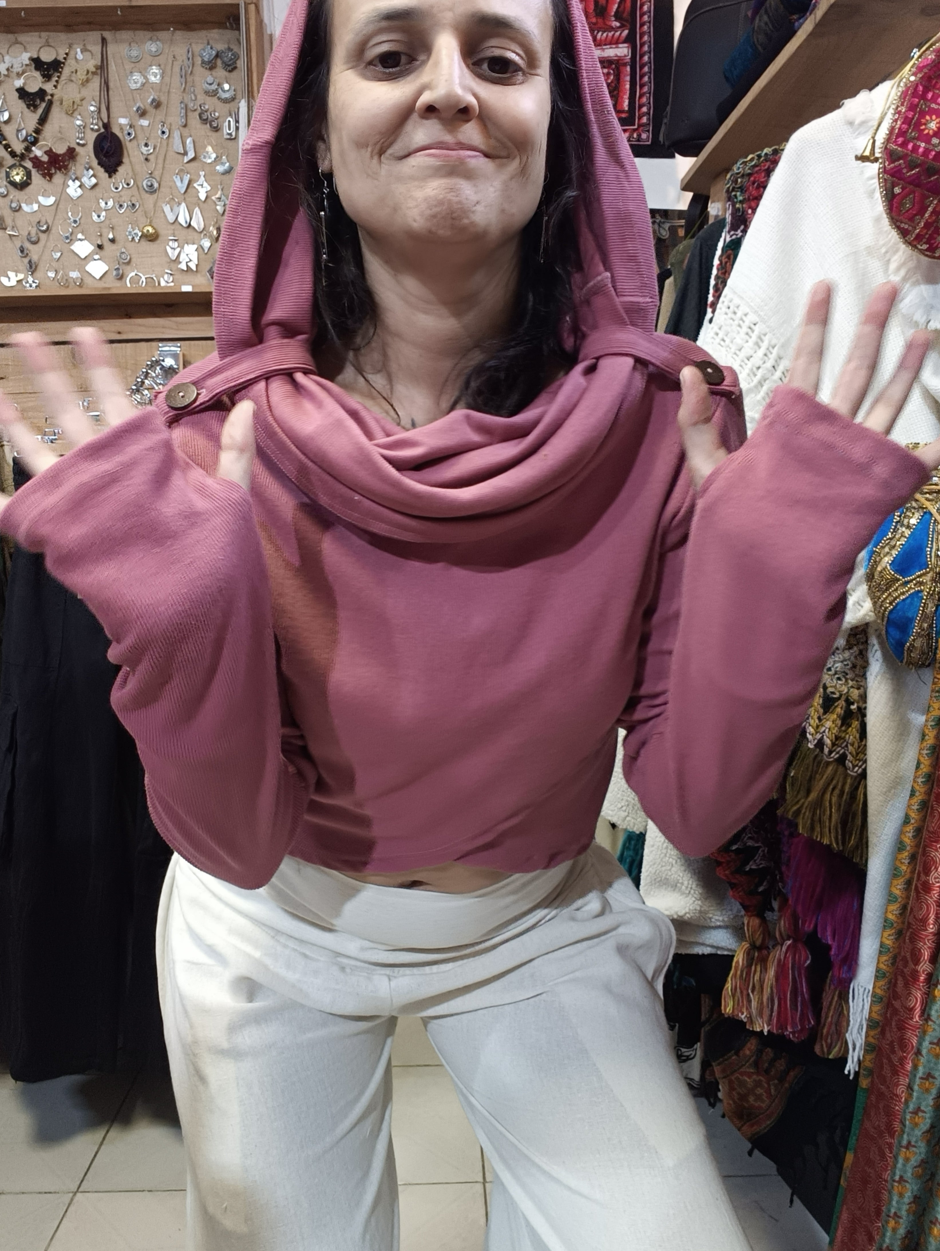 Blusa em algodão rib com capuz oversized que funciona como gola, conferindo um toque étnico e singular à peça. Design cruzado na região frontal com aberturas para o polegar na manga, proporcionando conforto e funcionalidade. Tamanho único com elasticidade que se adapta do 36 ao 40, garantindo um ajuste versátil e elegante para diferentes silhuetas.