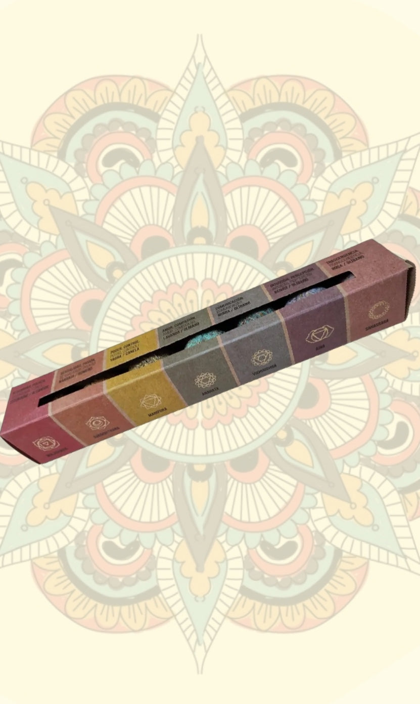 • 7 Chakras: Vermelho - Storak e Cânfora; Laranja - Laranja e Alecrim; Amarelo - Yagra e Canela; Verde - Lavanda e Frankincense; Roxo - Benjoim e Frankincense; Rosa - Rosa e Frankincense.