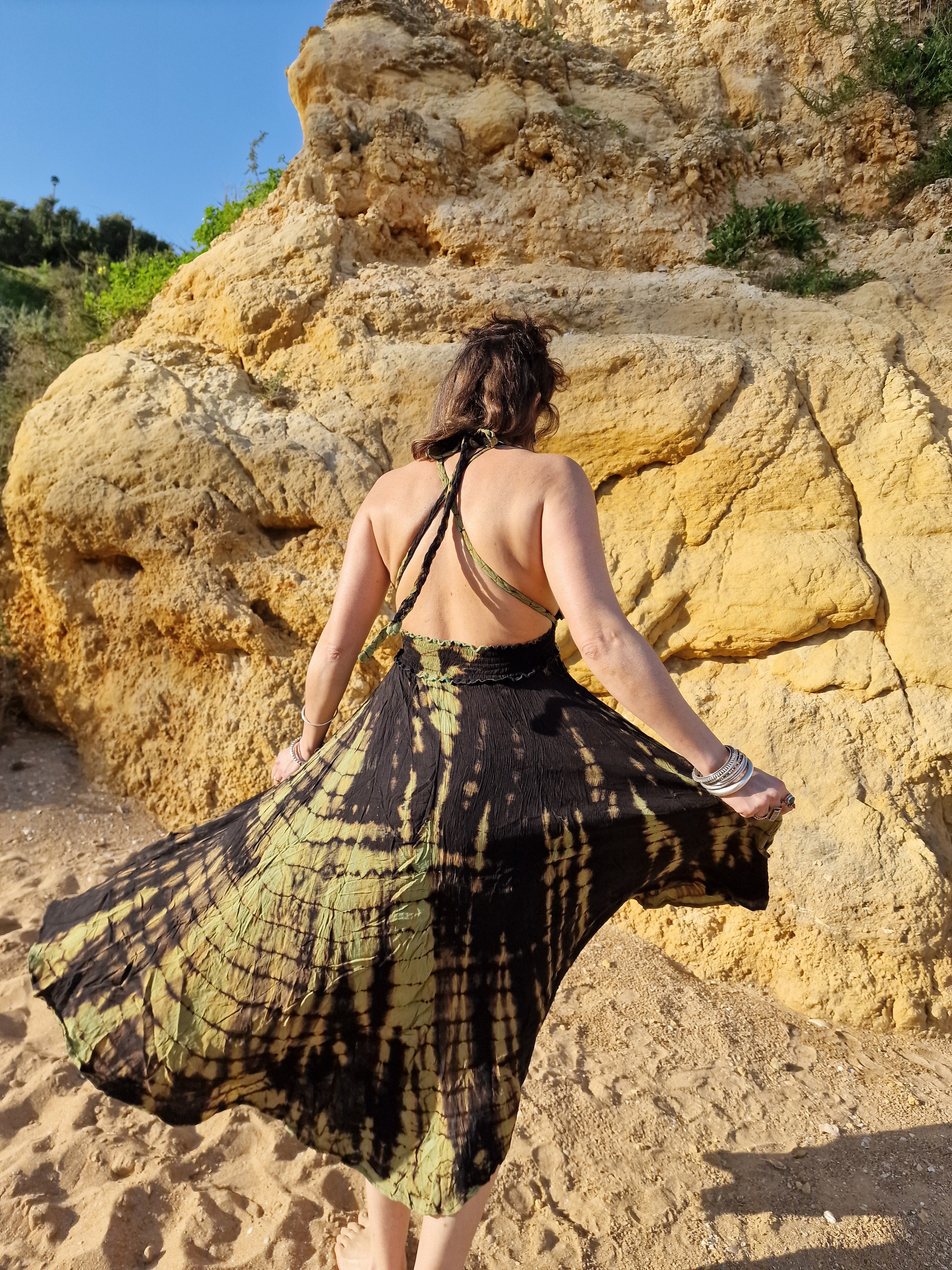 Cada peça é criada através da técnica artesanal tie dye, o que faz com que nenhum vestido seja exatamente igual a outro. As variações no padrão tornam cada peça única.